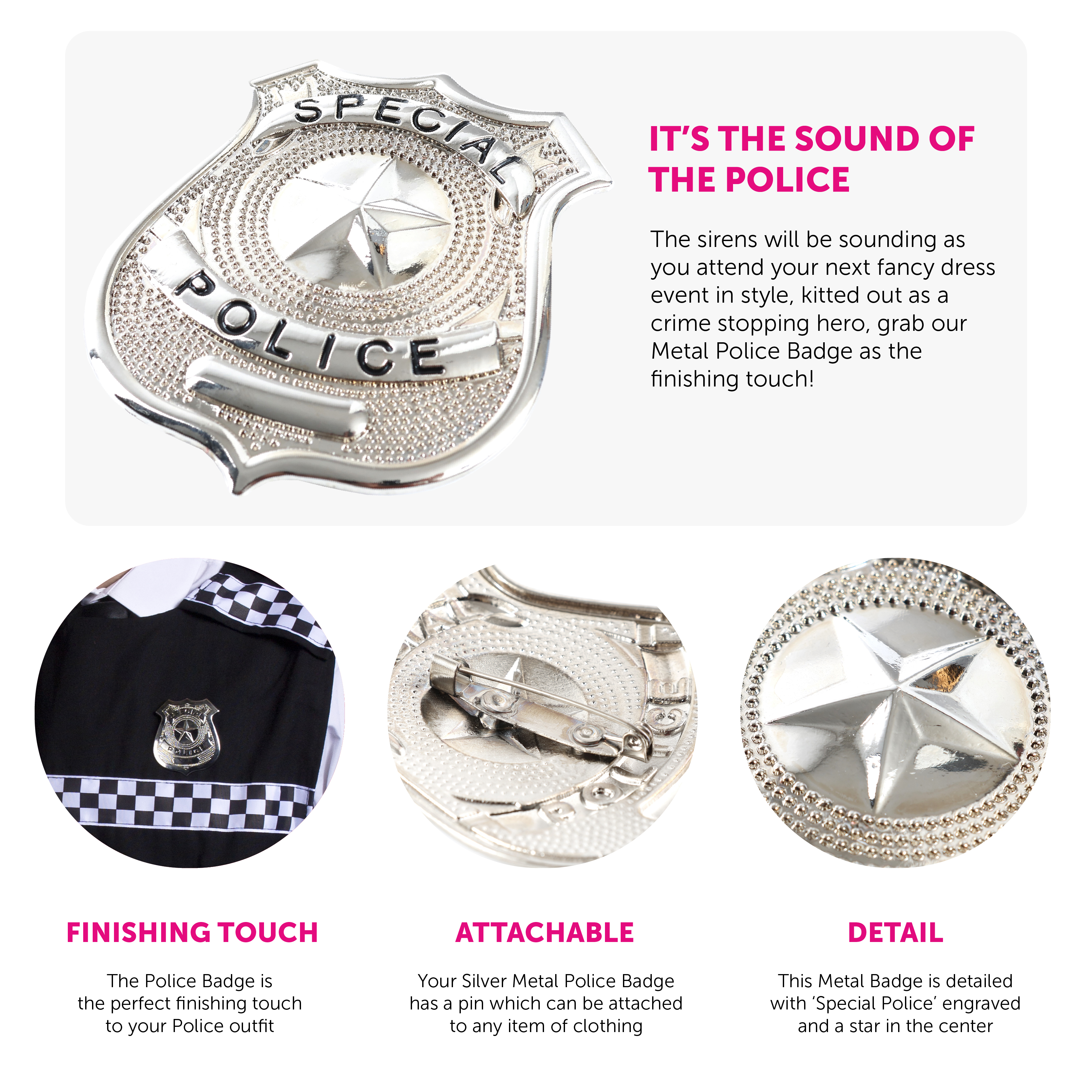 POLICE BADGE DETAILS: The Police Badge is a quality silver, metal pin badge with a large star and 'Special Police' on the front, a great addition to your existing Police Costume!