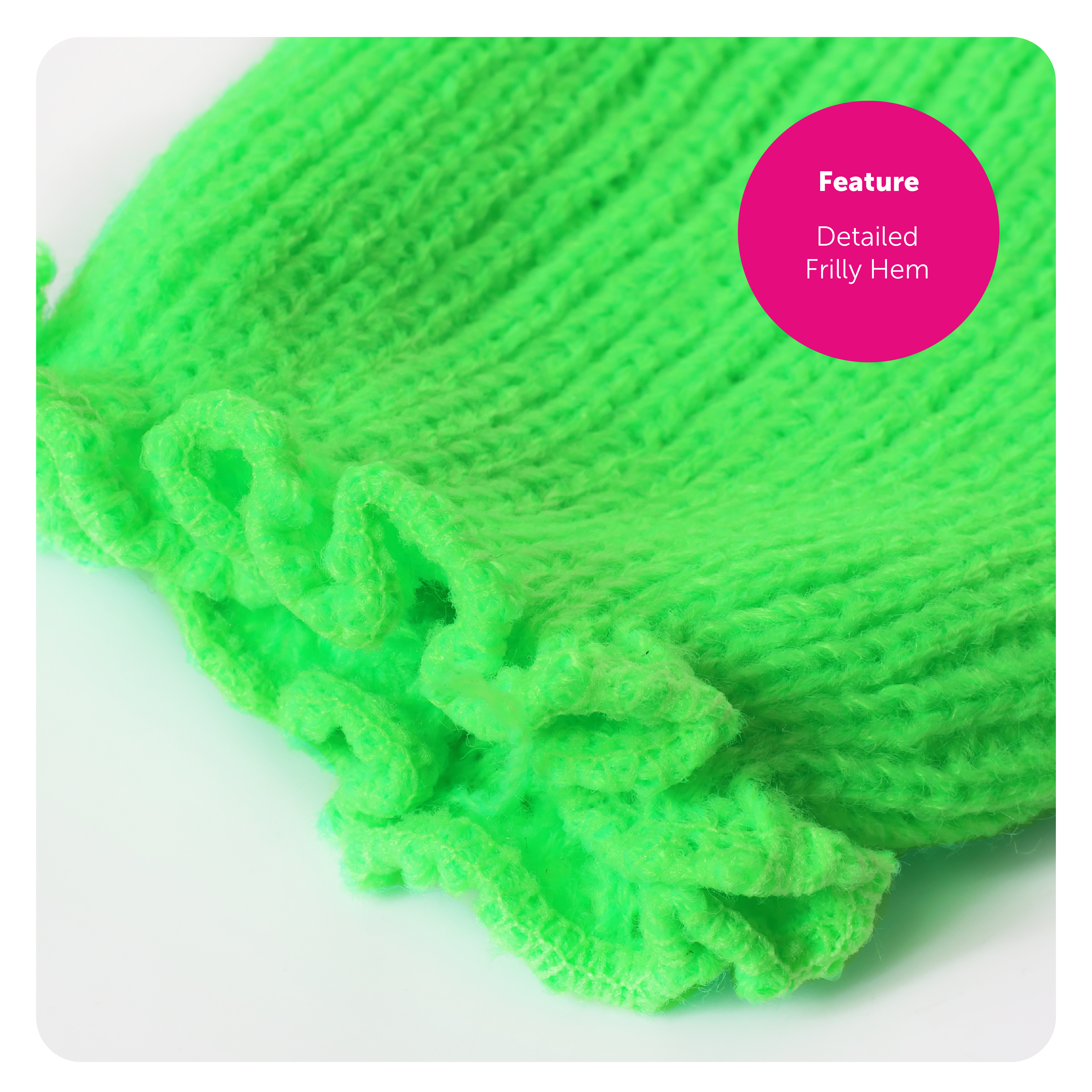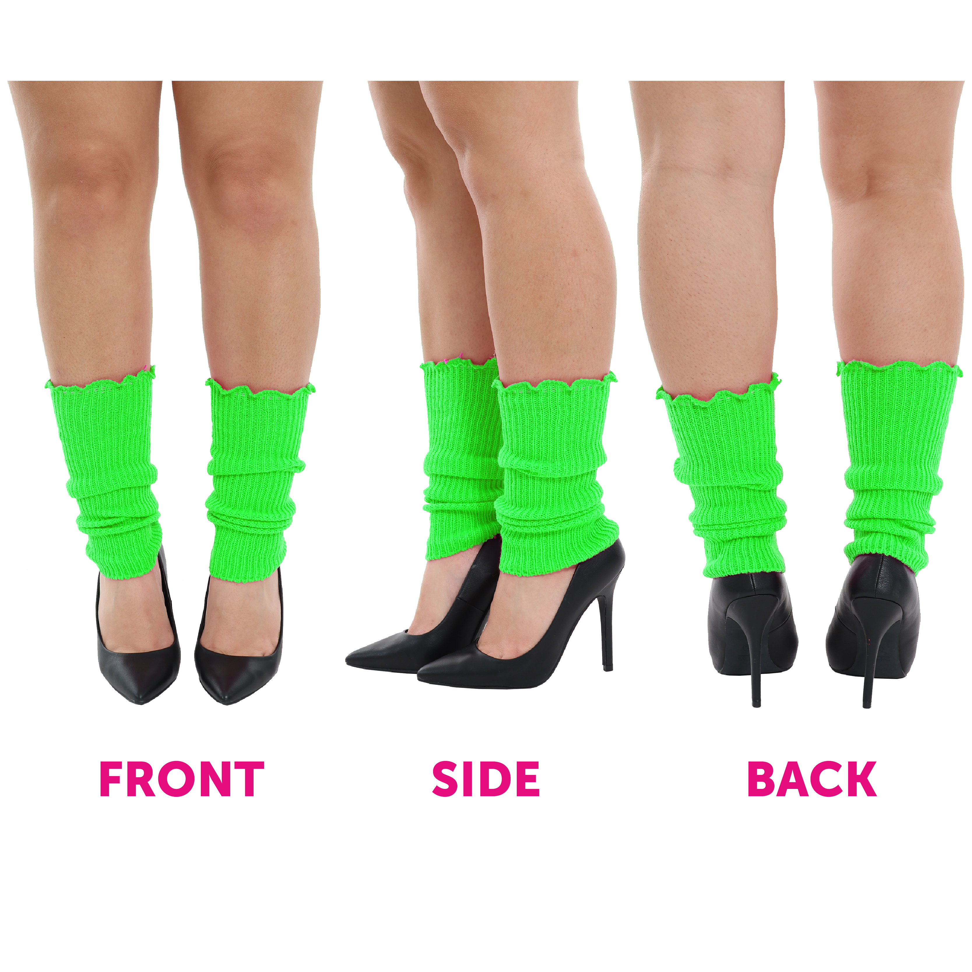 LEG WARMER DETAILS: Your Ladies Leg Warmers are a pair of elasticated, ribbed Neon Green Leg Warmers with subtle frilled edges, the perfect addition to any 80's outfit!