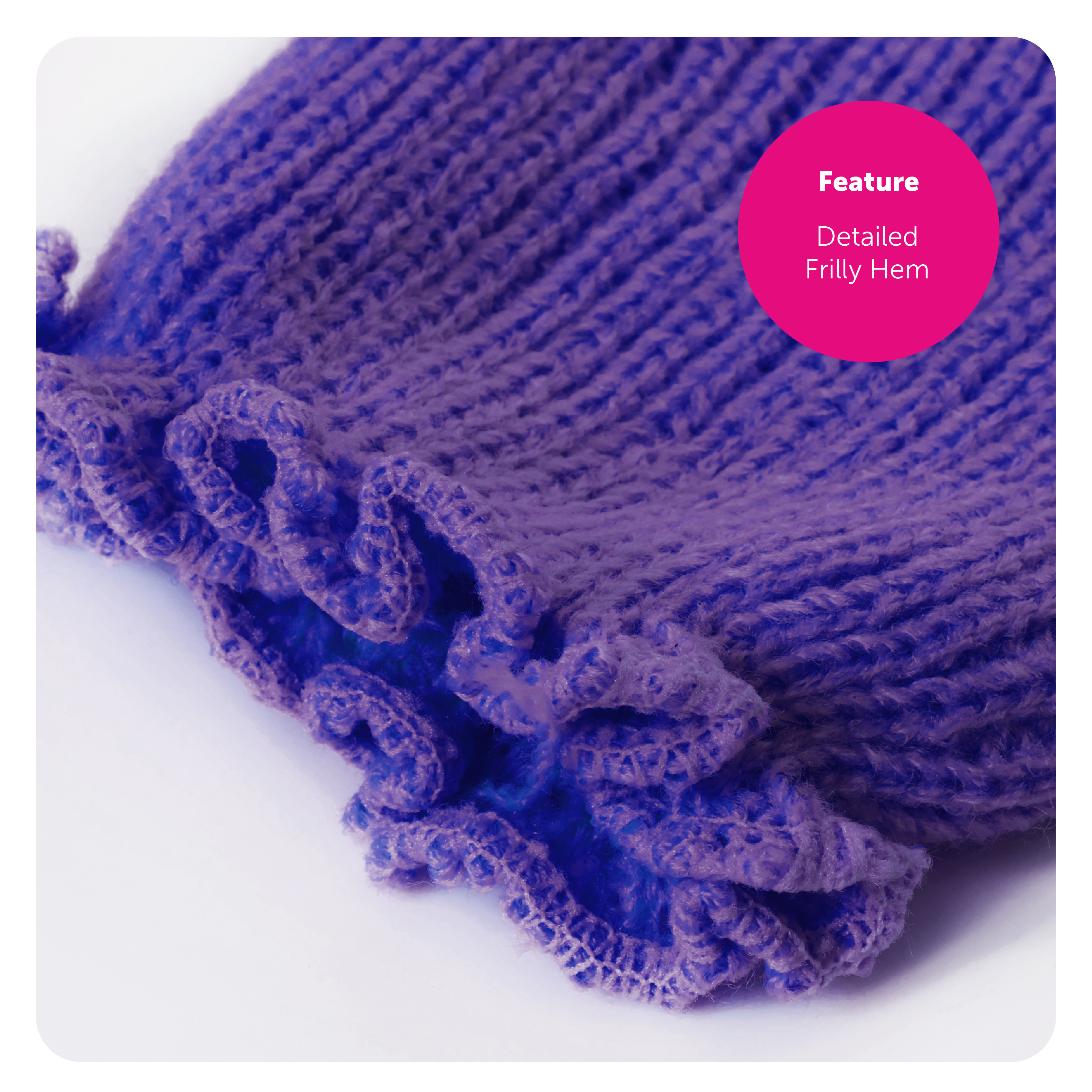LEG WARMER DETAILS: Your Ladies Leg Warmers are a pair of elasticated, ribbed Purple Leg Warmers with subtle frilled edges, the perfect addition to any 80's outfit!