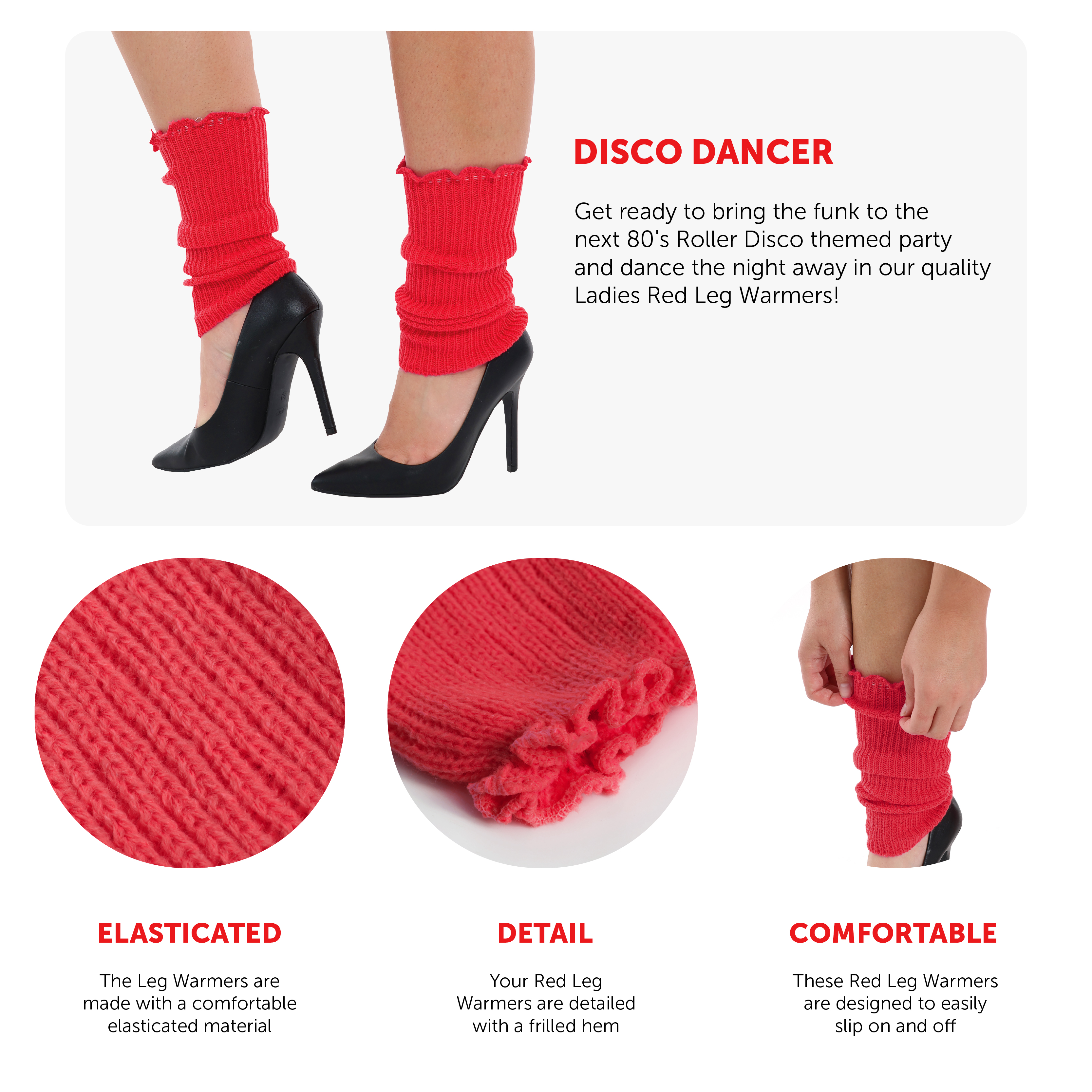 PERFECT FOR 80'S THEMED FANCY DRESS: Whether you're attending an 80's themed Fancy Dress Party, a Roller Disco, or a festival be sure to finish off your outfit with our Ladies Red Leg Warmers!