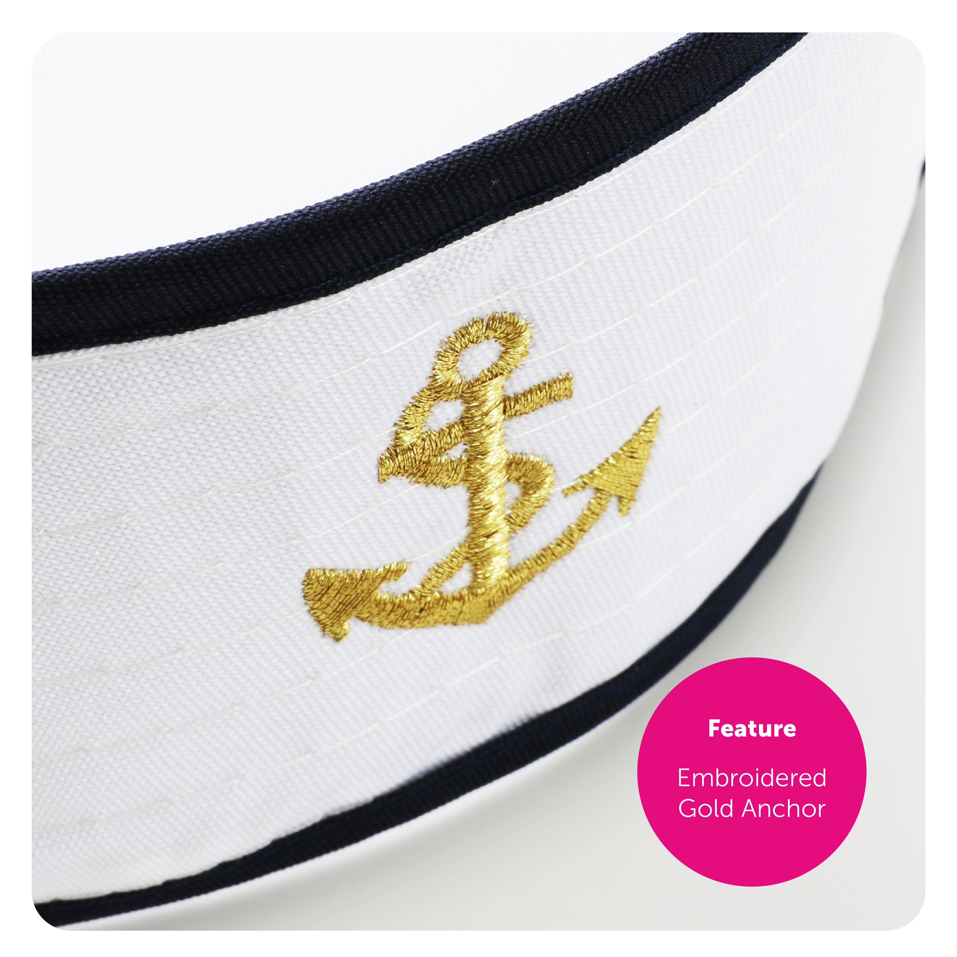 SAILOR SET DETAILS: This Sailor Costume Accessory Set includes a White Sailor Hat with Navy Blue edges and a Golden Embroidered Anchor on the front, and a Navy and White Scarf with tie up fastening!