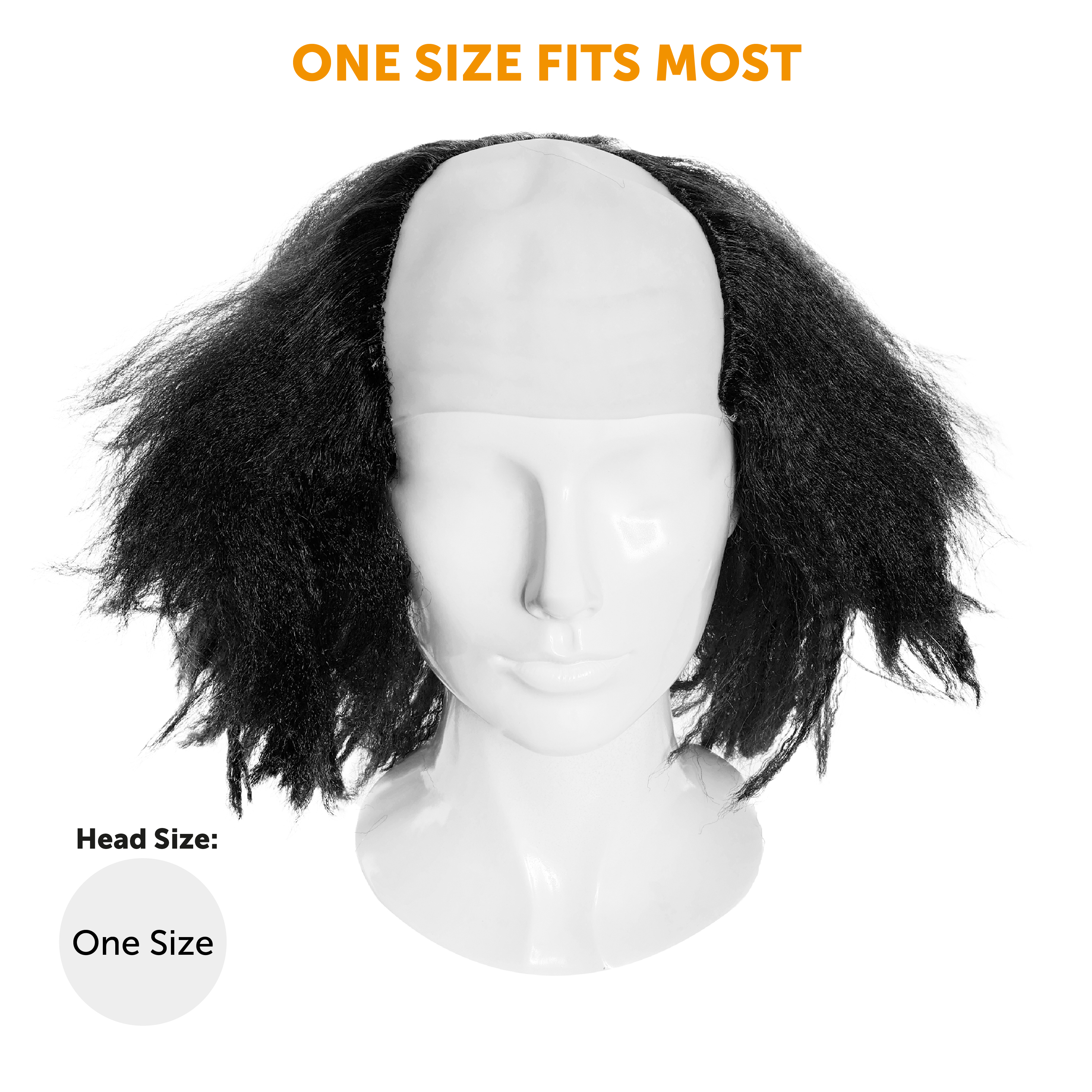 BLACK WIG BALD CAP DETAILS: Your Black Wig Bald Cap is a Bald Cap with crazy Black Hair flared out everywhere, a one size fits all Adults with comfort and ease to get chaotic all day without a problem!