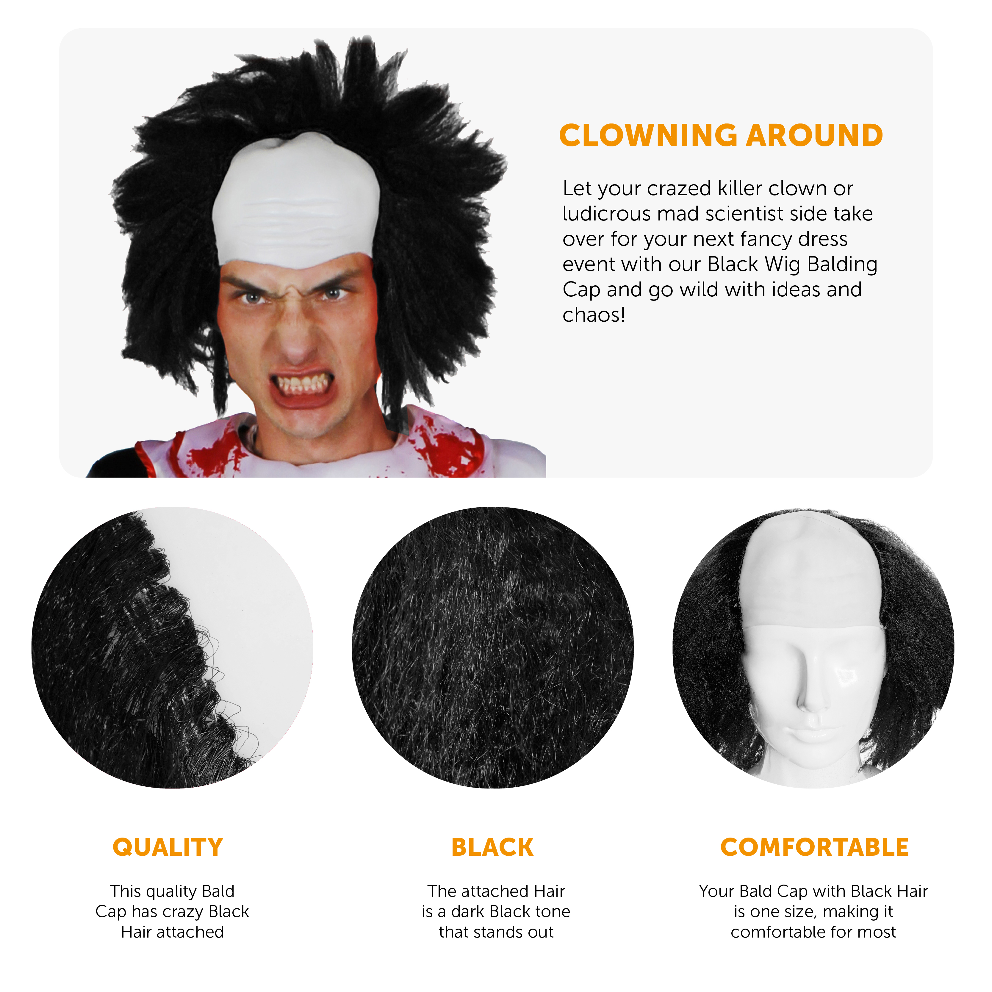 PERFECT FOR HALLOWEEN AND SCIENTIST FANCY DRESS: Whether you’re planning on becoming a scary Killer Clown for Halloween, or a Mad Scientist for any other occasion, then make sure you’re finishing up your look with our Black Wig Balding Cap!