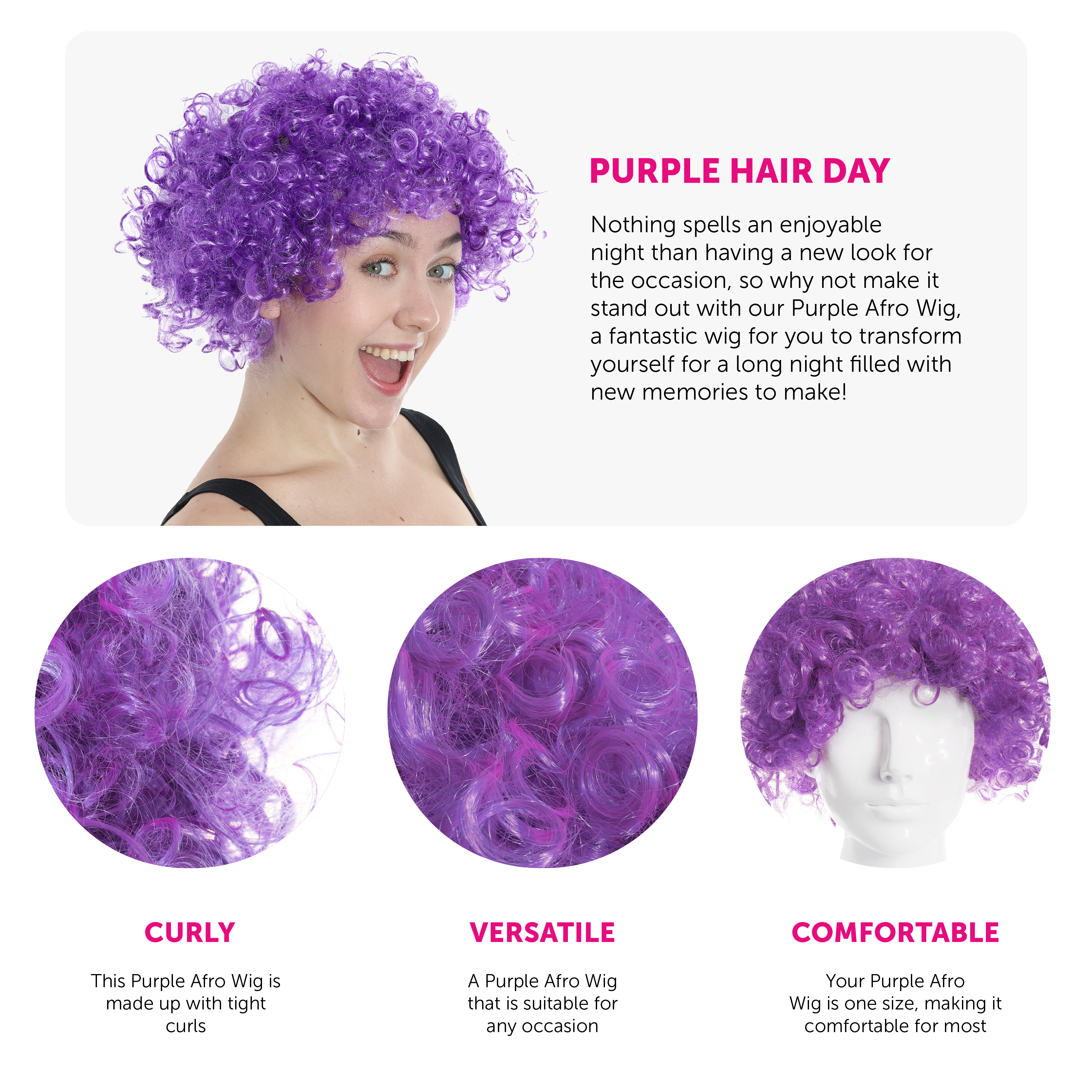 PURPLE AFRO WIG: Nothing spells an enjoyable night than having a new look for the occasion, so why not make it stand out with our Purple Afro Wig, a fantastic wig for you to transform yourself for a long night filled with new memories to make!