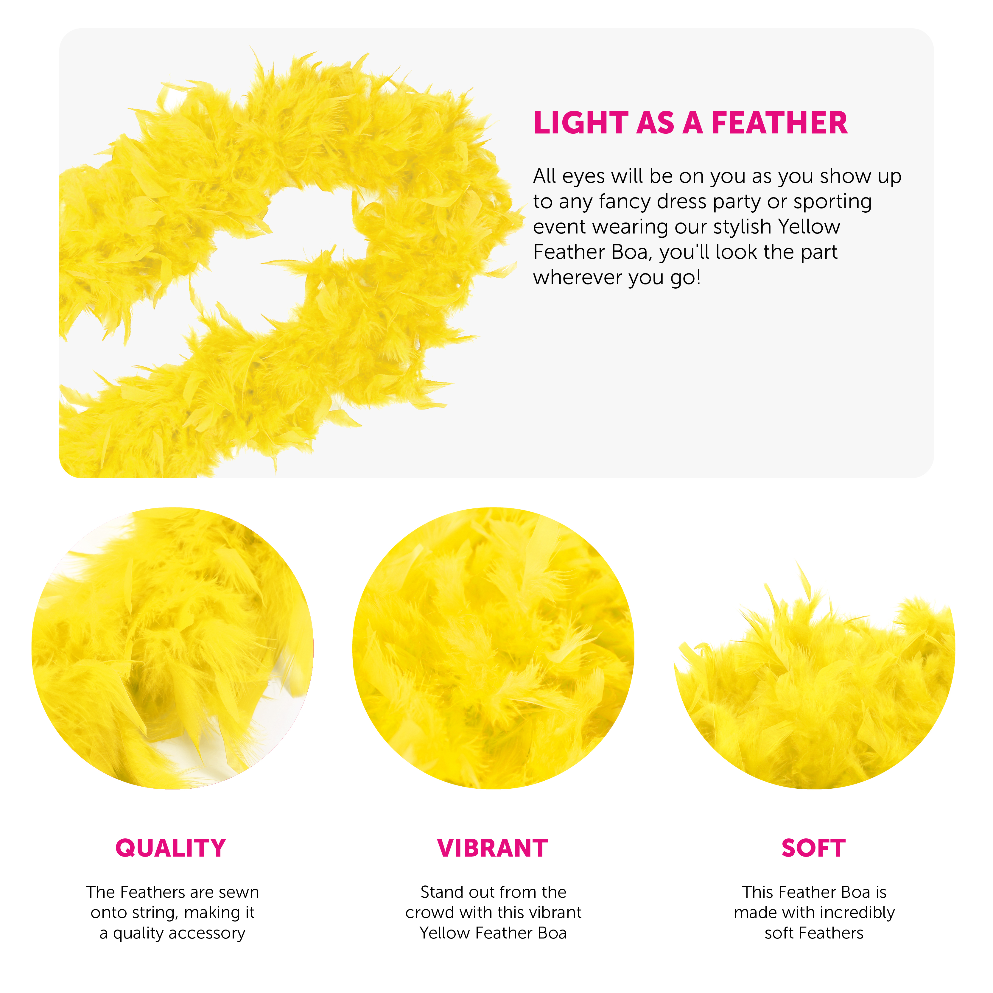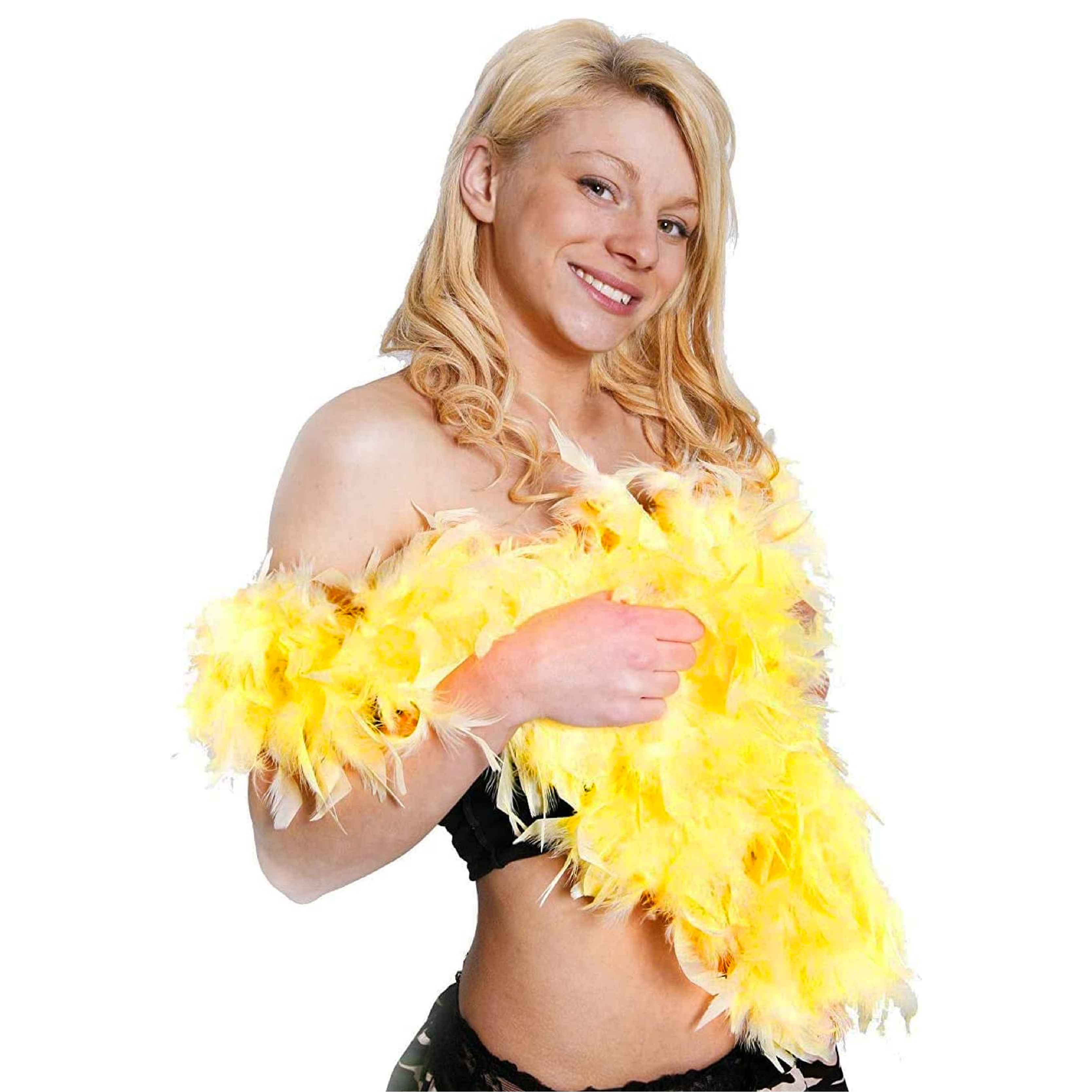 INCREDIBLY SOFT FEATHERS: Your Yellow Feather Boa is made with incredibly soft feathers sewn onto string - although the product is reusable, there may be some initial shedding, please shake the Feather Boa to rid of any loose feathers before wearing!
