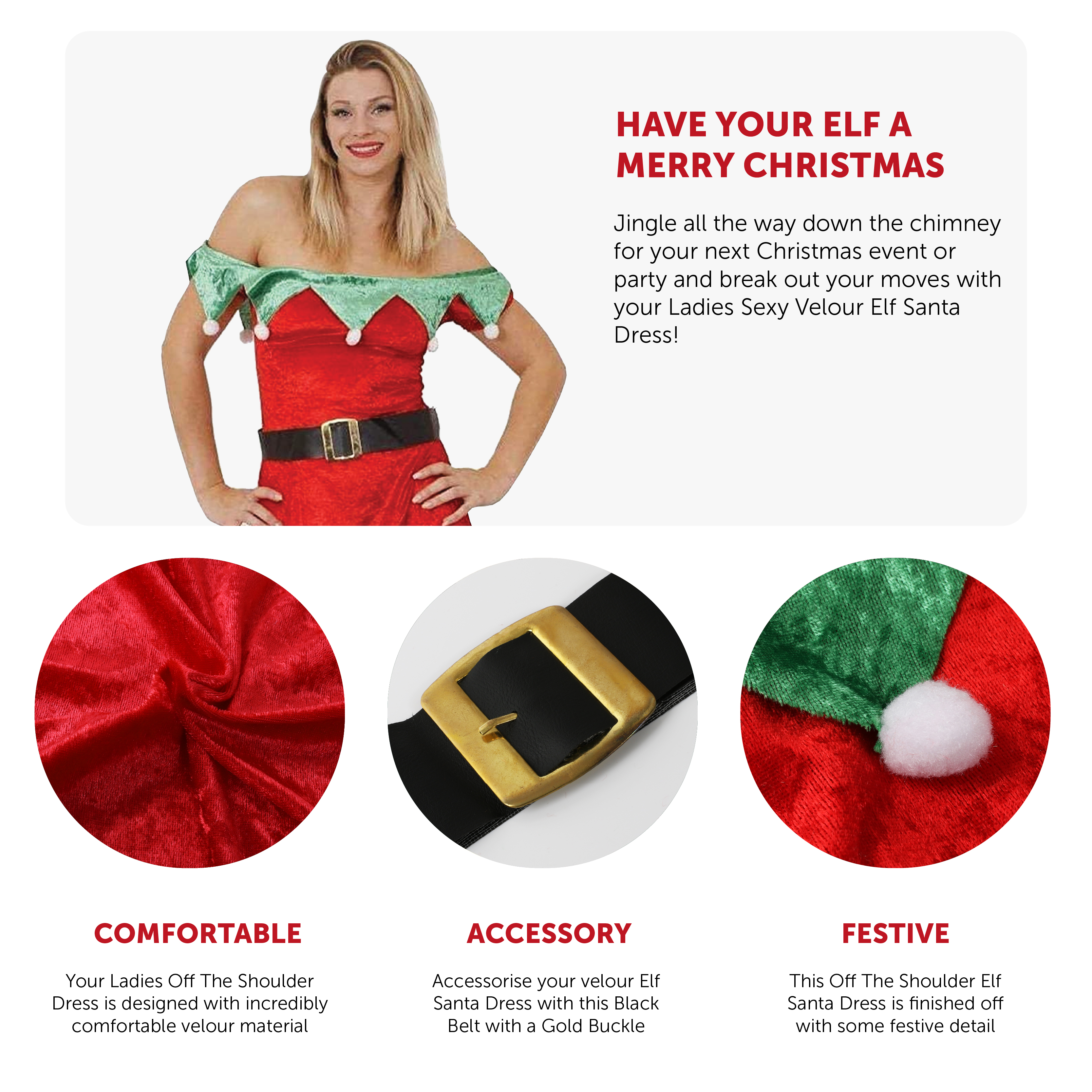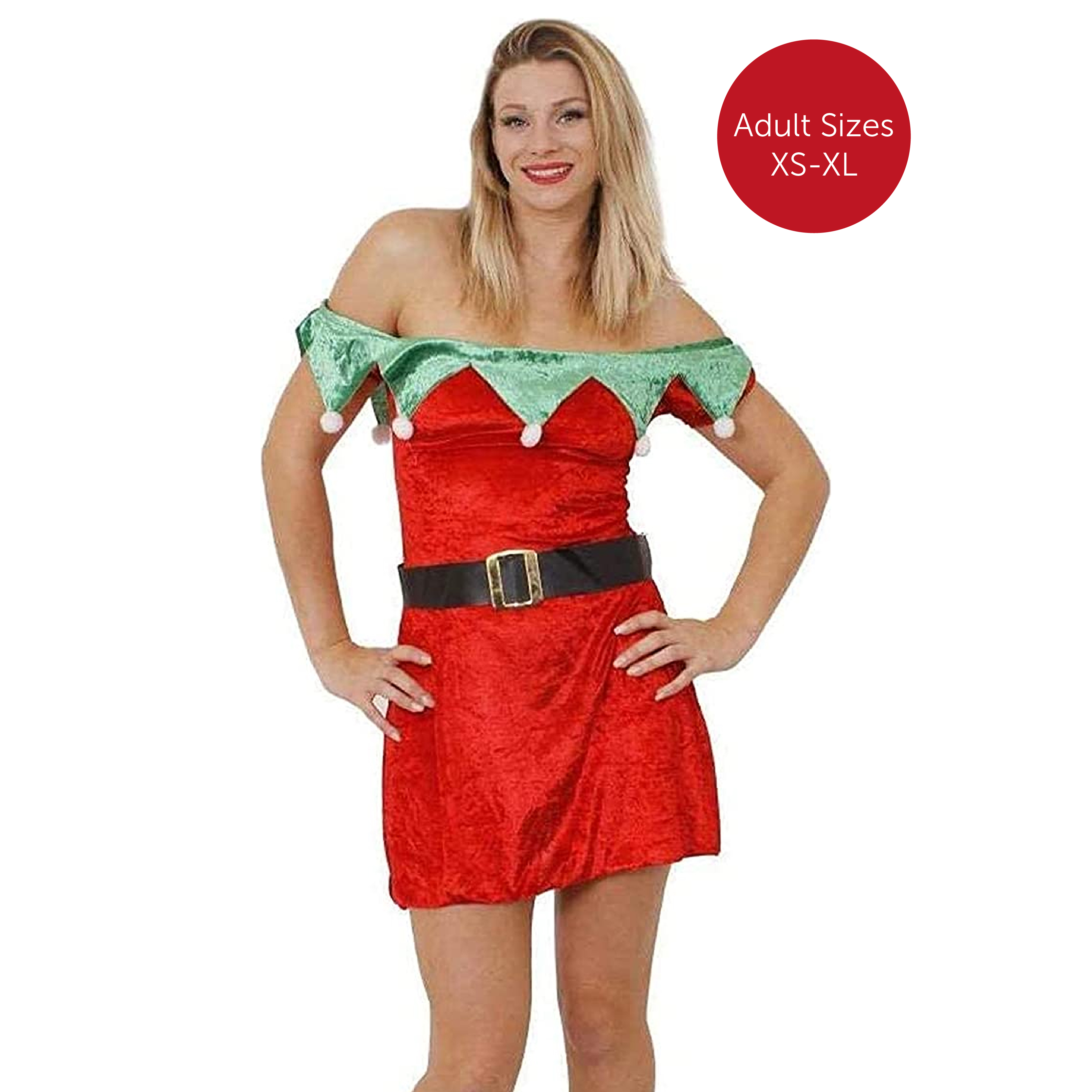 COSTUME INCLUDES: Your Ladies Off the Shoulder Elf Santa Skater Dress will include a Red ‘Off-the-Shoulder’ Santa Dress with Green Elf Velour Detailing with White Pom Poms, and a Black Belt with Gold Buckle to complete your Elf Santa Look!
