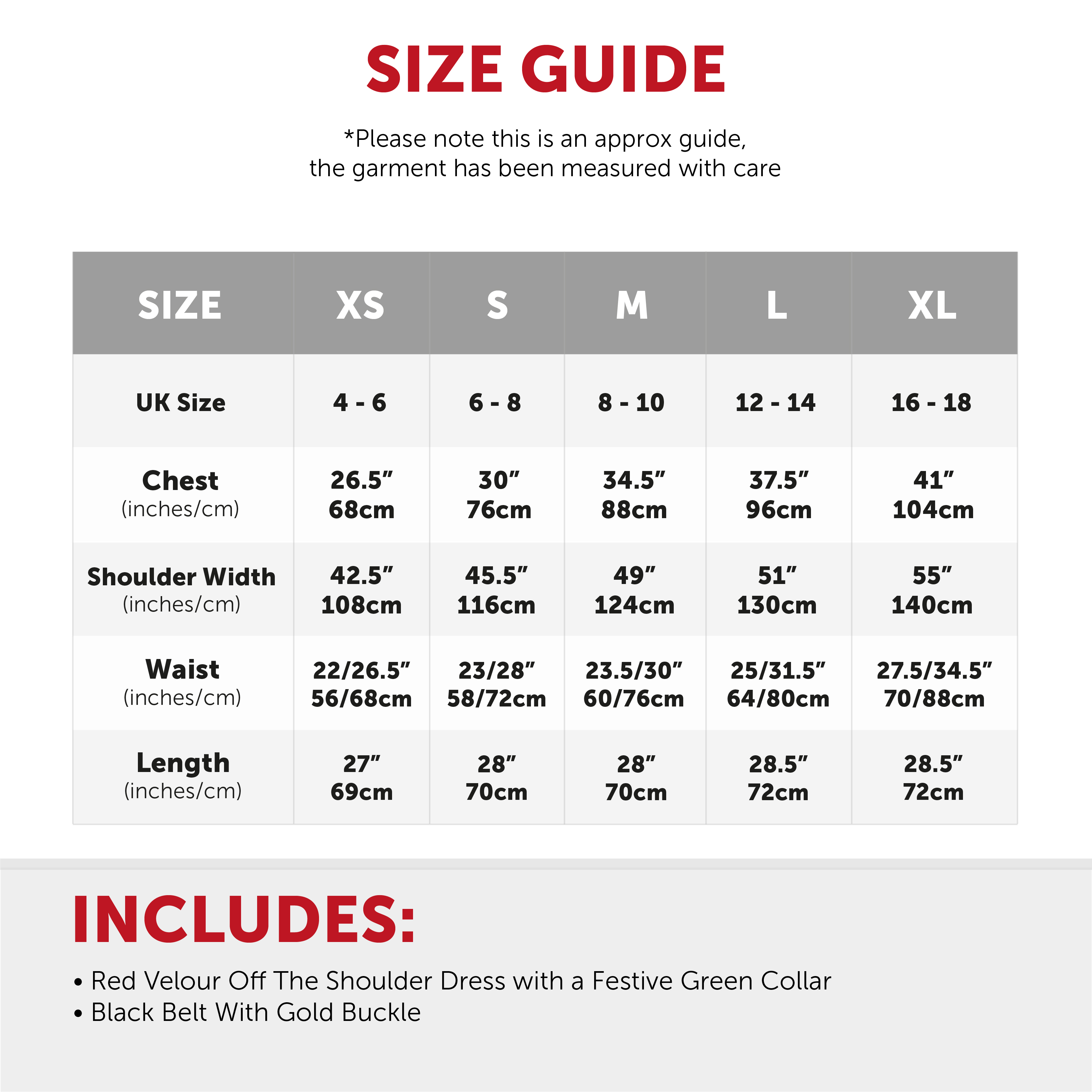 AVAILABLE IN MULTIPLE SIZES: Your Ladies Off the Shoulder Elf Dress is available in multiple sizes from X-Small to X-Large: X-Small (UK 4 - 6) Chest 26.5" (68cm), Shoulder Width 42.5" (108cm), Waist 22/26.5" (56/68cm), Length 27" (69cm) | Small (UK 6 - 8) Chest 30" (76cm), Shoulder Width 45.5" (116cm), Waist 23/28" (58/72cm), Length 28" (70cm) | Medium (UK 8 - 10) Chest 34.5" (88cm), Shoulder Width 49" (124cm), Waist 23.5/30" (60/76cm), Length 28" (70cm) | Large (UK 12 - 14) Chest 37.5" (96cm), Shoulder Width 51" (130cm), Waist 25/31.5" (64/80cm), Length 28.5" (72cm) | X-Large (UK 16 - 18) Chest 41" (104cm), Shoulder Width 55" (140cm), Waist 27.5/34.5" (70/88cm), Length 28.5" (72cm)