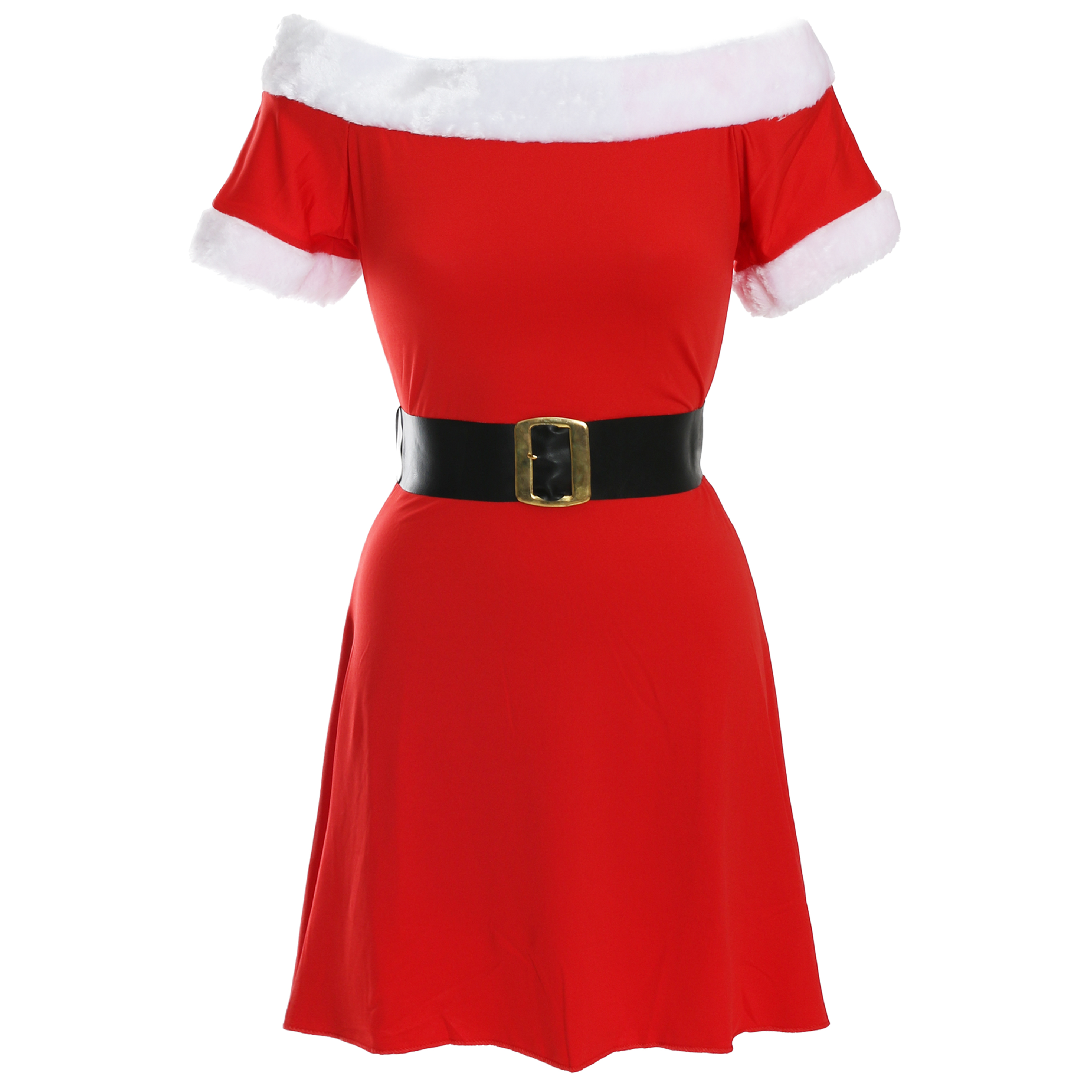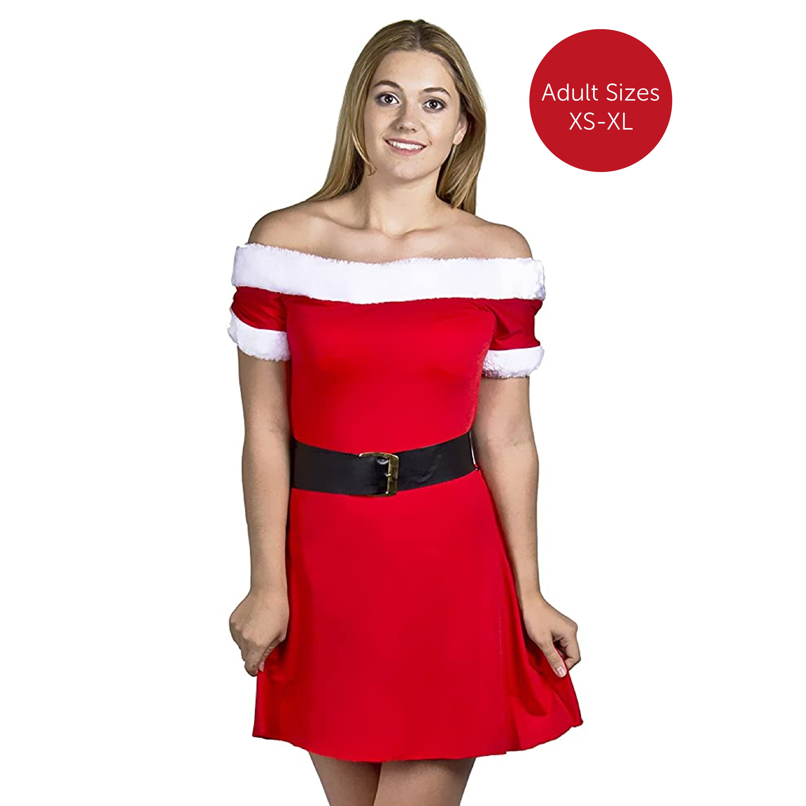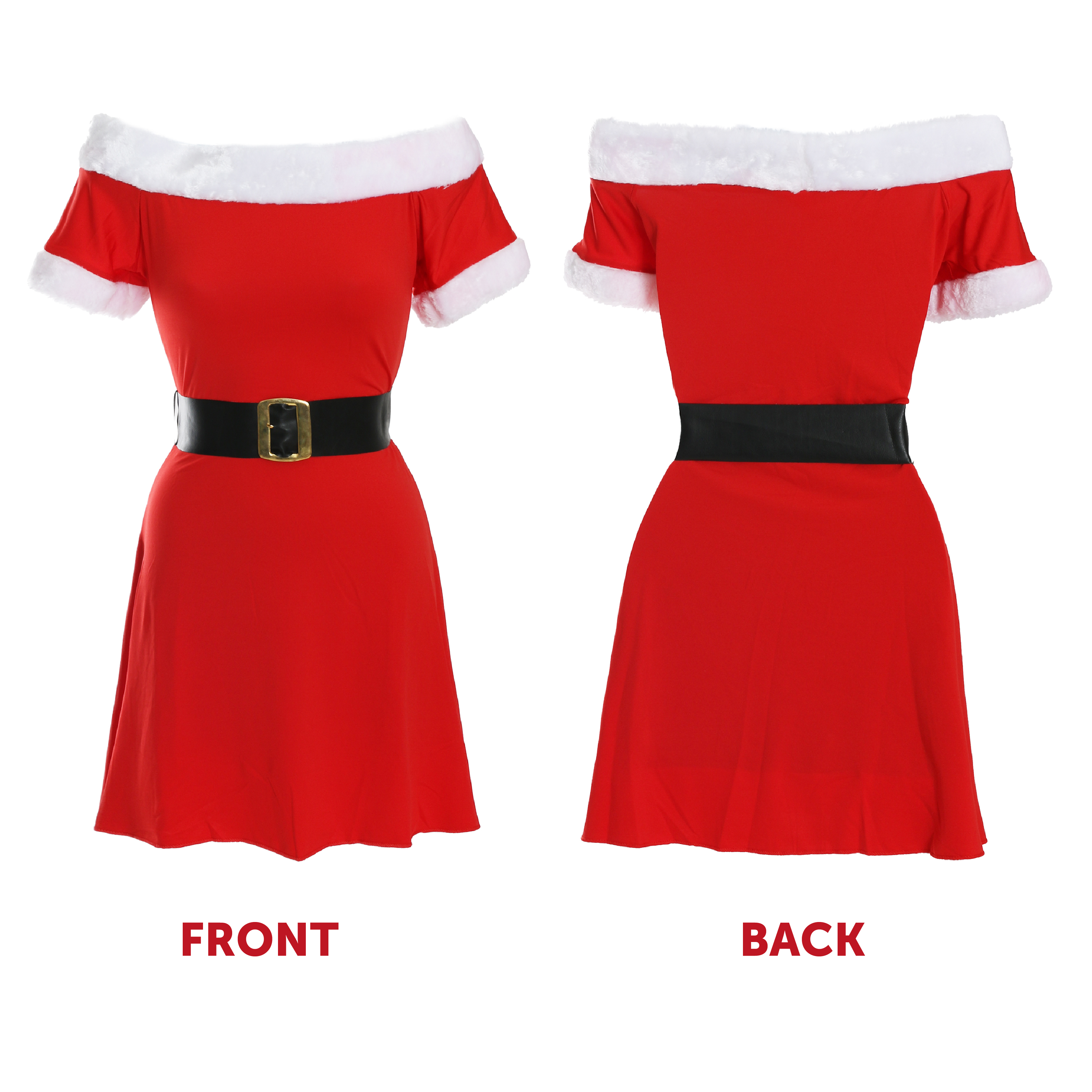 COSTUME INCLUDES: Your Sexy Ladies Off-the-Shoulder Skater Santa Dress will include a Red Off-the-Shoulder dress with faux white faux fur trim, and a Black Belt with Gold Buckle to complete your look!