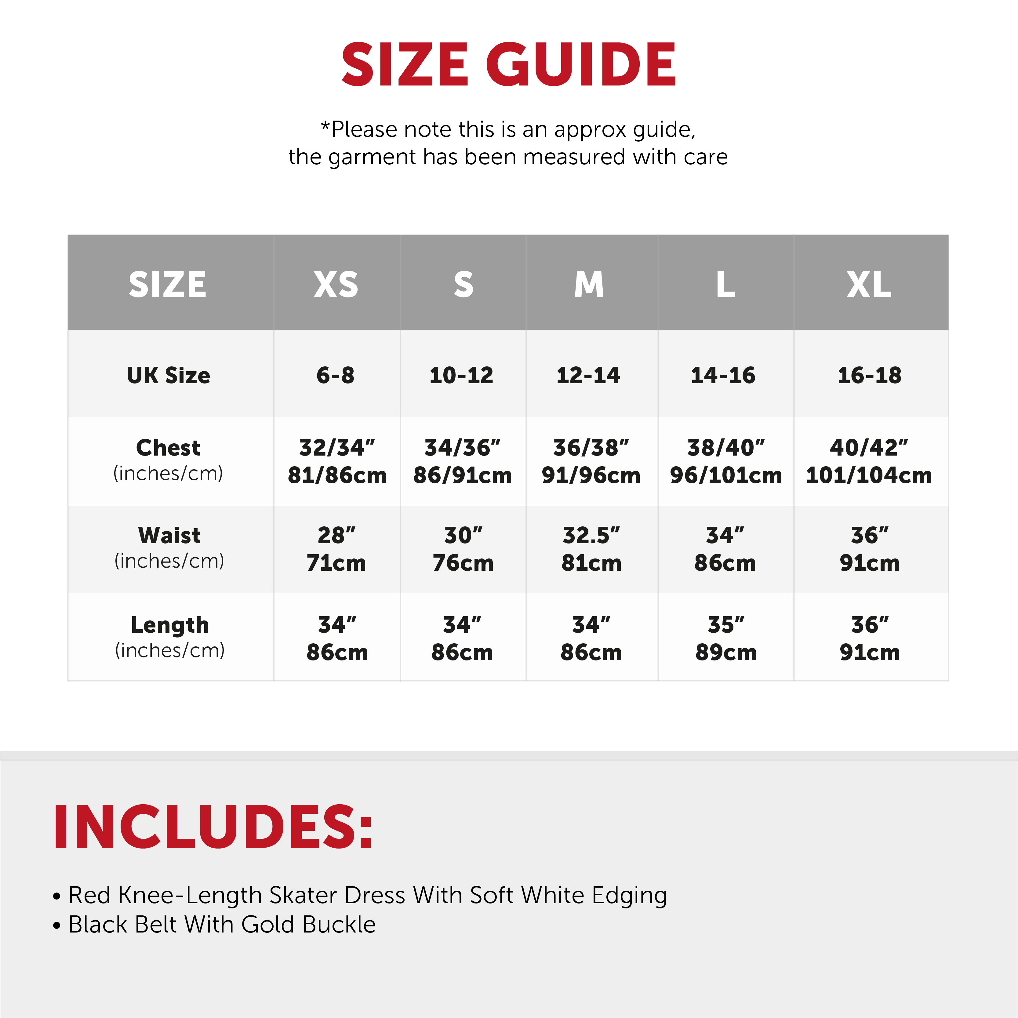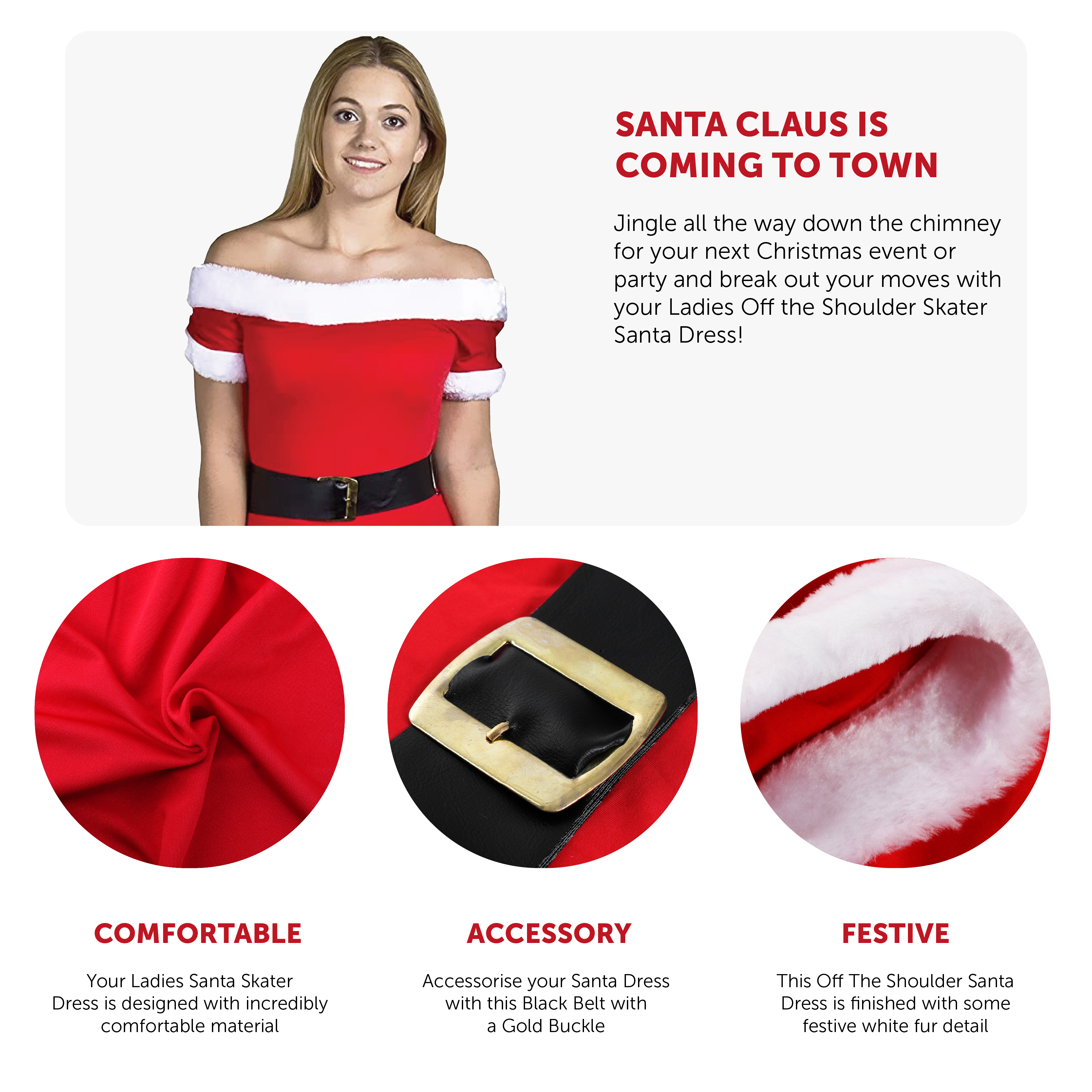 AVAILABLE IN MULTIPLE SIZES: Your Ladies Off-the-Shoulder Skater Santa Dress is available in multiple sizes from X-Small to X-Large: X-Small (Ladies UK 6-8) - Chest: 32-34"/81-86cm, Waist: 28"/71cm, Length: 34"/86cm | Small (Ladies UK 10-12) - Chest: 34-36"/86-91cm, Waist: 30"/76cm, Length: 34"/86cm | Medium (Ladies UK 12-14) - Chest: 36-38"/91-96cm, Waist: 32.5"/81cm, Length: 34"/86cm | Large (Ladies UK 14-16) - Chest: 38-40"/96-101cm, Waist: 34"/86cm, Length: 35"/89cm | X-Large (Ladies UK 16-18) - Chest: 40-42"/101-104cm, Waist: 36"/91cm, Length: 36"/91cm