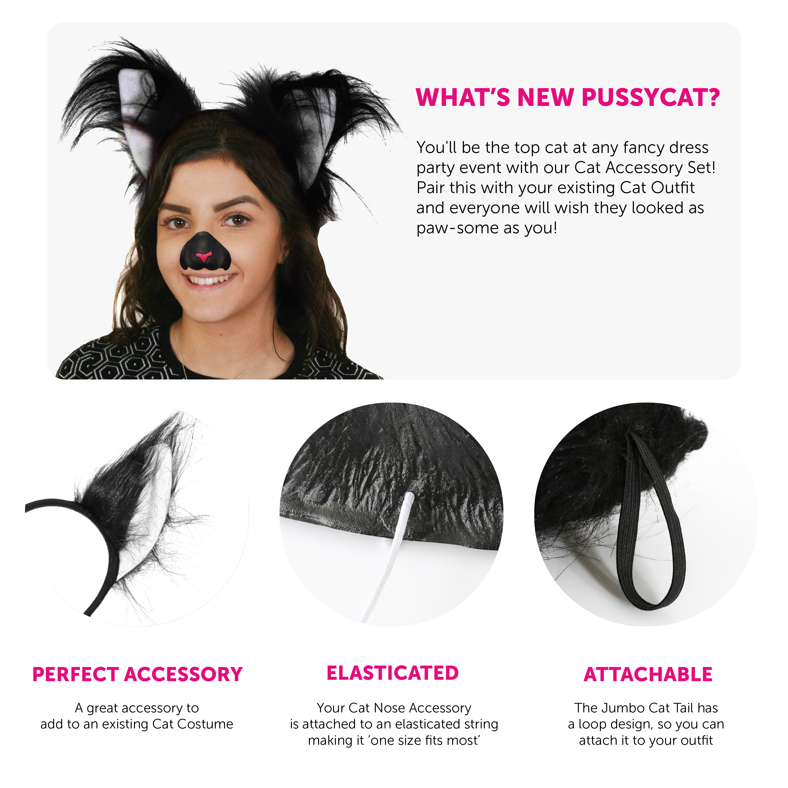 ACCESSORY SET INCLUDES: Your Cat Accessory Set includes a Black Headband with fluffy Black Cats Ears attached, a detailed Black Cat Nose on an elasticated string and an extremely soft, Faux Fur Black Tail with a White Tip and Belt Loop Attachment, the pur-fect accessories for any event!