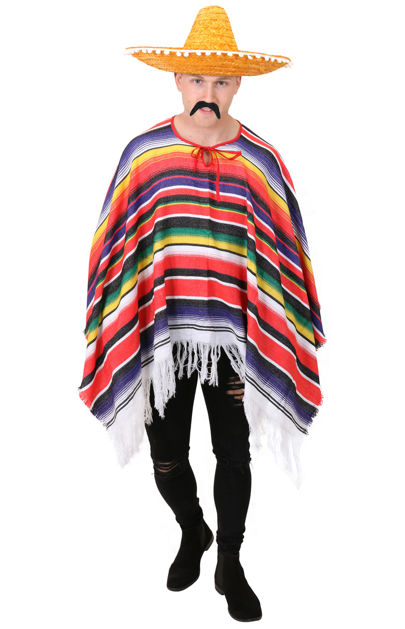 Hey Amigo! Turn into a Mexican the second you put on this Multicolour Mexican Poncho! With this Orange Sombrero Hat and Mexican Tash, why not add a Mexican cigar to take this costume that extra mile!