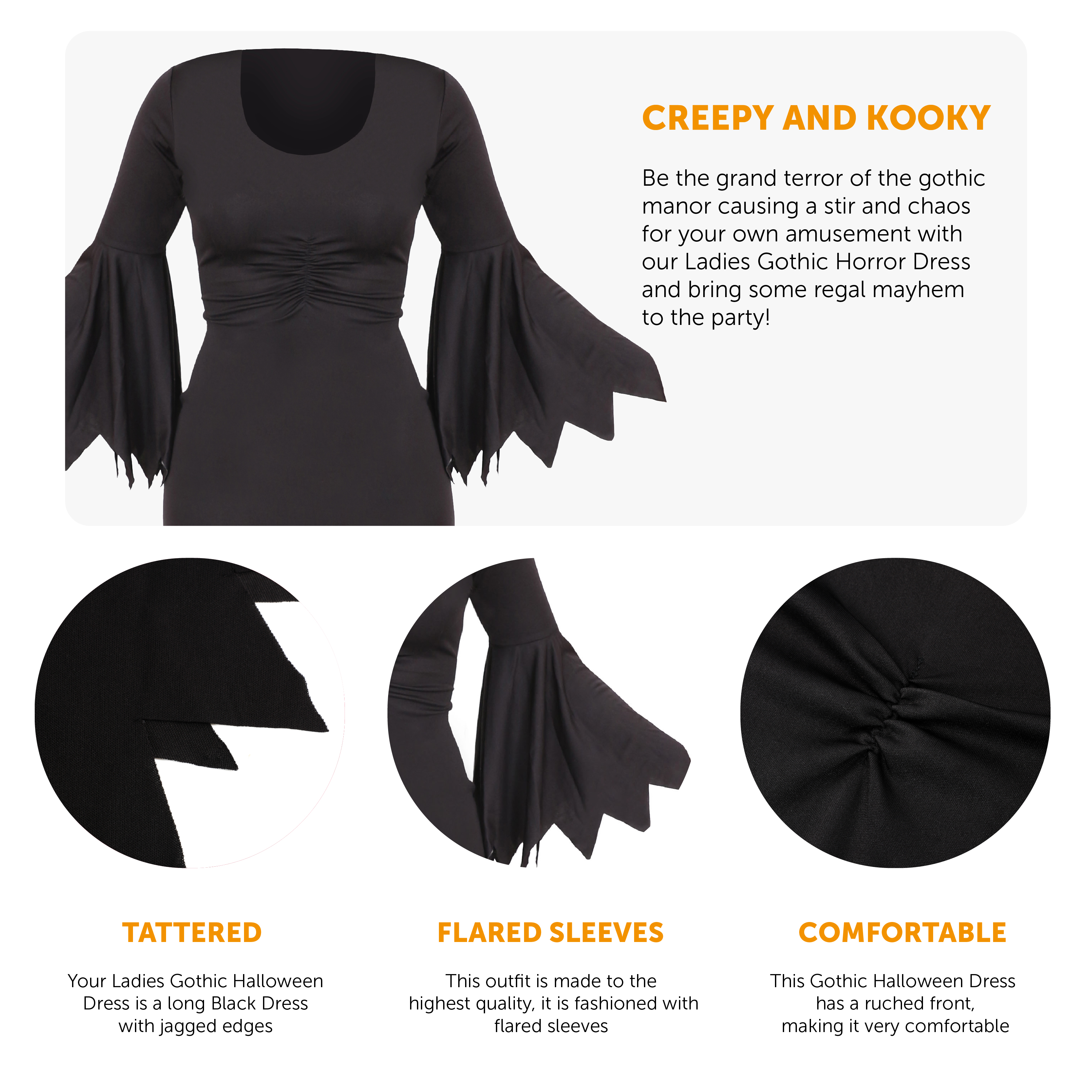 COSTUME DETAILS: Your Ladies Gothic Horror Girl Dress includes a Long Sleeve Black Dress and a zip up back to slip in and out of the dress whenever you want!