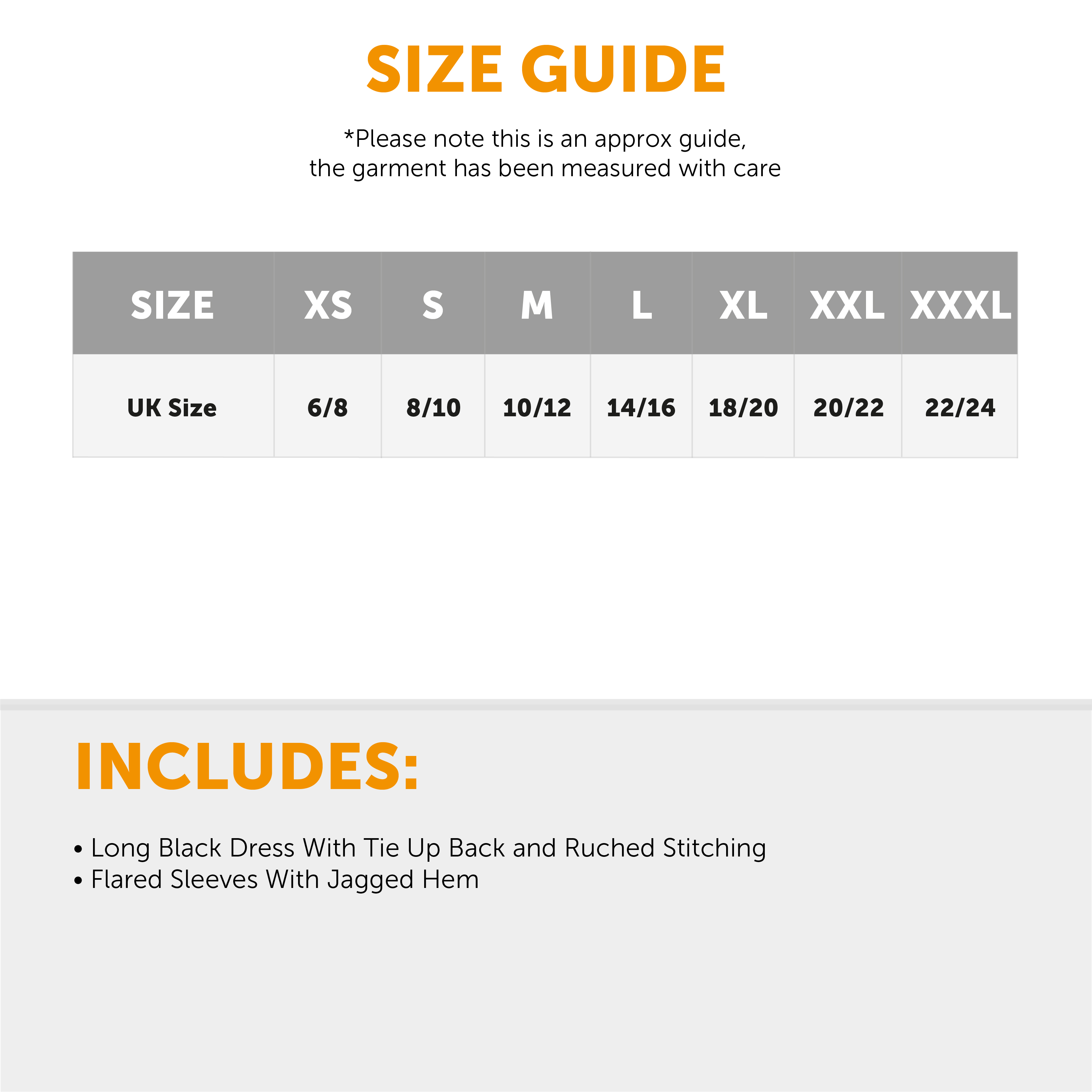 AVAILABLE IN MULTIPLE SIZES: Your Ladies Gothic Horror Girl Dress is available in multiple sizes from Small to XX-Large: Small (UK 6 - 8): Chest - 34”/88 cm, Waist - 28”/72 cm, Length - 36”/93 cm, Sleeve - 20”/50 cm | Medium (UK 10 - 12): Chest - 35”/90 cm, Waist - 30”/76 cm, Length - 37”/95 cm, Sleeve - 21”/54 cm | Large (UK 12 – 14): Chest – 36”/92 cm, Waist – 32“/82 cm, Length – 38”/97 cm, Sleeve – 21”/55 cm | X-Large (UK 16 - 18): Chest - 40”/102 cm, Waist – 38”/96 cm, Length – 39”/99 cm, Sleeve – 22”/57 cm | XX-Large (UK 18 - 20): Chest - 46”/118 cm, Waist – 39”/100 cm, Length – 40”/101 cm, Sleeve – 23”/58 cm