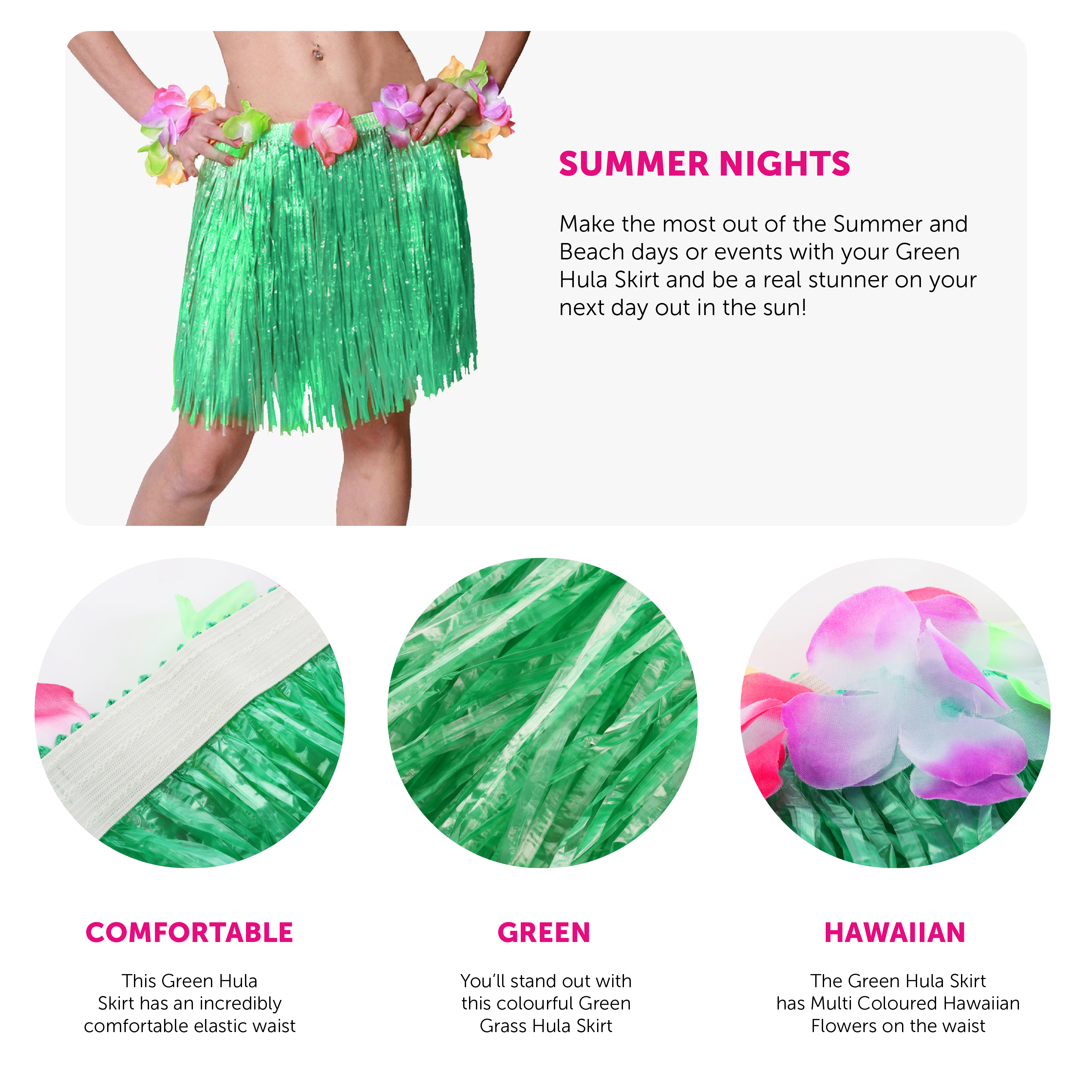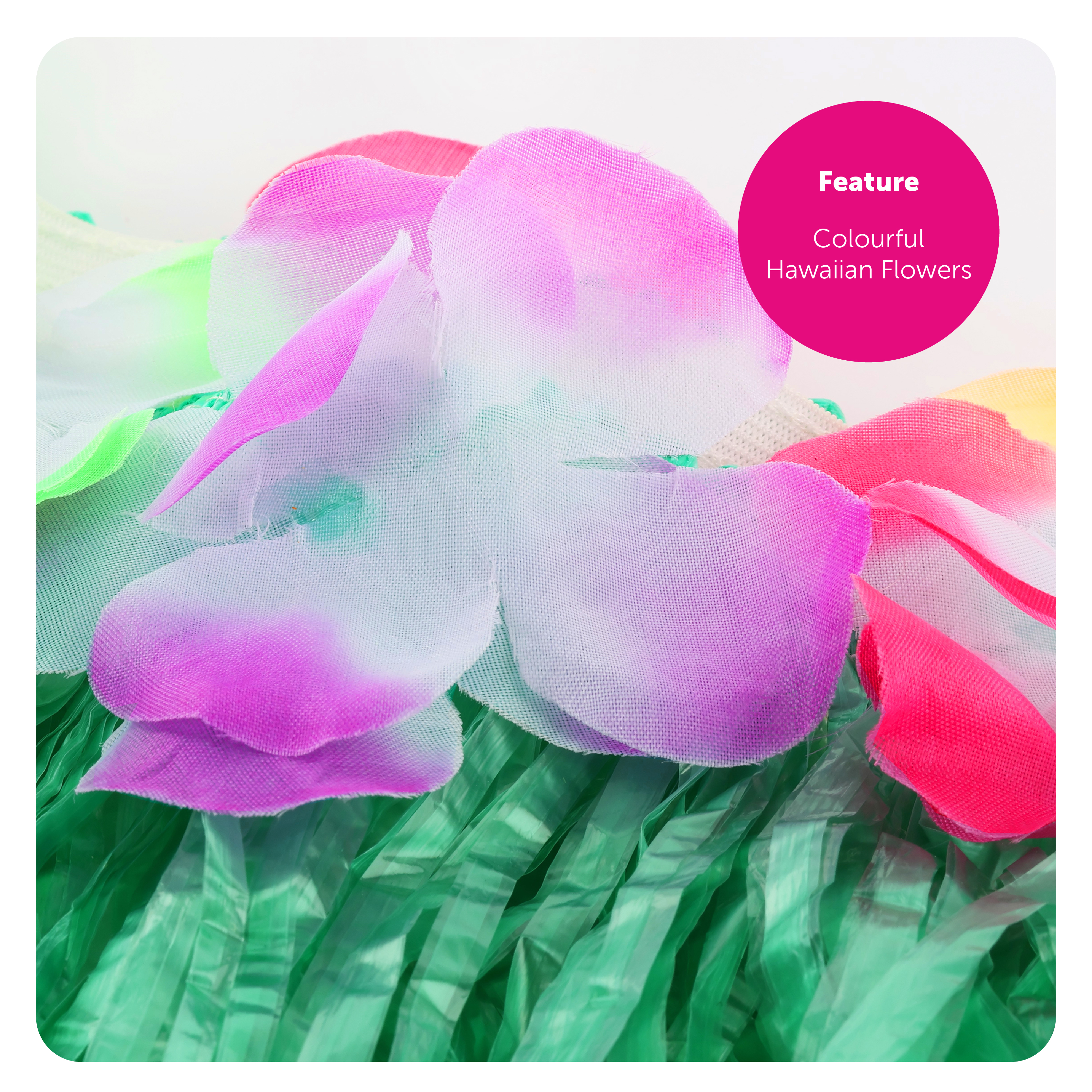 HULA SKIRT DETAILS: Your Hula Skirt is a Green, grass-like Skirt with an elasticated waistband and multi coloured decorative Hawaiian Lei Flowers, all tropical and ready for the beach!