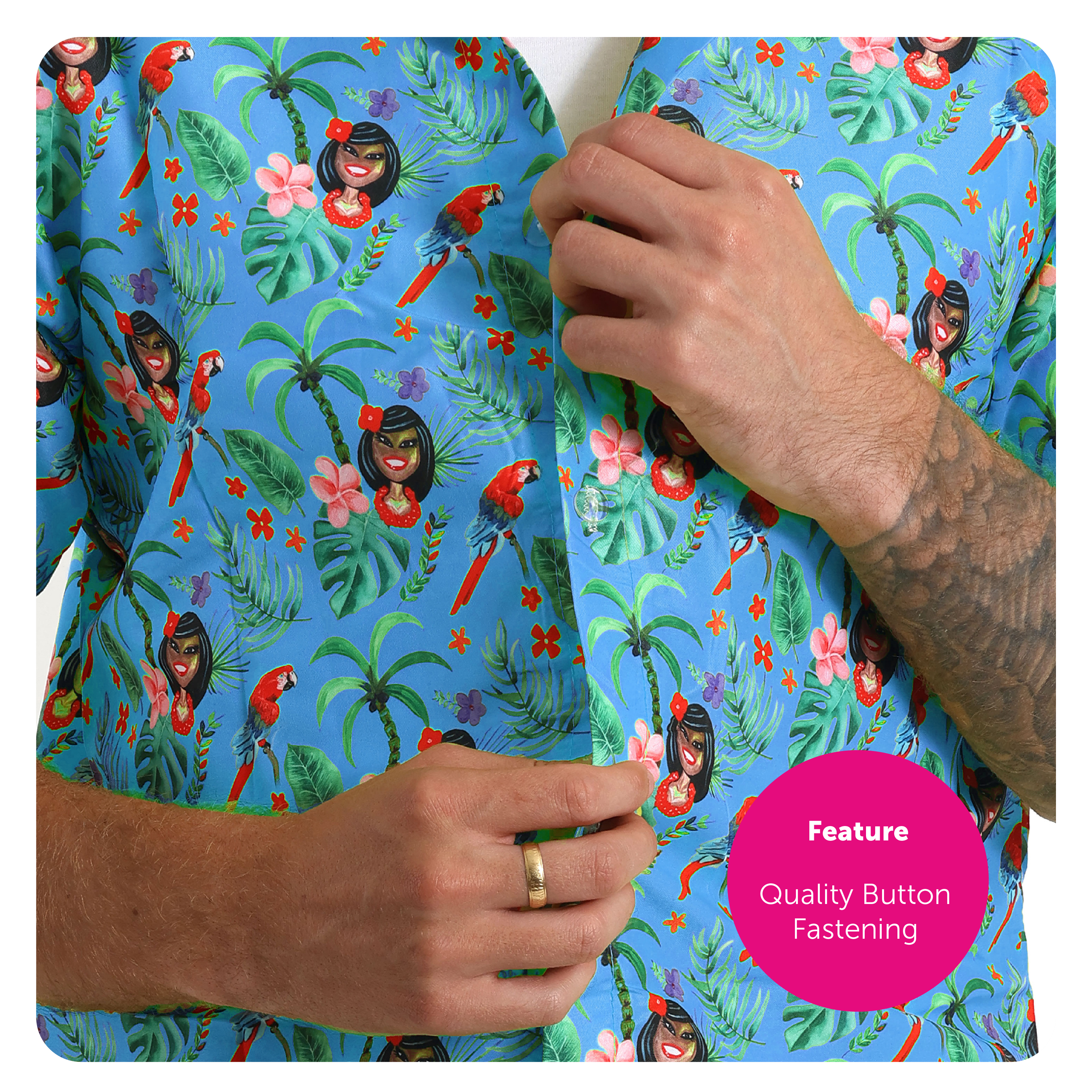 AVAILABLE IN MULTIPLE SIZES: Your Blue Hawaiian Shirt is available in multiple sizes from Small – XX-Large: Small - Chest 31/35" (79/89cm), Length 24" (61cm) | Medium - Chest 34/38” (86/97cm), Length 25" (63cm) | Large - Chest 38/42" (96/106cm), Length 25" (63cm) | X-Large - Chest 42/46" (112/117cm), Length 26" (67cm) | XX-Large - Chest 46.5" (118cm), Length 29" (74cm)