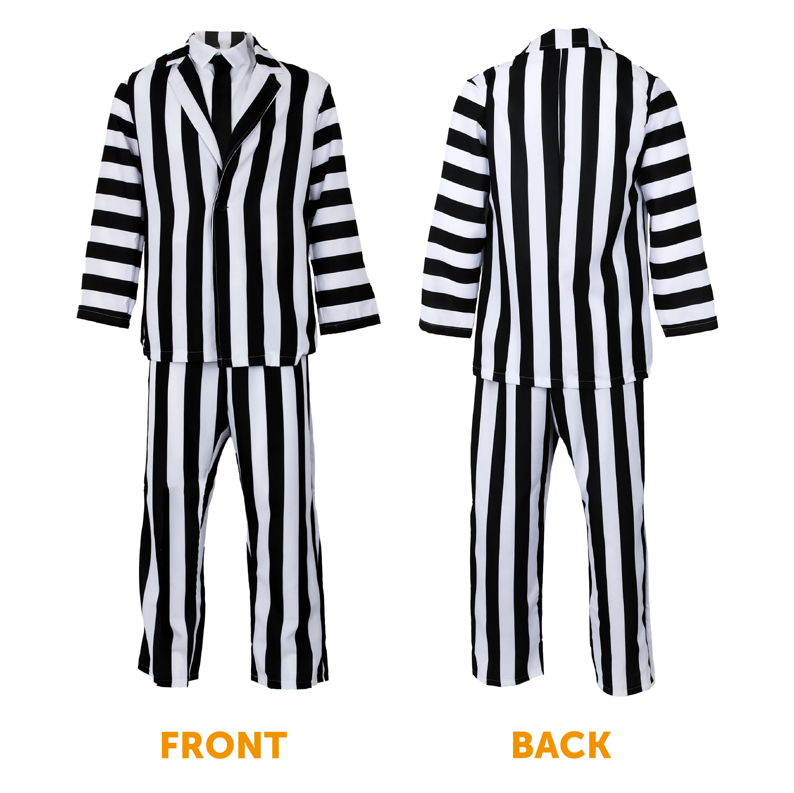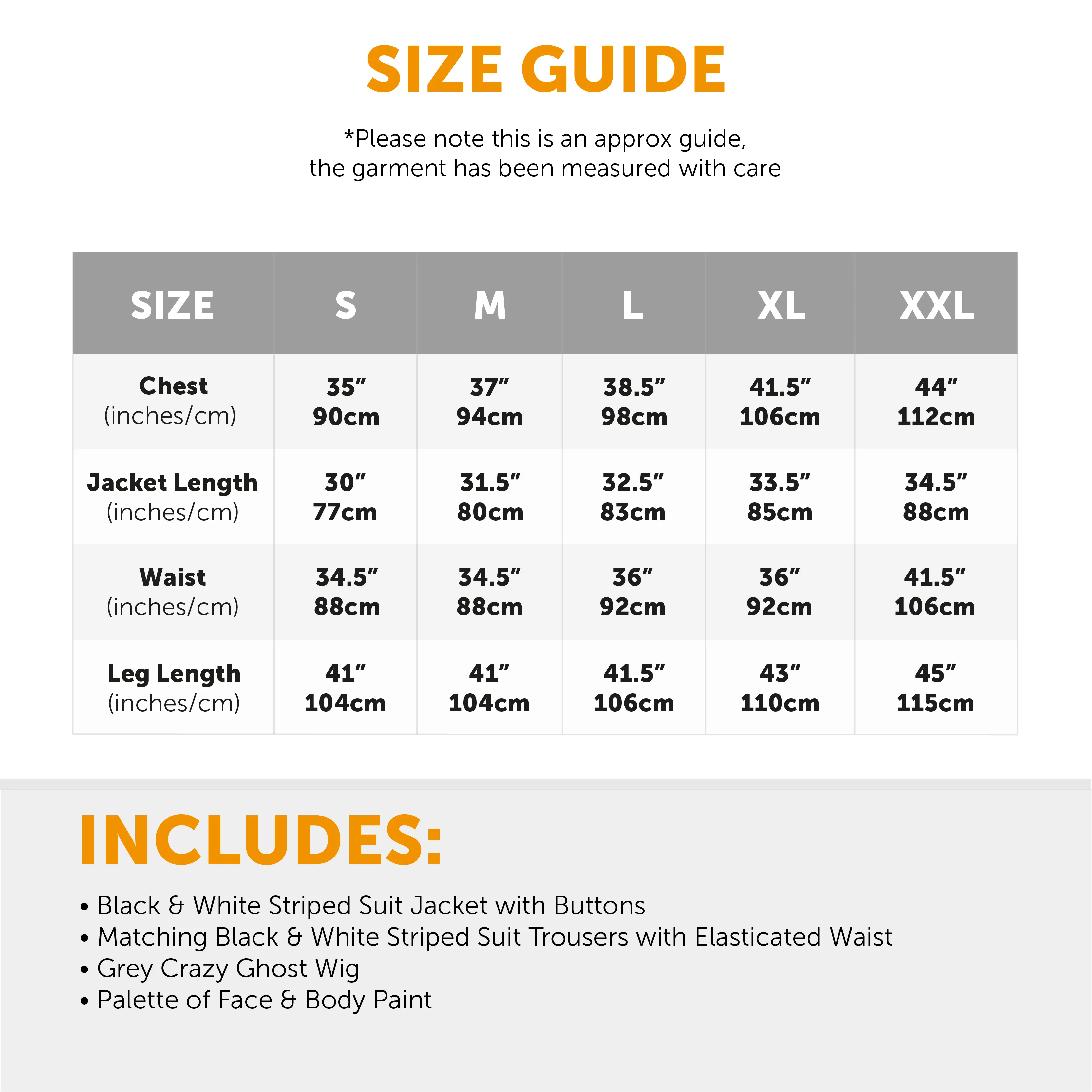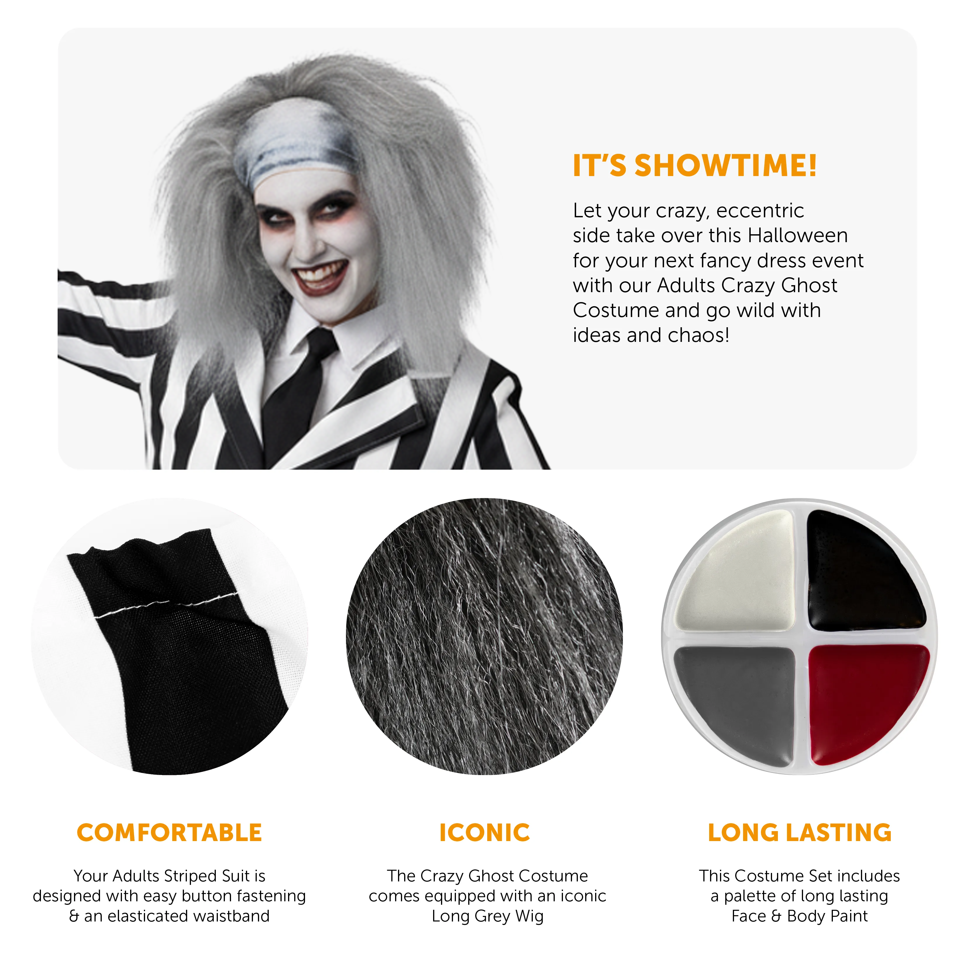 COSTUME INCLUDES: The Adults Crazy Ghost Costume includes a two piece Black and White Striped Suit with a smart Jacket and matching Trousers, a Crazy Grey Wig, and a palette of Face and Body Paint, perfect for Halloween!
