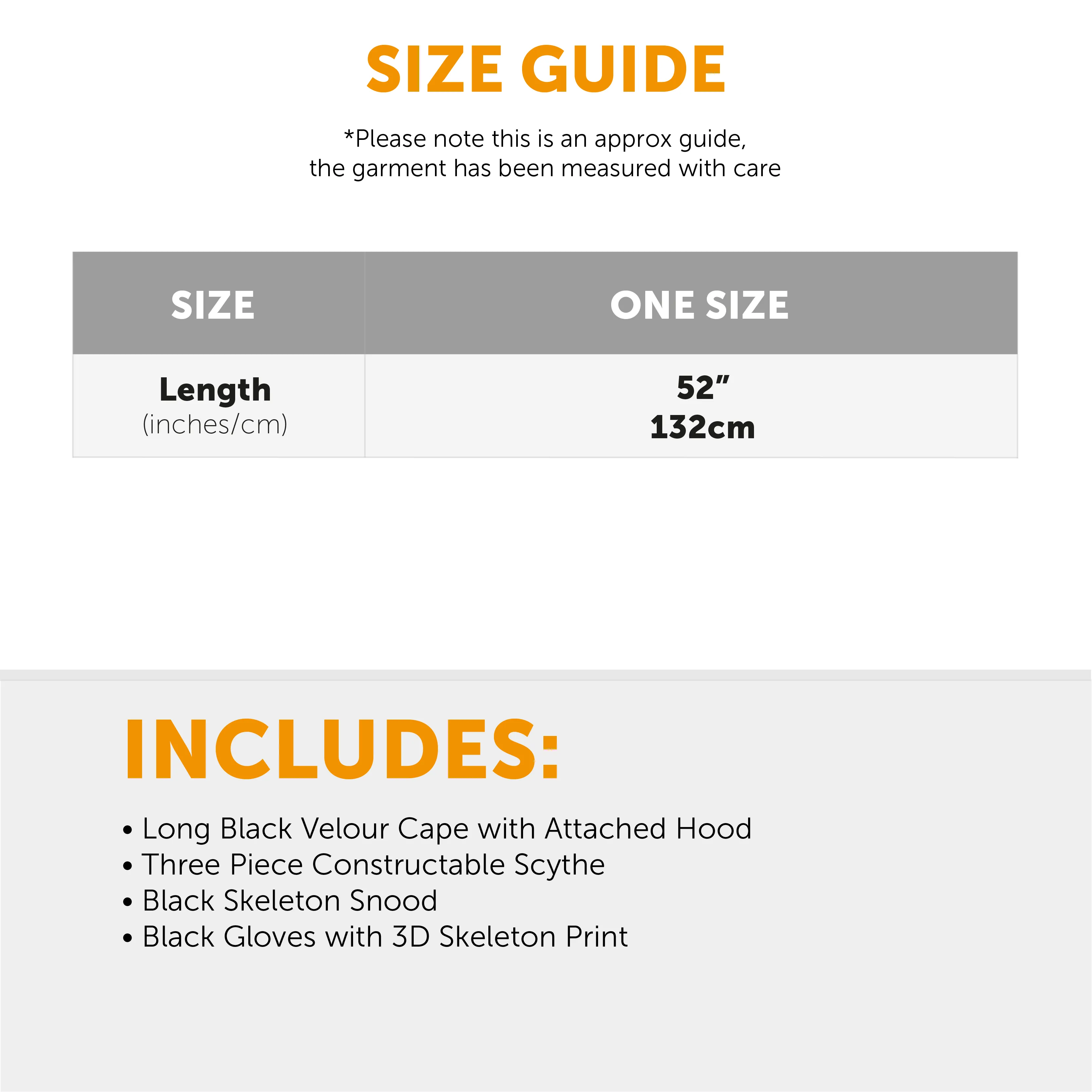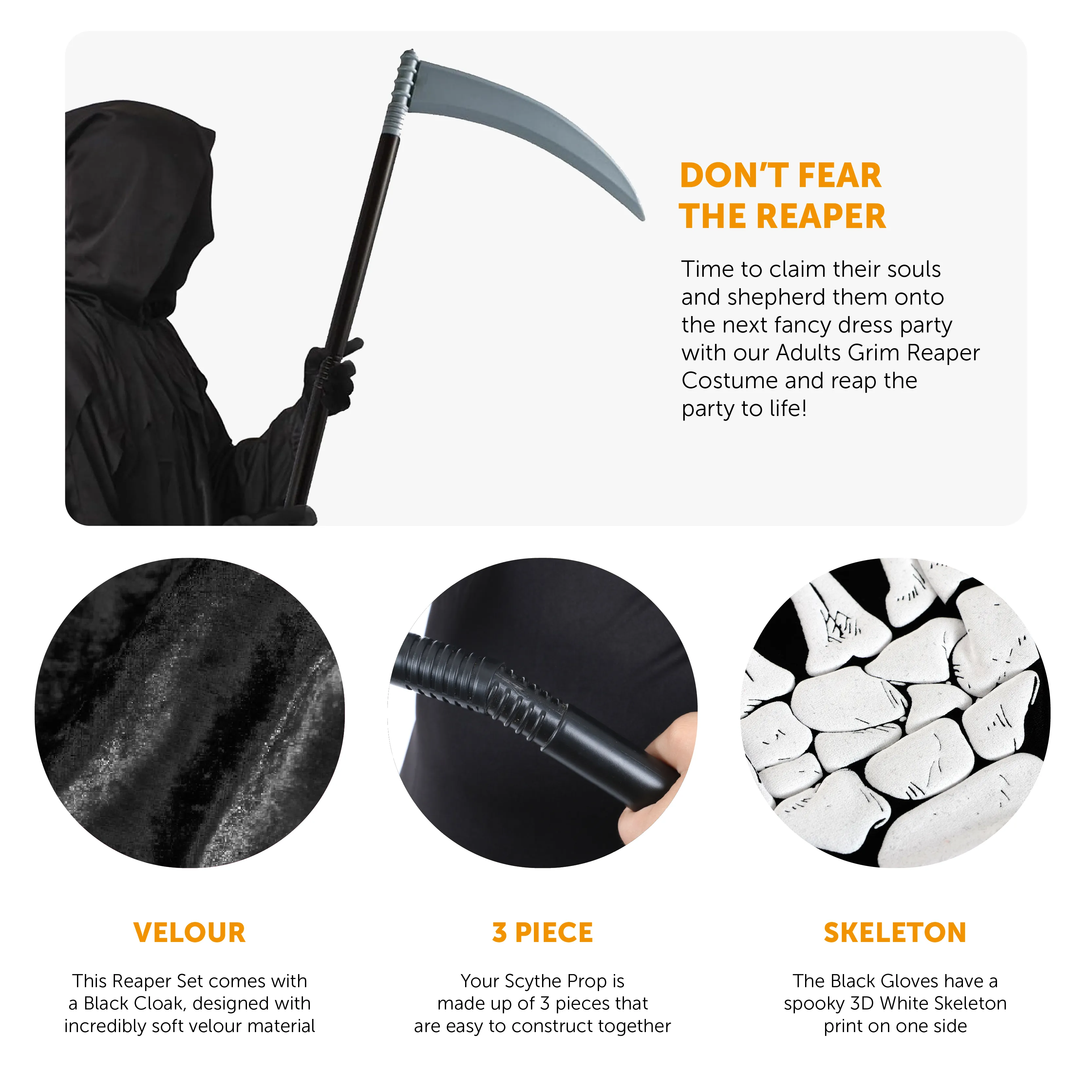 COSTUME INCLUDES: Your Adults Grim Reaper Costume includes a Long Black Velour Cloak with an attached Hood, a 3 piece constructable Scythe, a Snood with a Skeleton design, and a pair of Black Gloves with a 3D Skeleton design on the back, the perfect Costume Set for any Halloween event!