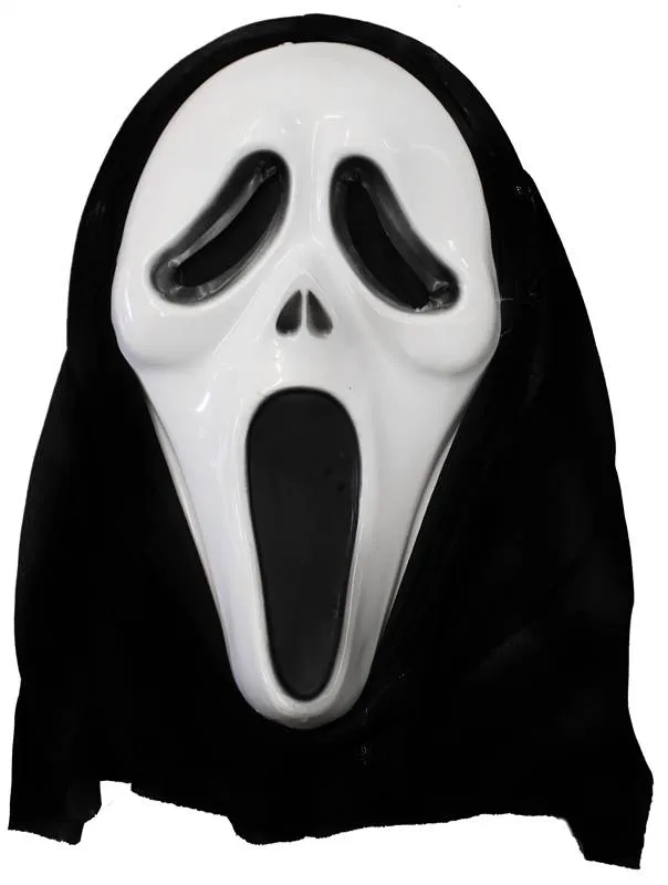 Classic Screamer Mask – White plastic ghoul face with the instantly recognisable screaming expression, complete with an attached black fabric hood for that haunting silhouette. Lightweight, breathable, and comfortable to wear all night long.