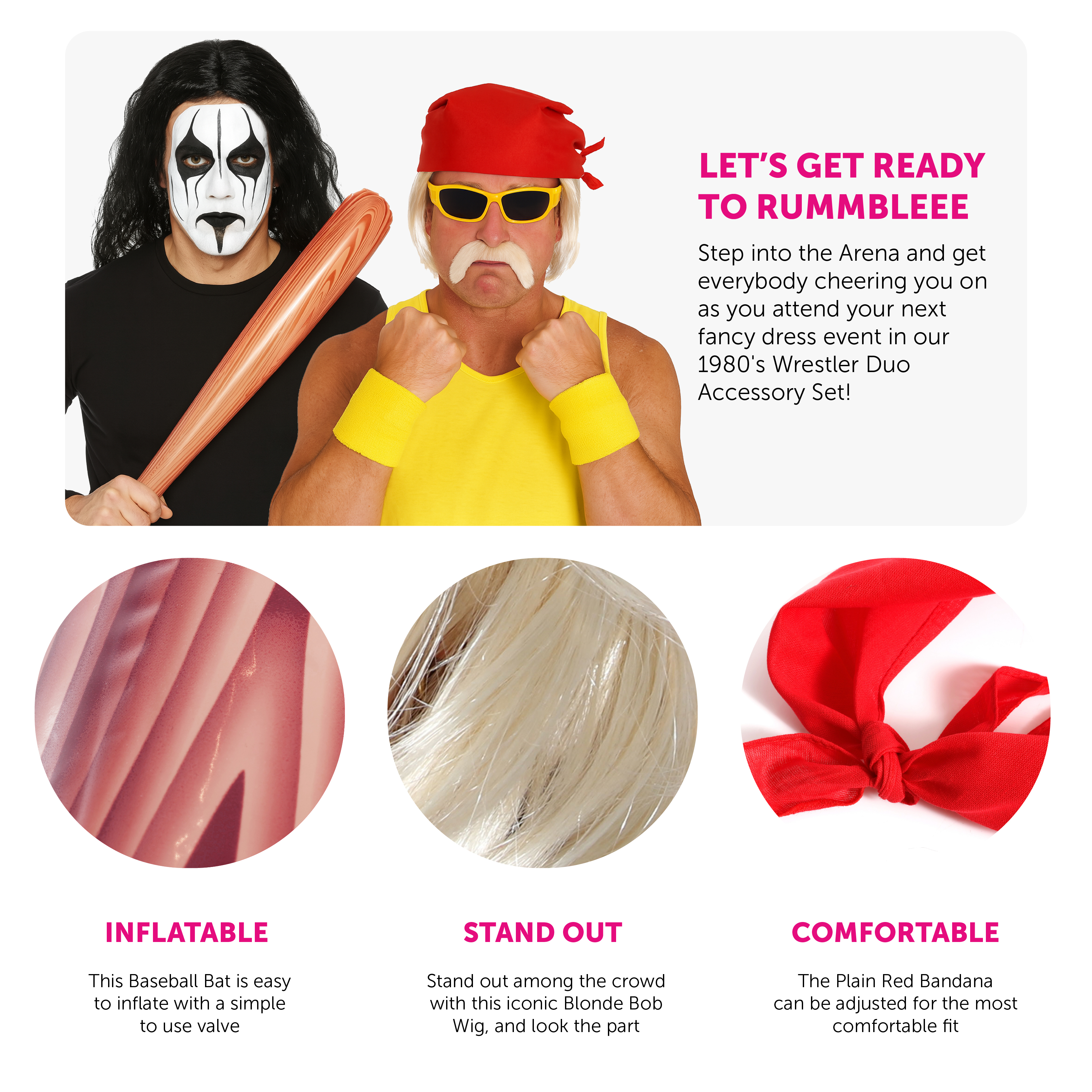 SET INCLUDES: This 1980's Wrestler Duo Accessory Set includes a Black Wet Look Afro, an Inflatable Baseball Bat, a palette of Face & Body Paint, a Plain Red Bandana, a Blonde Bob Wig, an adhesive Moustache, Yellow Frame Sunglasses, and elasticated Yellow Wristbands, to help you finish off your desired look!