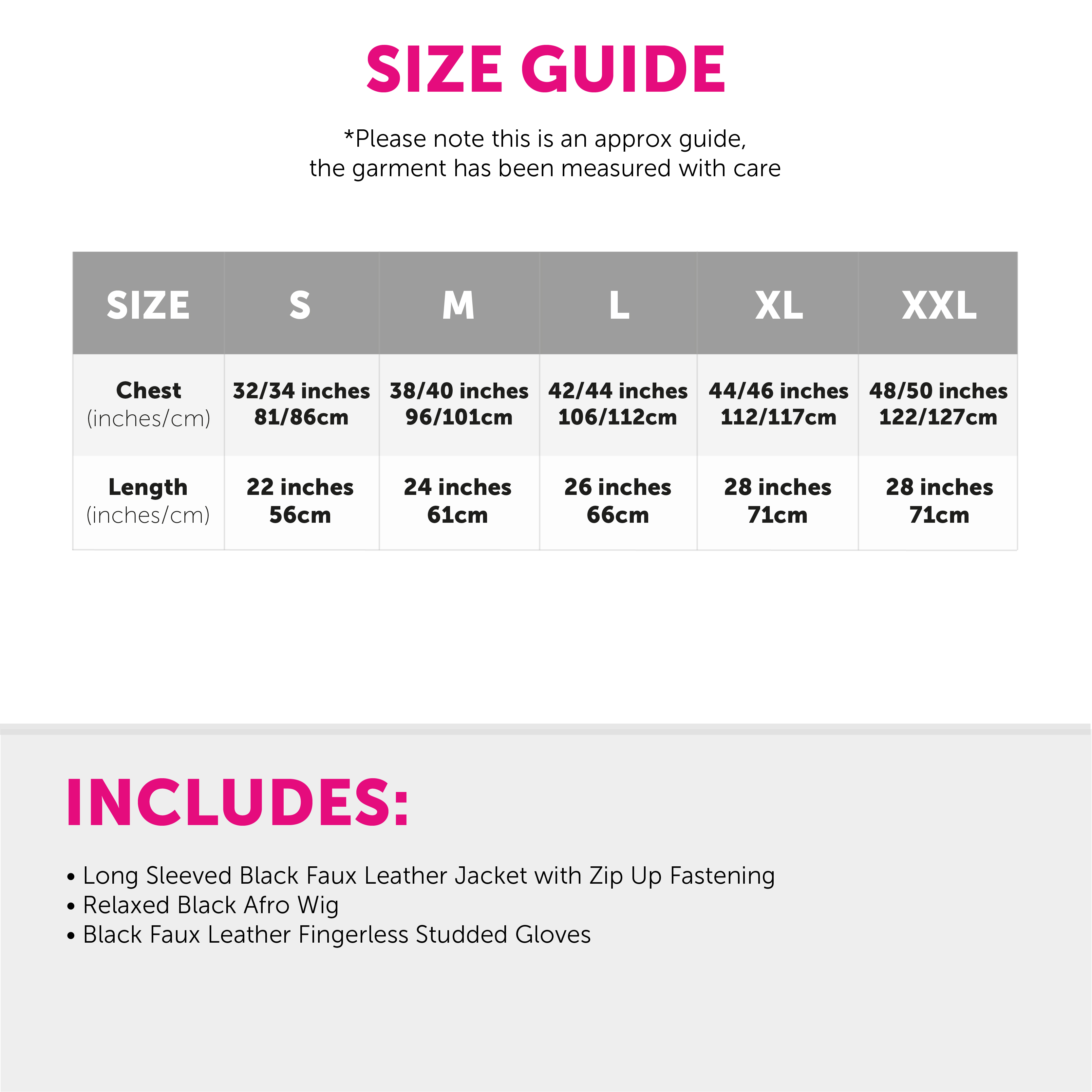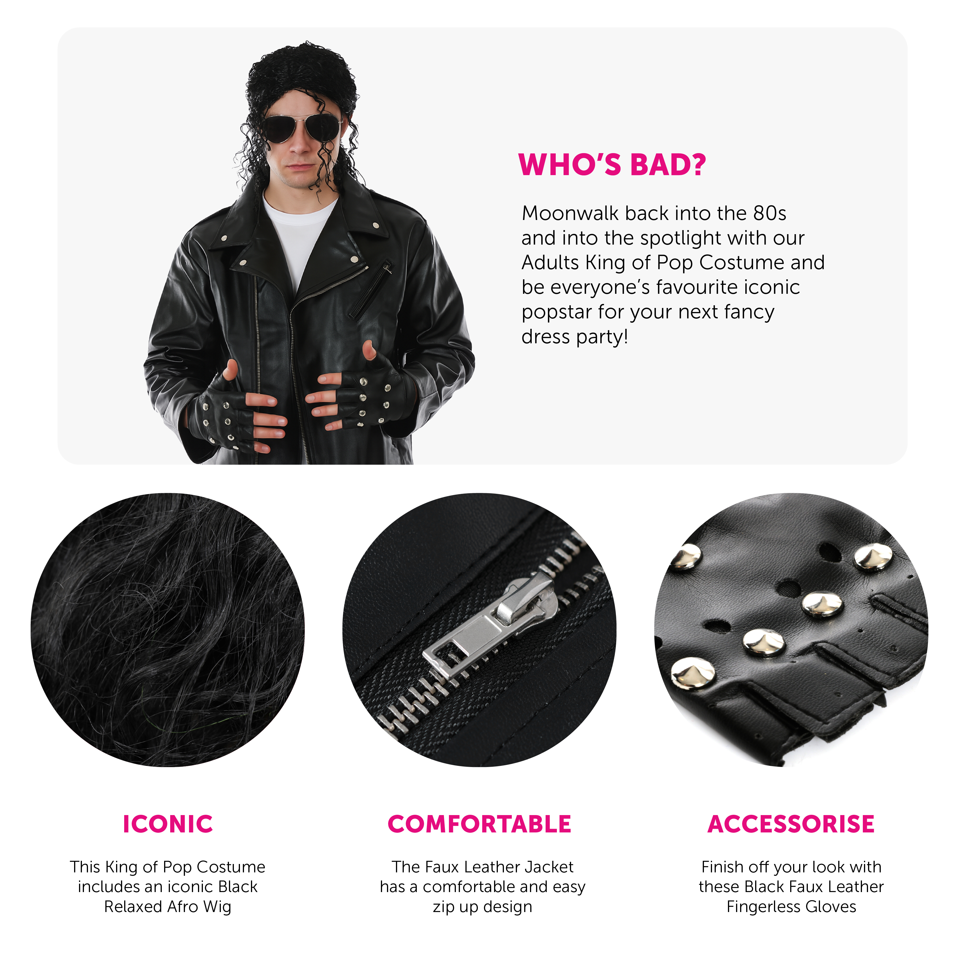 COSTUME DETAILS: Your King of Pop Costume includes a Black Faux Leather Jacket with a comfortable zip up design, a Long Black Relaxed Afro Wig, and a pair of Black Faux Leather Fingerless Studded Gloves, the perfect look for any event!