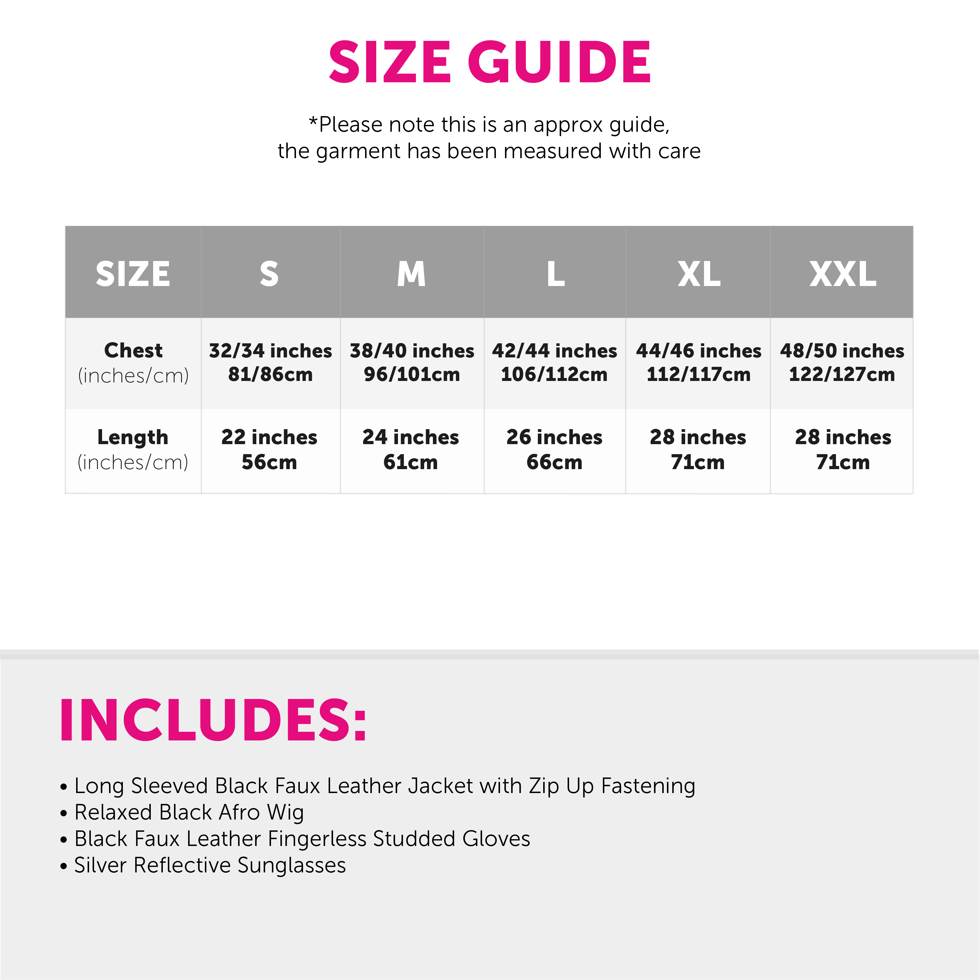 COSTUME DETAILS: Your King of Pop Costume includes a Black Faux Leather Jacket with a comfortable zip up design, a Long Black Relaxed Afro Wig, Silver Reflective Sunglasses, and a pair of Black Faux Leather Fingerless Studded Gloves, the perfect look for any event!