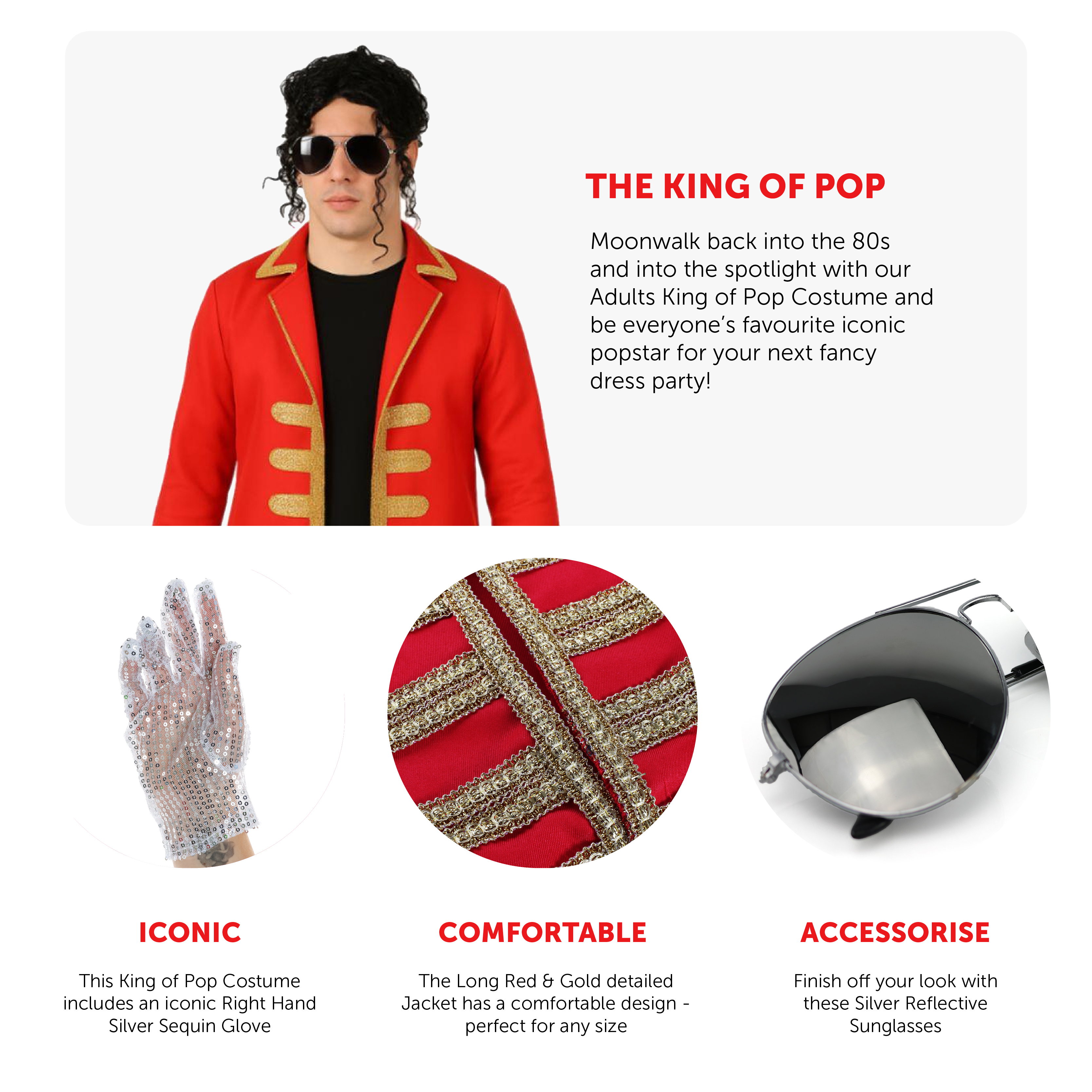 COSTUME DETAILS: Your King of Pop Costume includes a Long Red Coat with Golden Decorative details, a Black Fedora Hat with a Black Band, a Long Black Relaxed Afro Wig, a single Right Hand Sequin Glove, and Silver Reflective Sunglasses, the perfect look for any event!