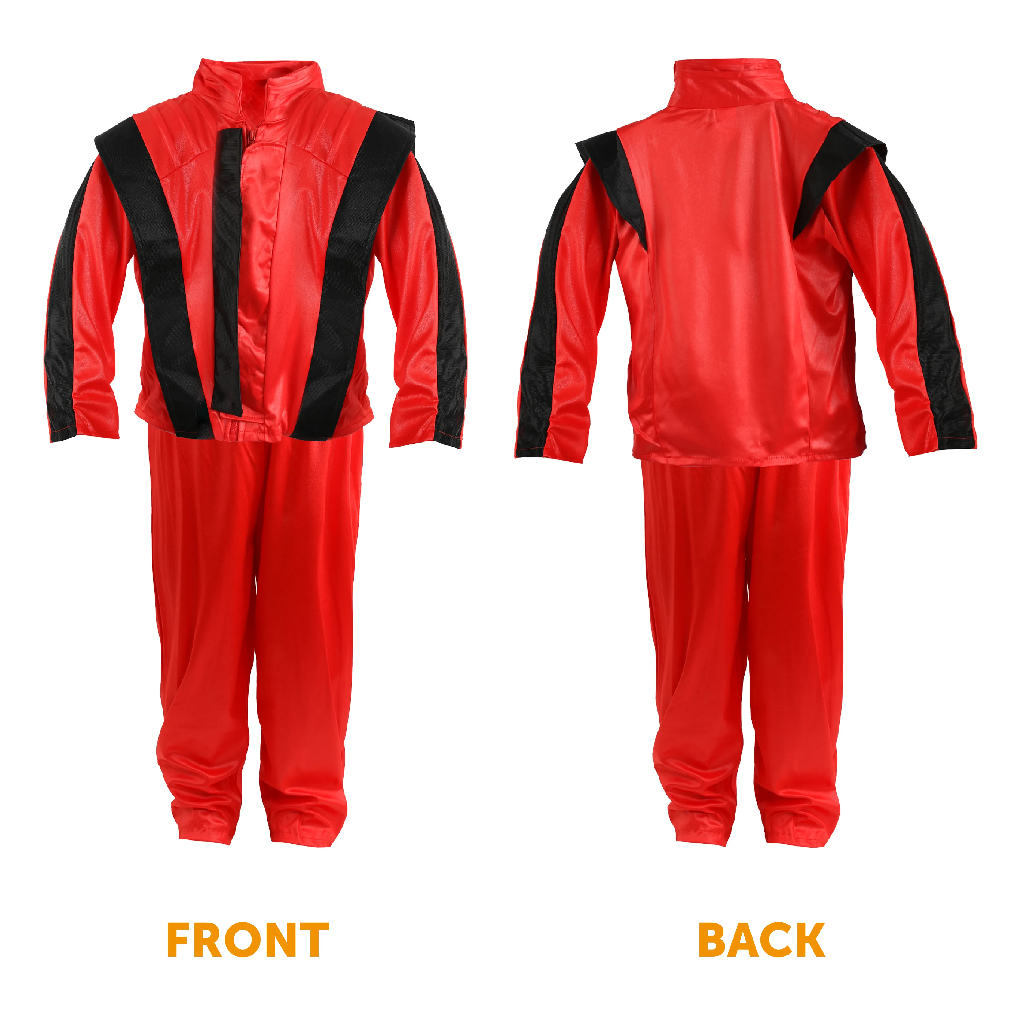 Your King of Pop Costume includes a red and black jacket with matching trousers, a relaxed black afro wig, and a pair of white gloves — everything your little performer needs to recreate the iconic pop legend look.