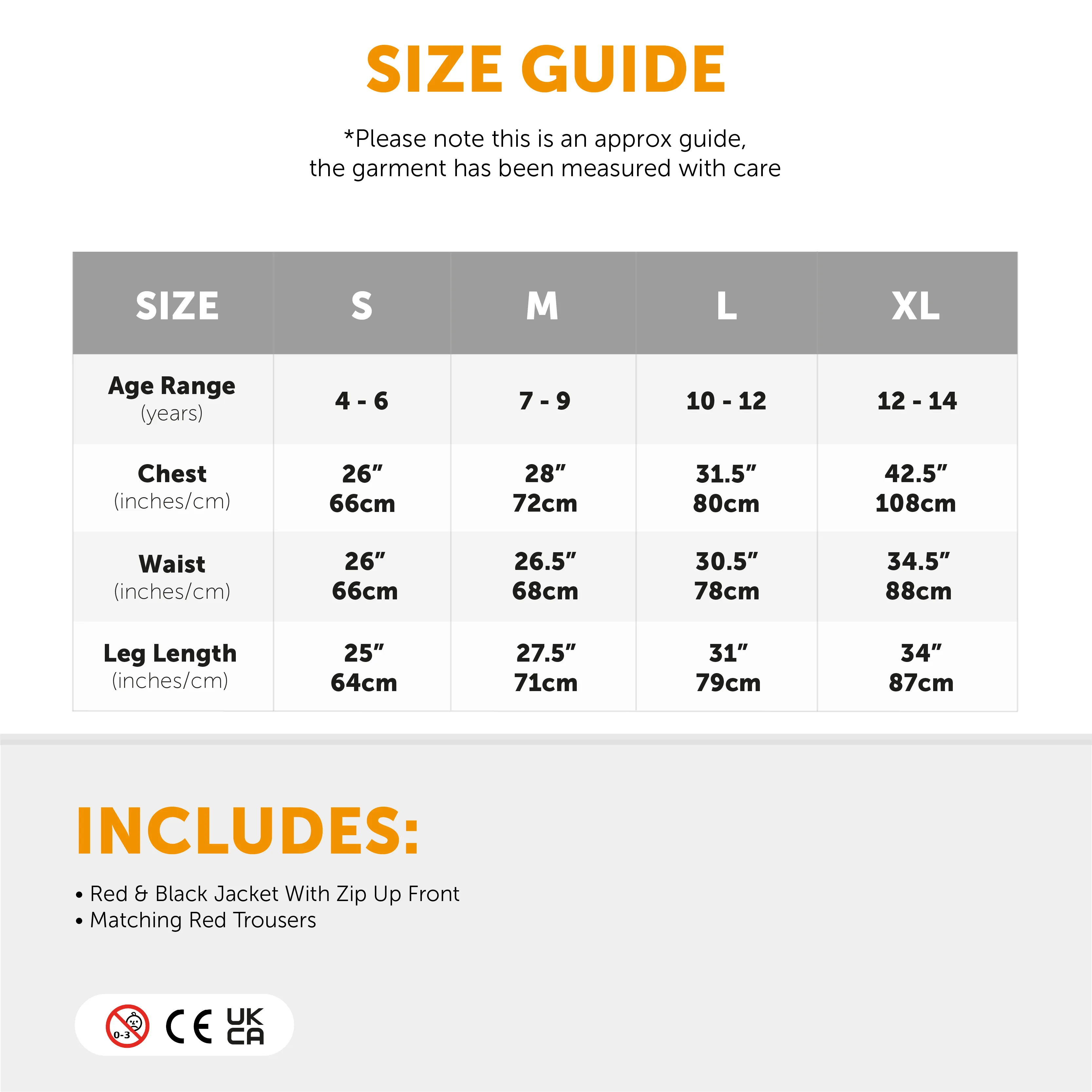 - X-Large (12–14 years): Chest 42.5" (108cm) | Waist 34.5" (88cm) | Leg Length 34" (87cm)