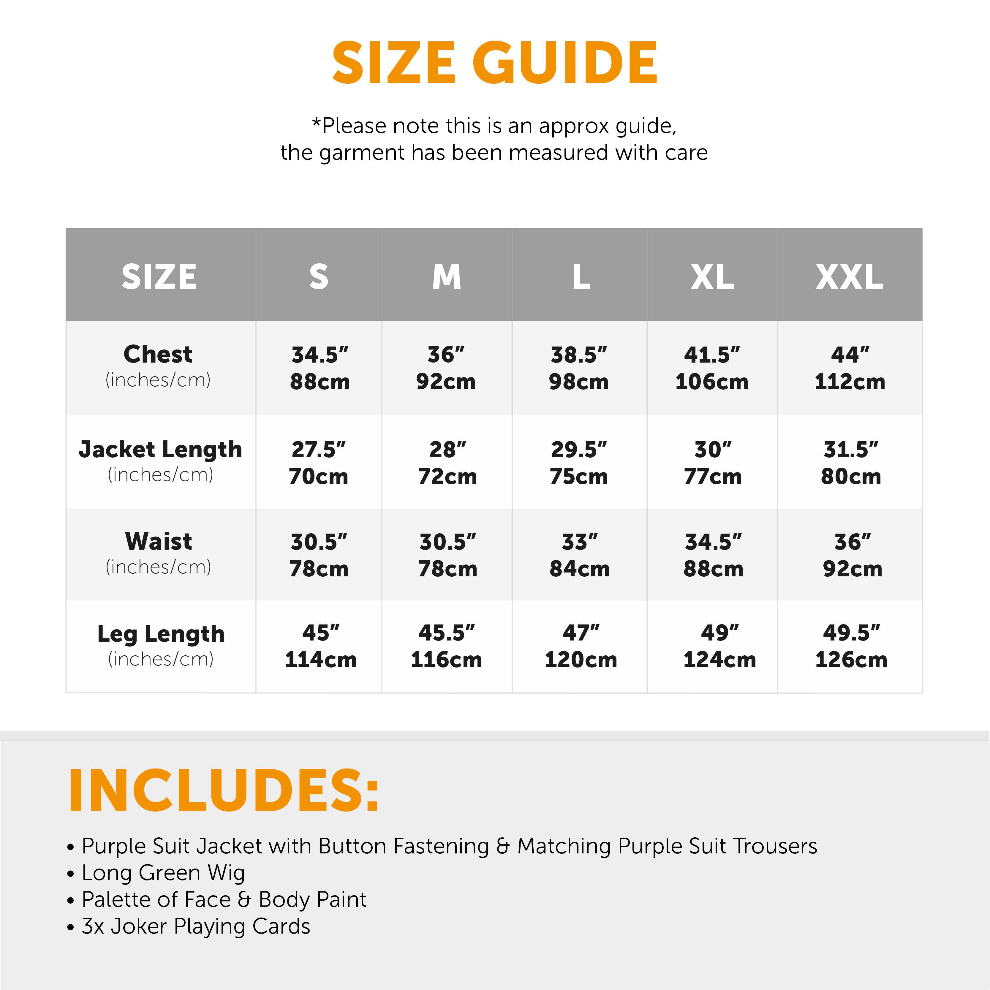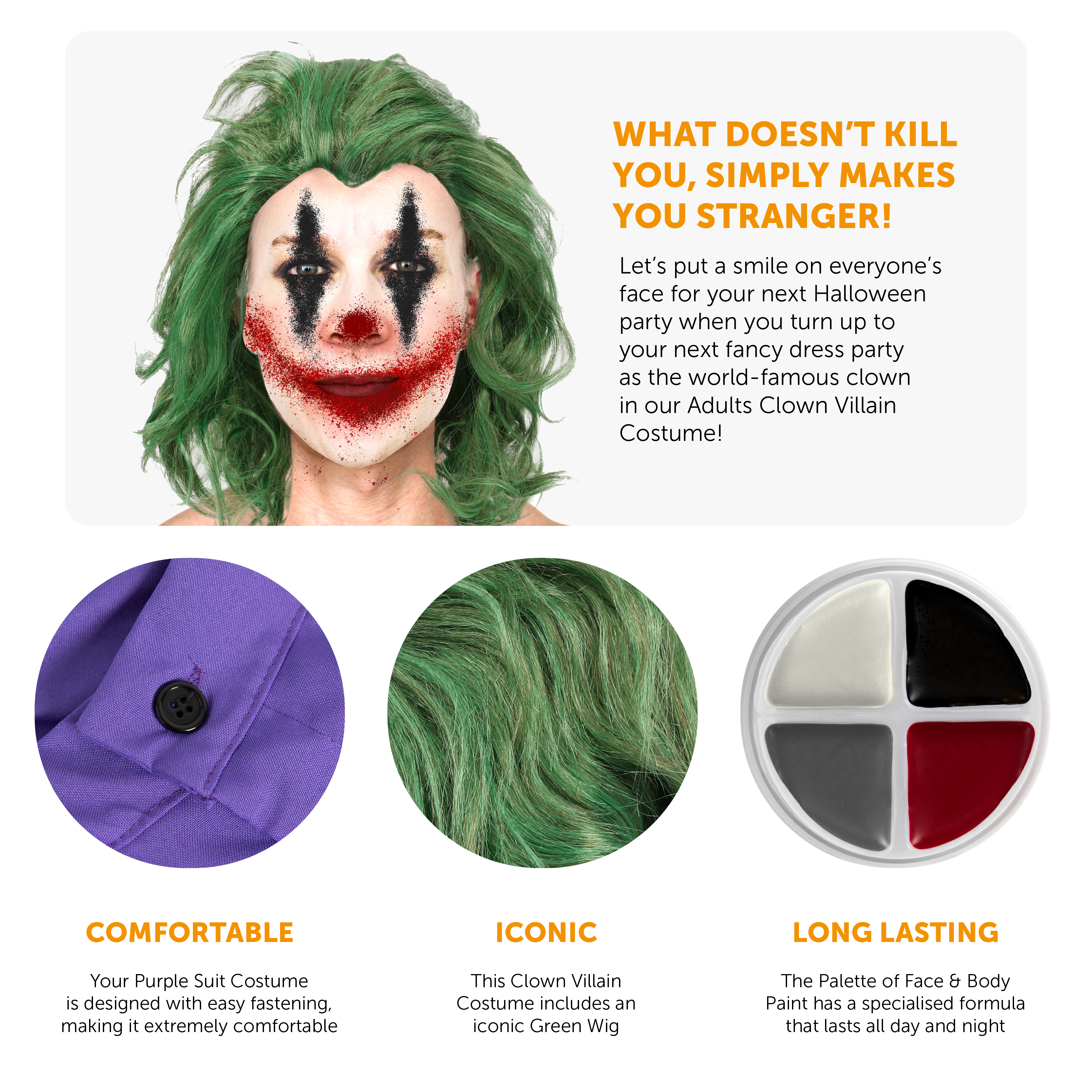 COSTUME INCLUDES: This Adults Clown Villain Costume includes a long, slicked-back Green Wig, a palette of Face and Body Paint, a Purple Suit Jacket with matching Trousers, and 3x Joker Playing Cards, the perfect Costume for Halloween and other fancy dress themed events!