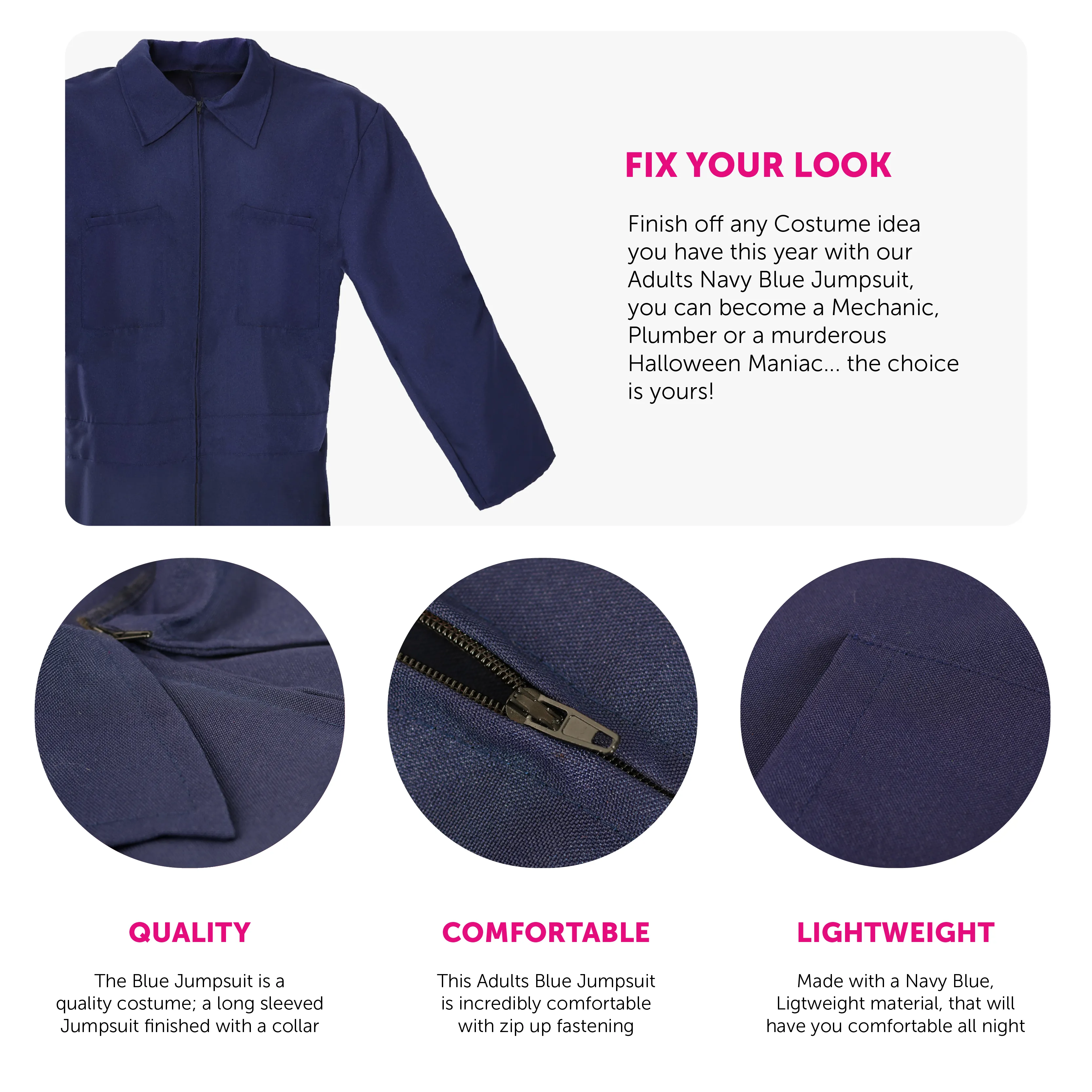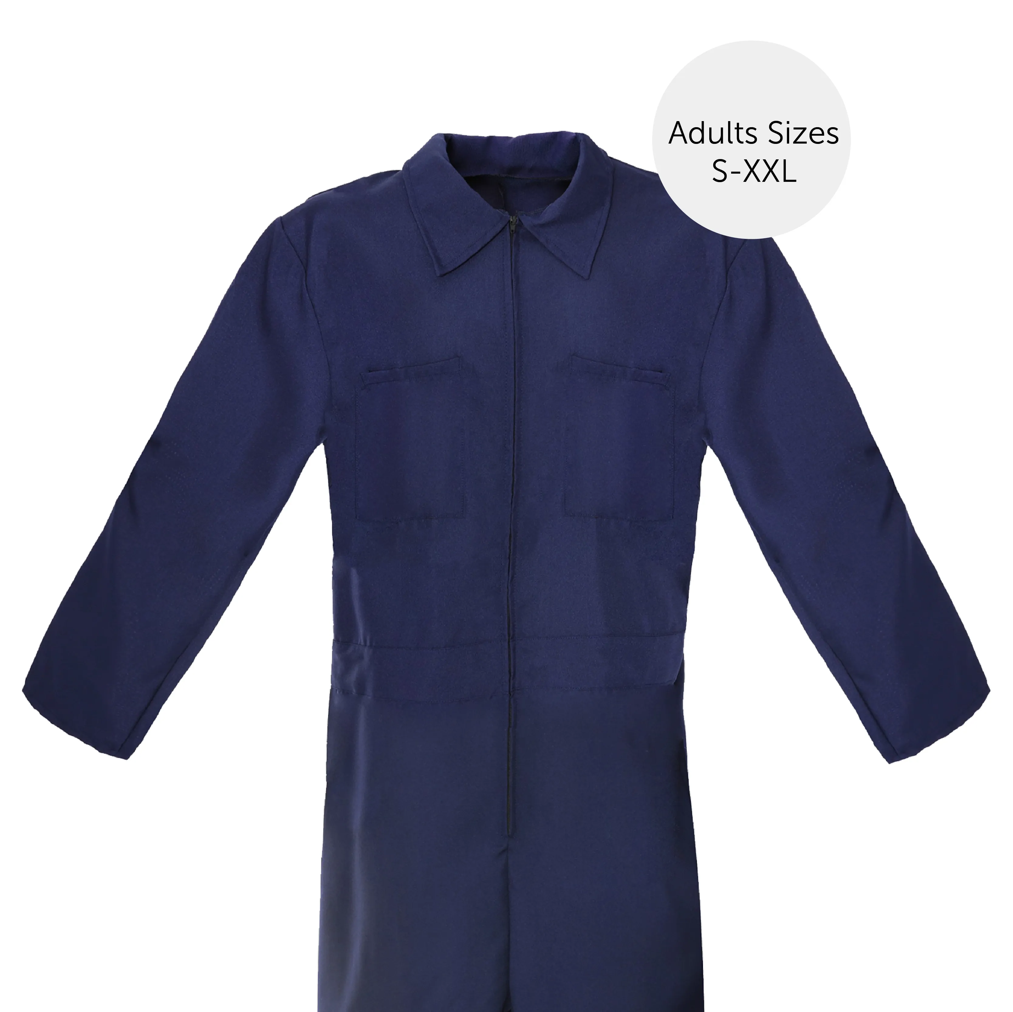 COSTUME INCLUDES: This Adults Halloween Killer Costume includes a Navy Blue, all-in-one, long sleeved Jumpsuit with comfortable zip up fastening, a creepy Male Face Mask, and a Plastic Knife Prop with Blood Splatters on the blade, the perfect Costume this Halloween!