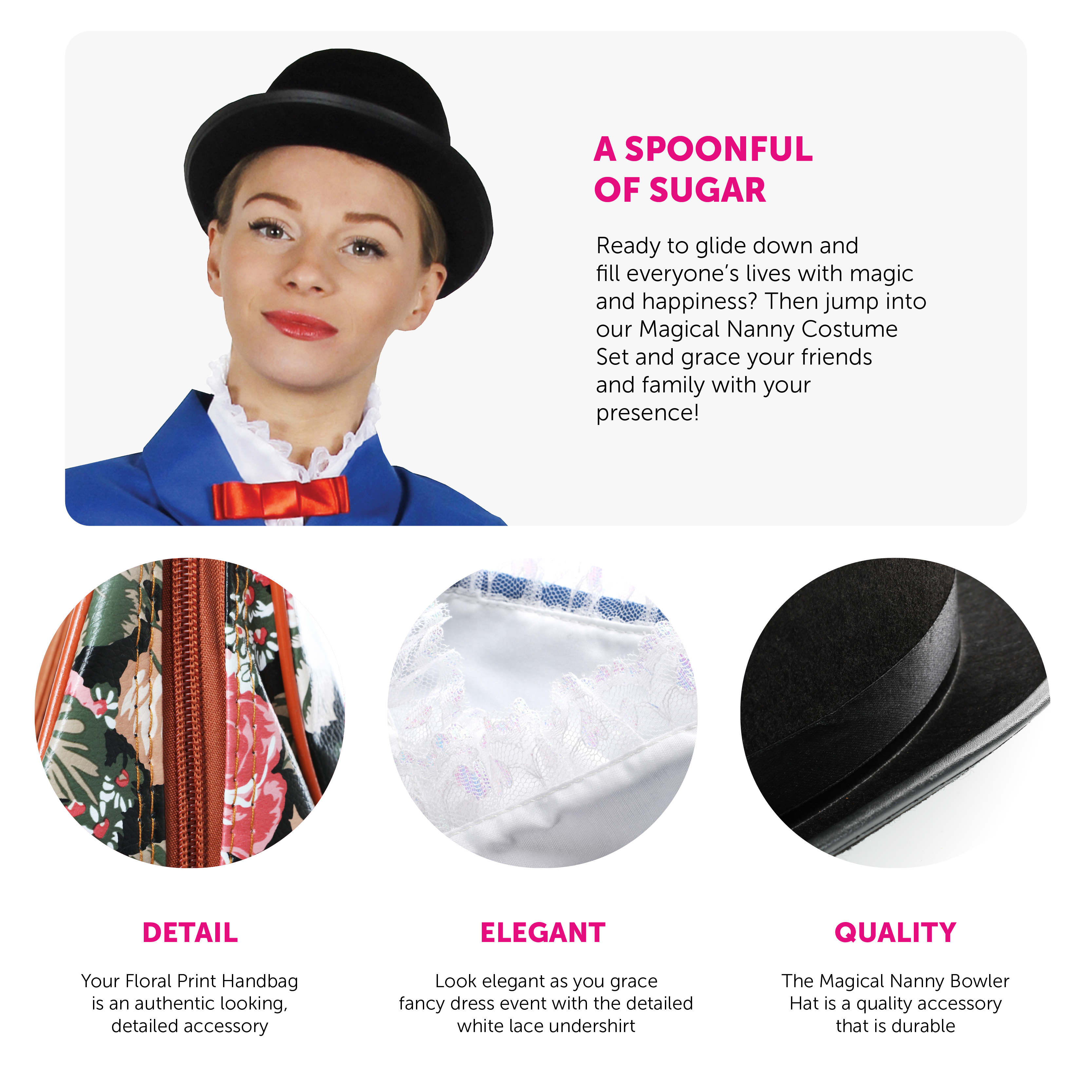 LADIES MAGICAL NANNY COSTUME SET: Ready to glide down and fill everyone’s lives with magic and happiness? Then jump into our Magical Nanny Costume Set and grace your friends and family with your presence!
