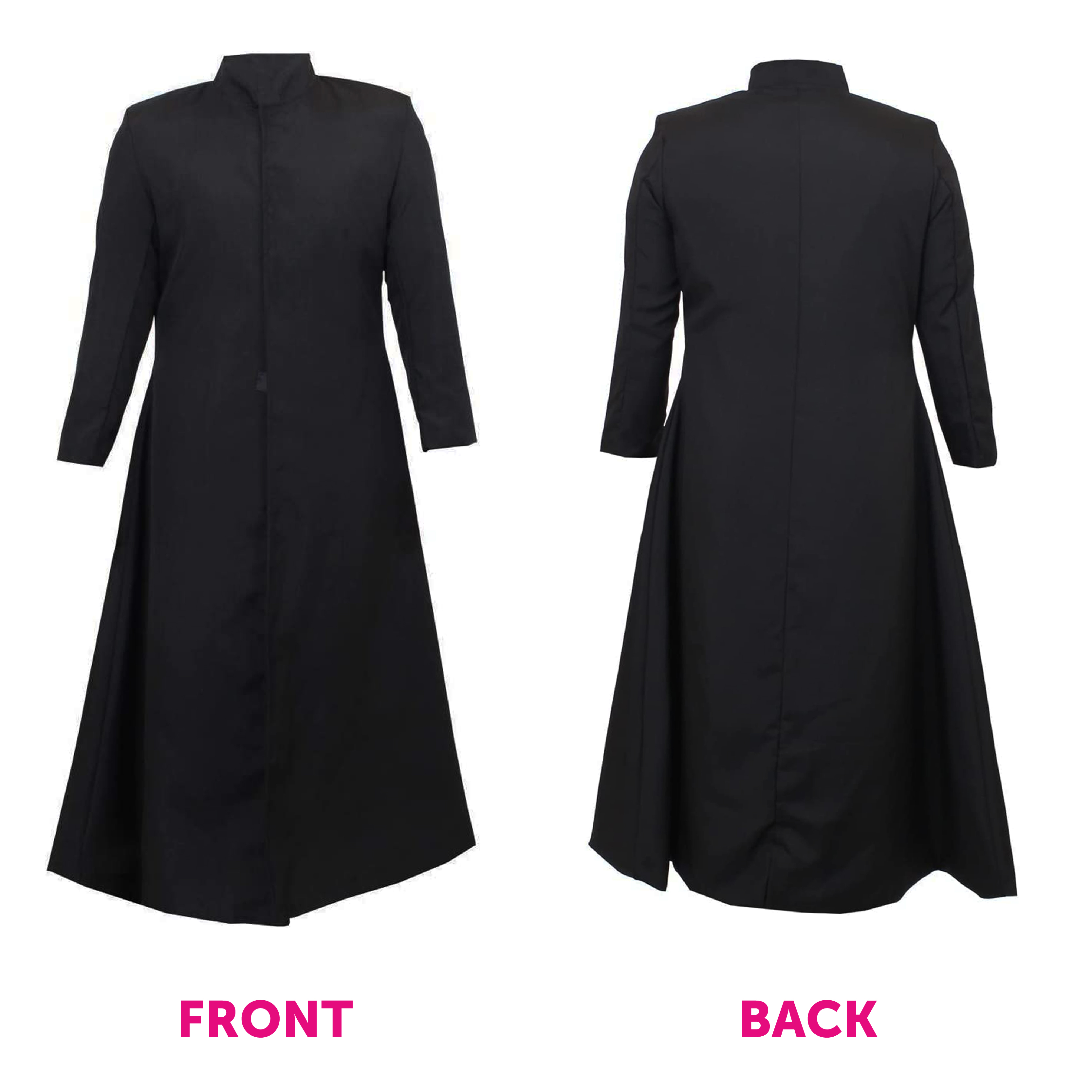 COSTUME SET INCLUDES: This Prince of Darkness Costume Set includes a long, Black Duster Jacket, a long, Black Wig, Round Glasses, a Large, Gold Plastic Cross on a Necklace, and a 3 Piece, Screwable Black Cane with a detailed Silver Topper, the perfect accessory set for your Prince of Darkness Outfit!