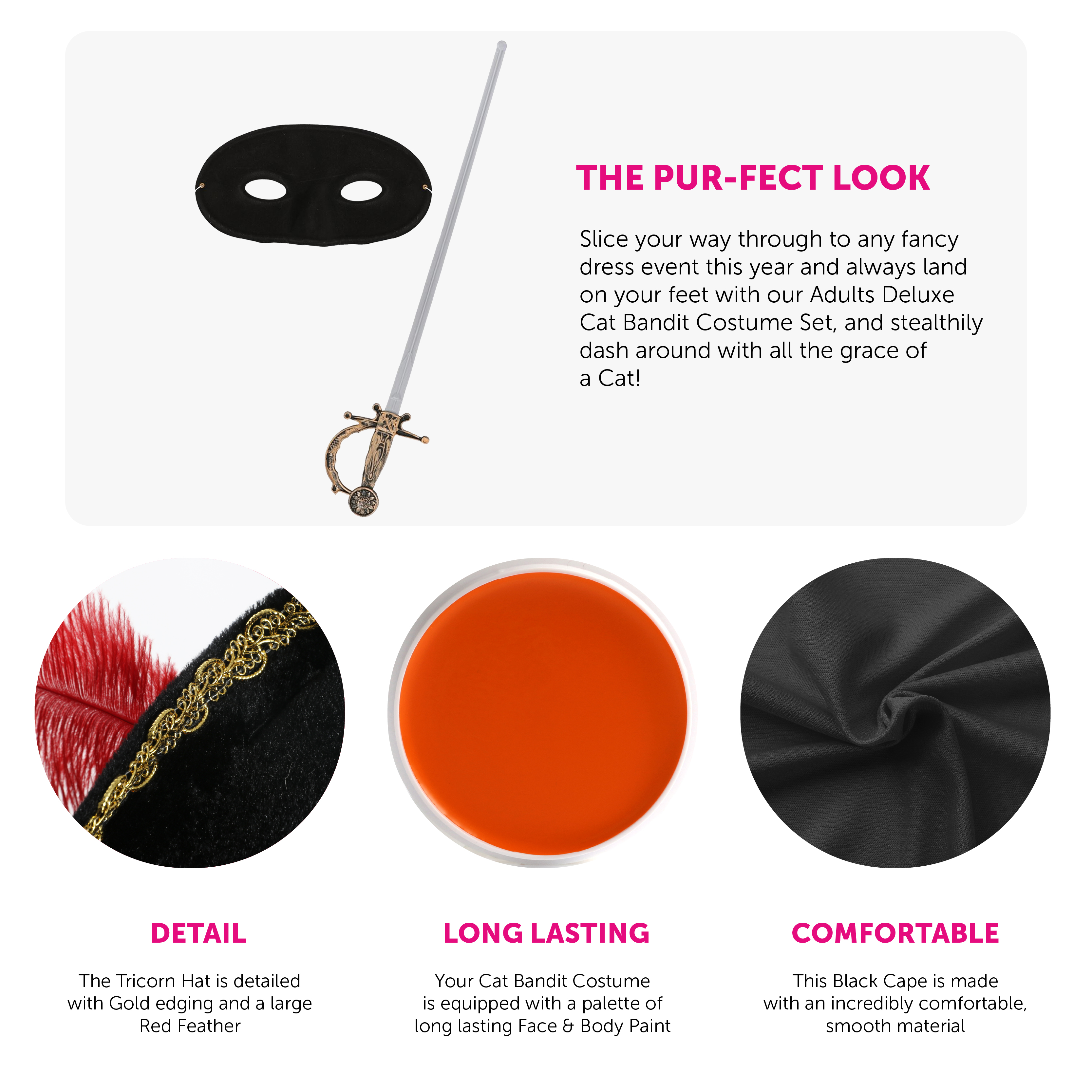 Adult's Deluxe Cat Bandit Costume - with Sword, Orange & White Face Paint, Tail, Gloves, Belt & Cat Mask £19.99