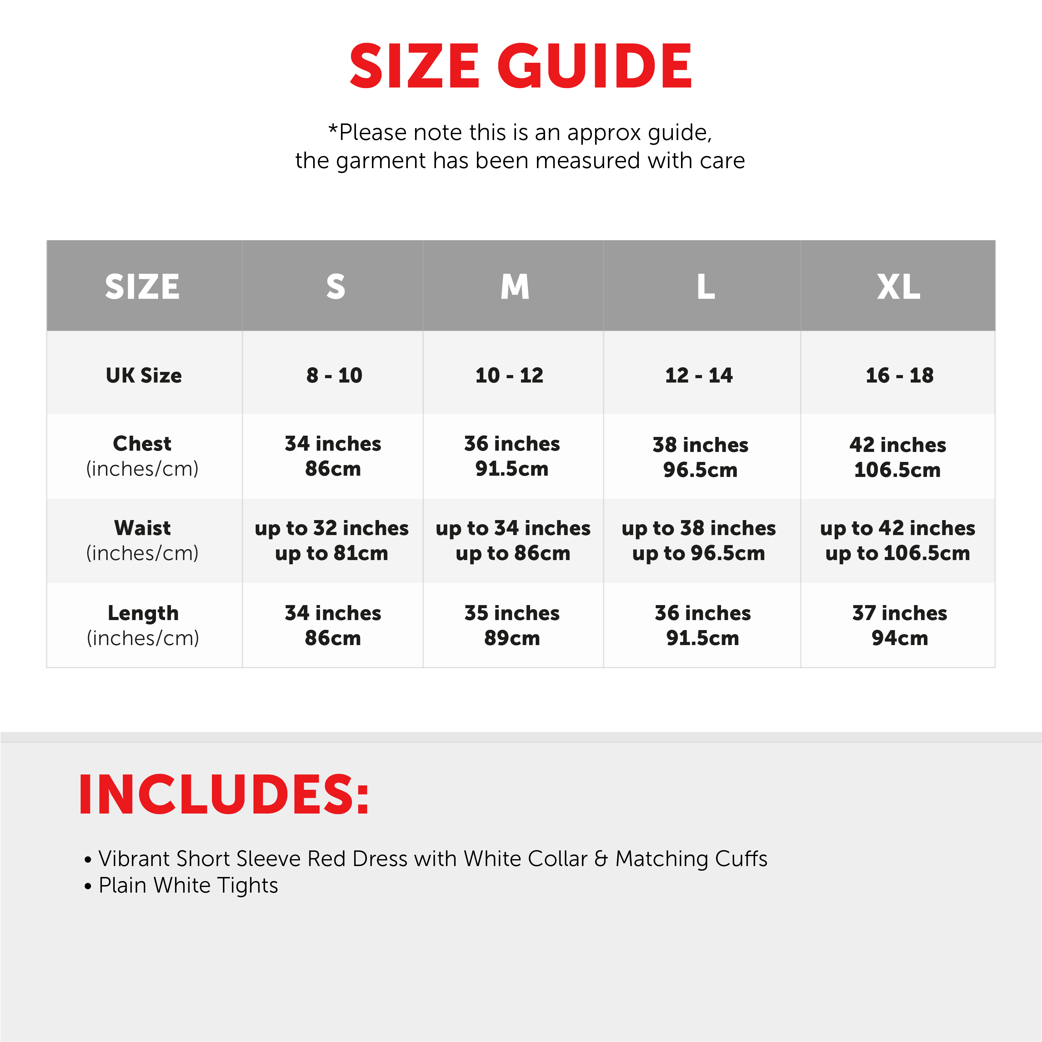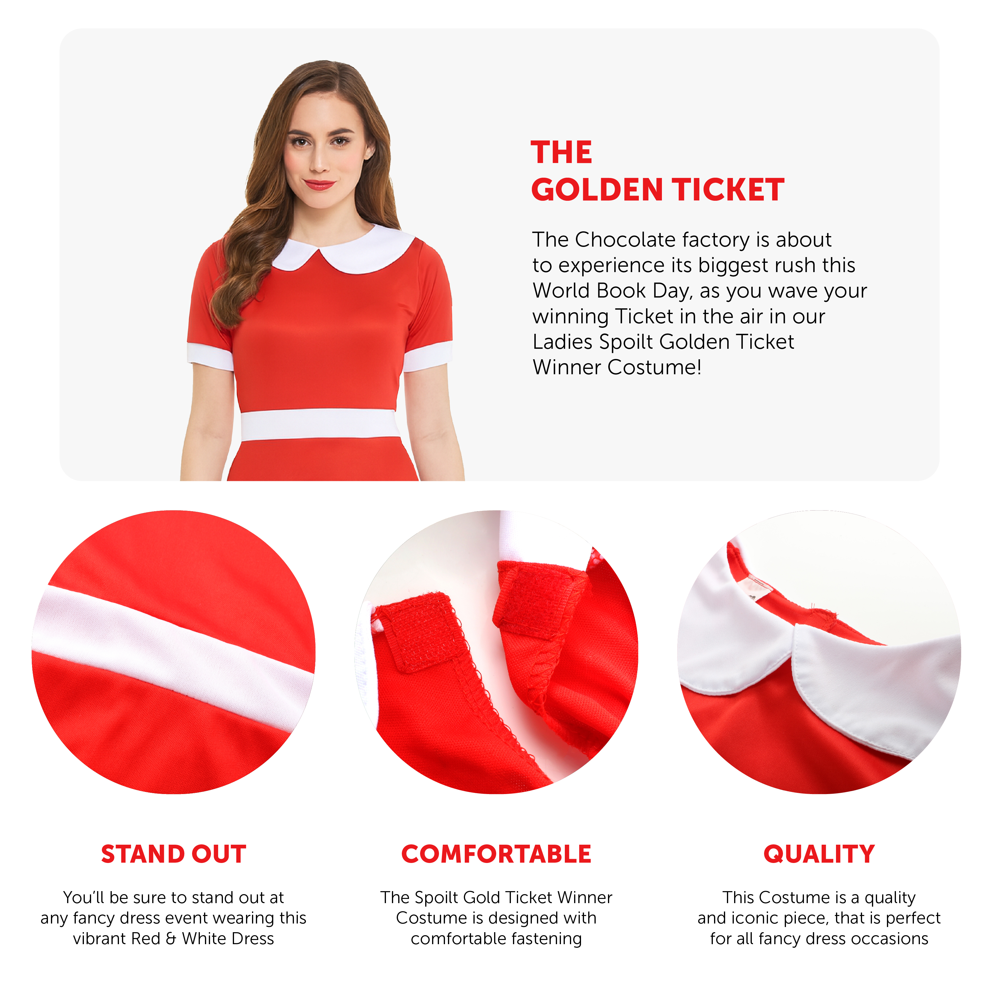 COSTUME INCLUDES: This Ladies Spoilt Gold Ticket Winner Costume includes a Red Dress with a White Collar & Cuff detailing, and a pair of Plain White Tight, the perfect look for any fancy dress occasion!