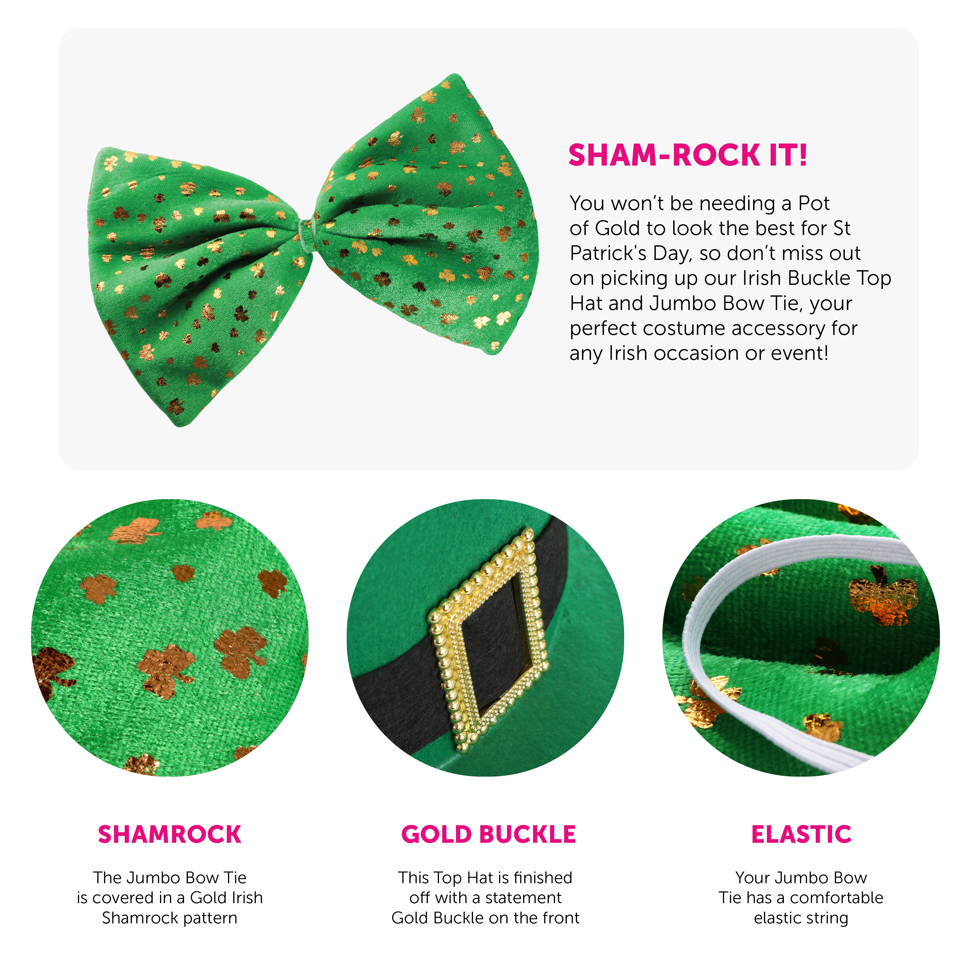 IRISH BUCKLE TOP HAT & JUMBO BOW TIE: You won’t be needing a Pot of Gold to look the best for St Patrick's Day, so don’t miss out on picking up our Irish Buckle Top Hat and Jumbo Bow Tie, your perfect costume accessory for any Irish occasion or event!
