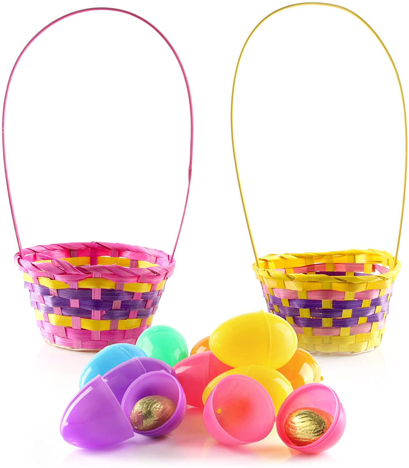 EASTER EGG BASKET SET INCLUDES: Your Easter Basket set includes 3 LargeYellow and 3 Large Pink Baskets, and 36 Easter Egg Capsules all together in one place for you to gather with your friends and family!