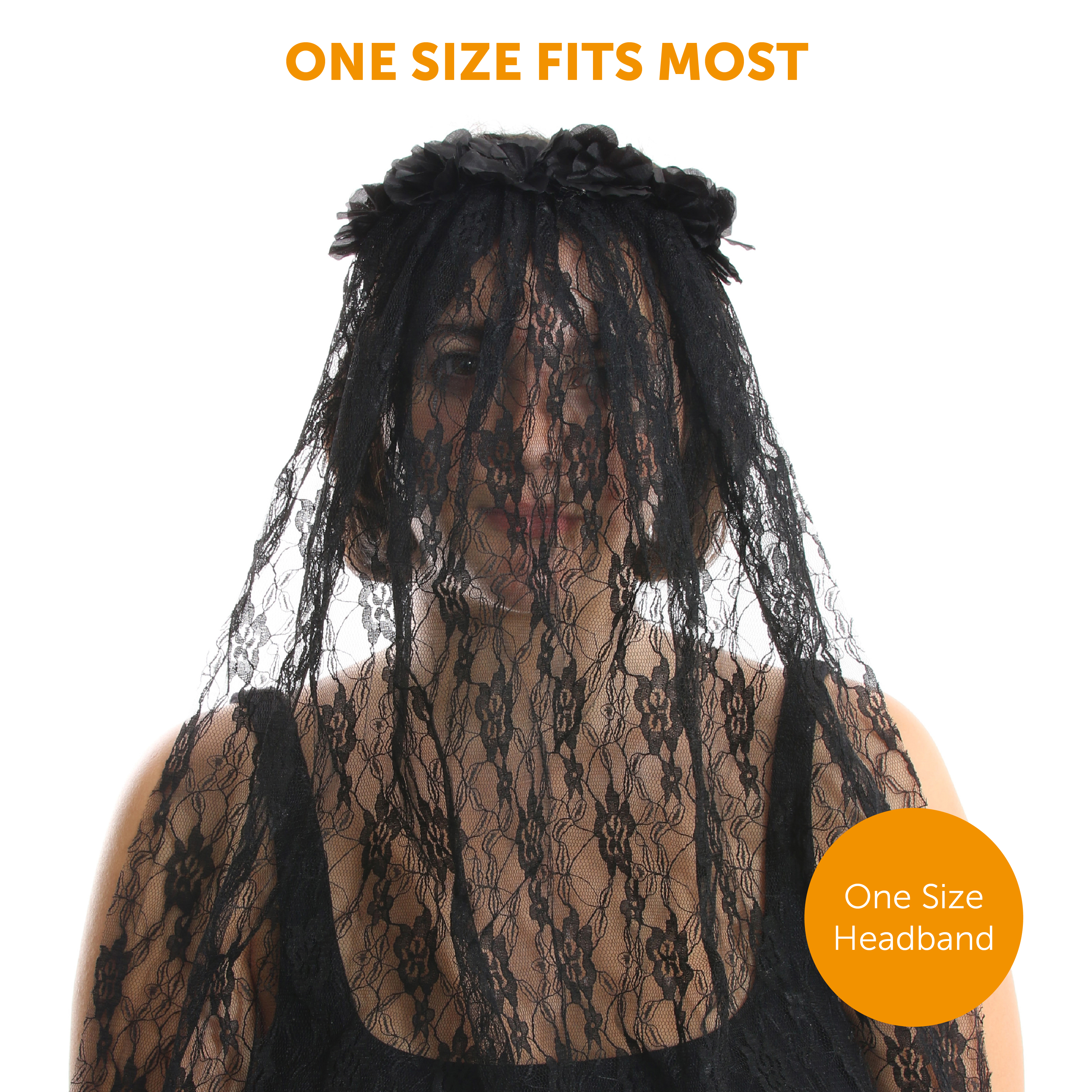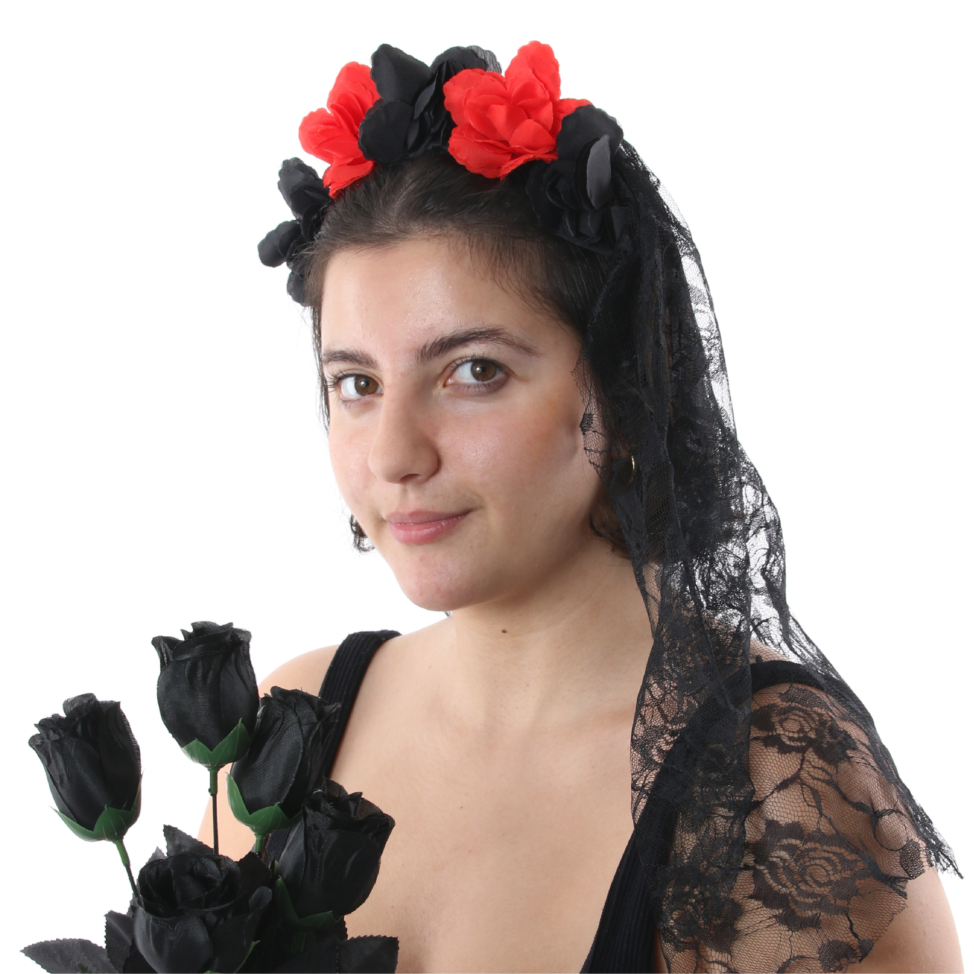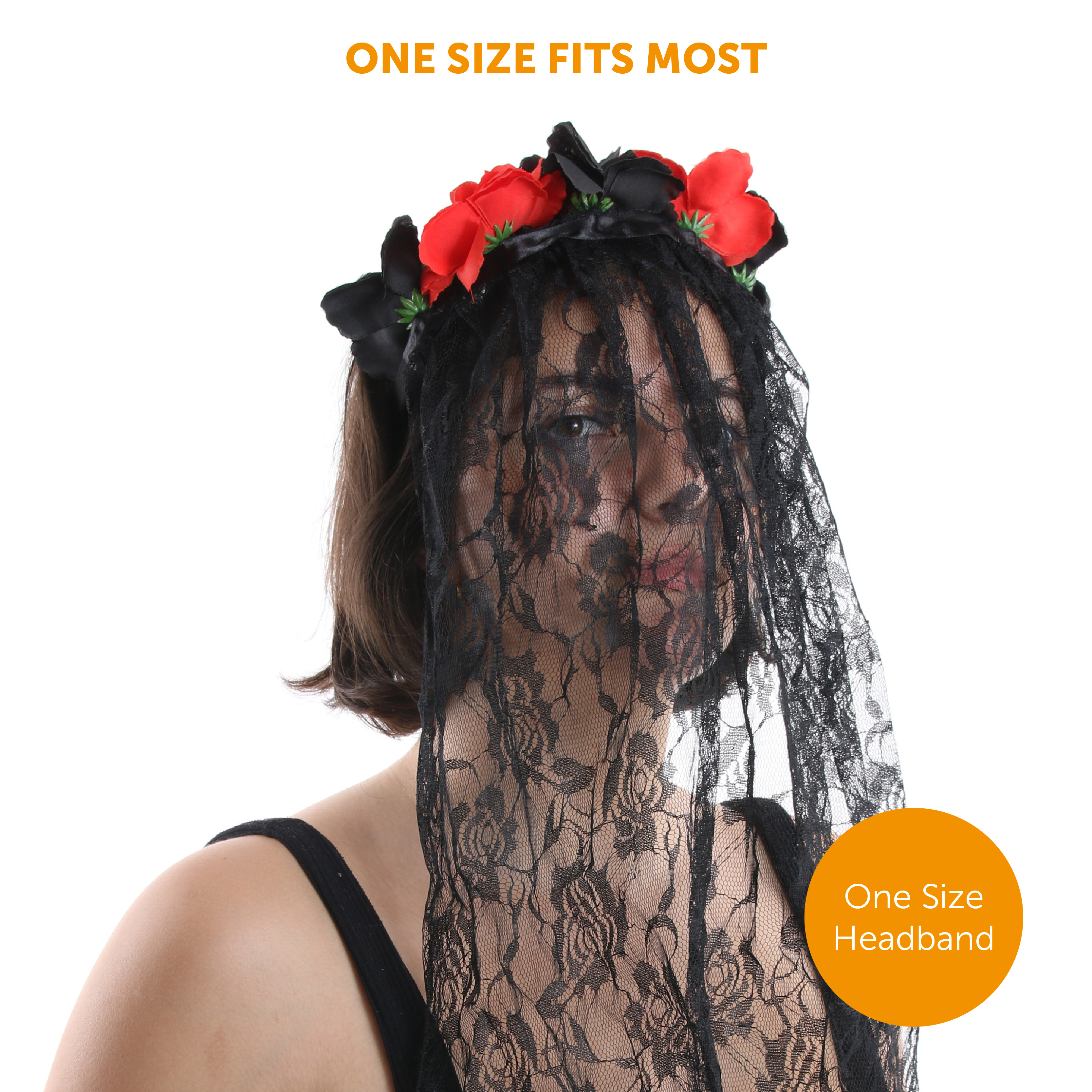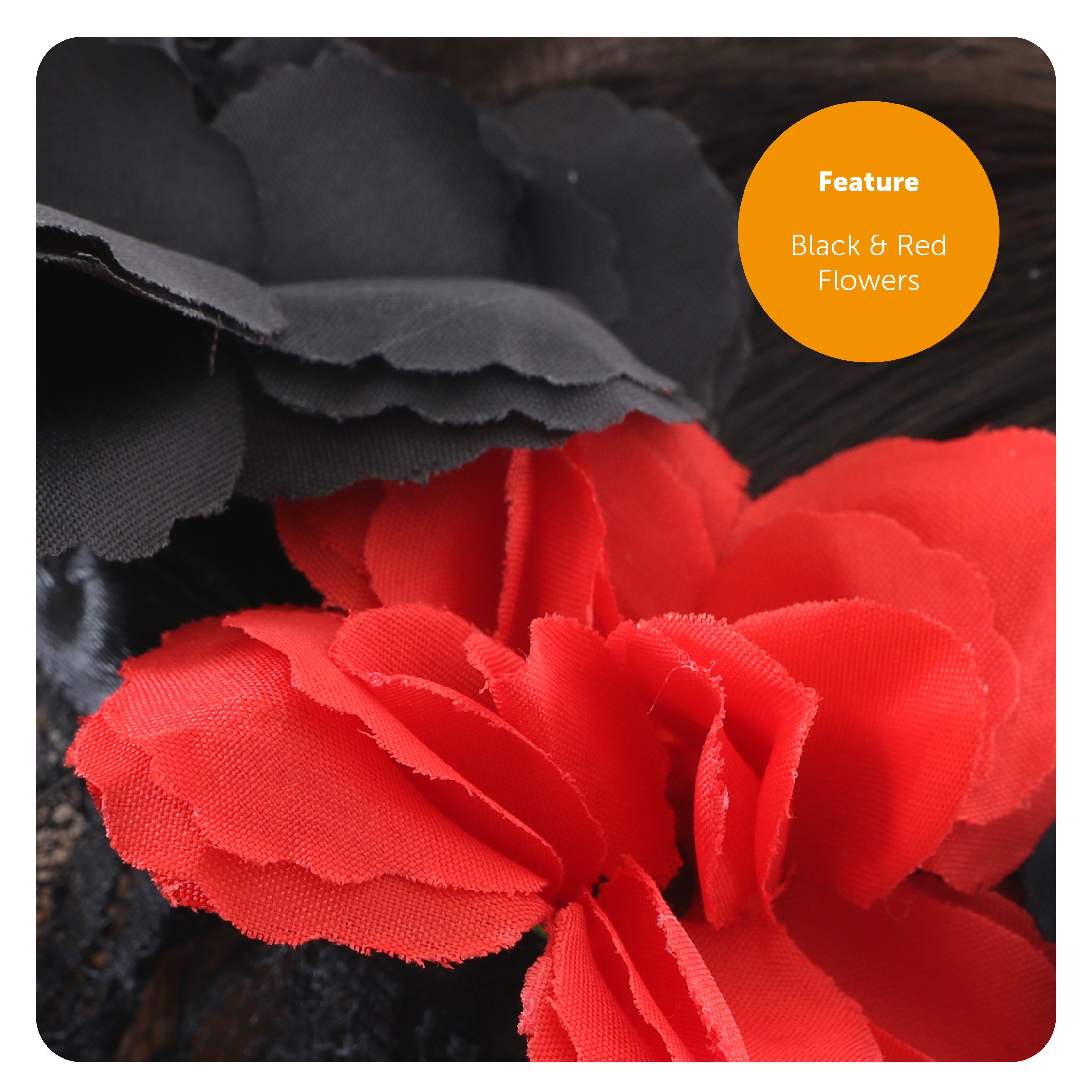 ONE SIZE FITS MOST: Attached to a comfortable one sized Headband, this Black and Red Rose Floral Veil can be worn over the face or swept back, it is the perfect accessory for your Costume!