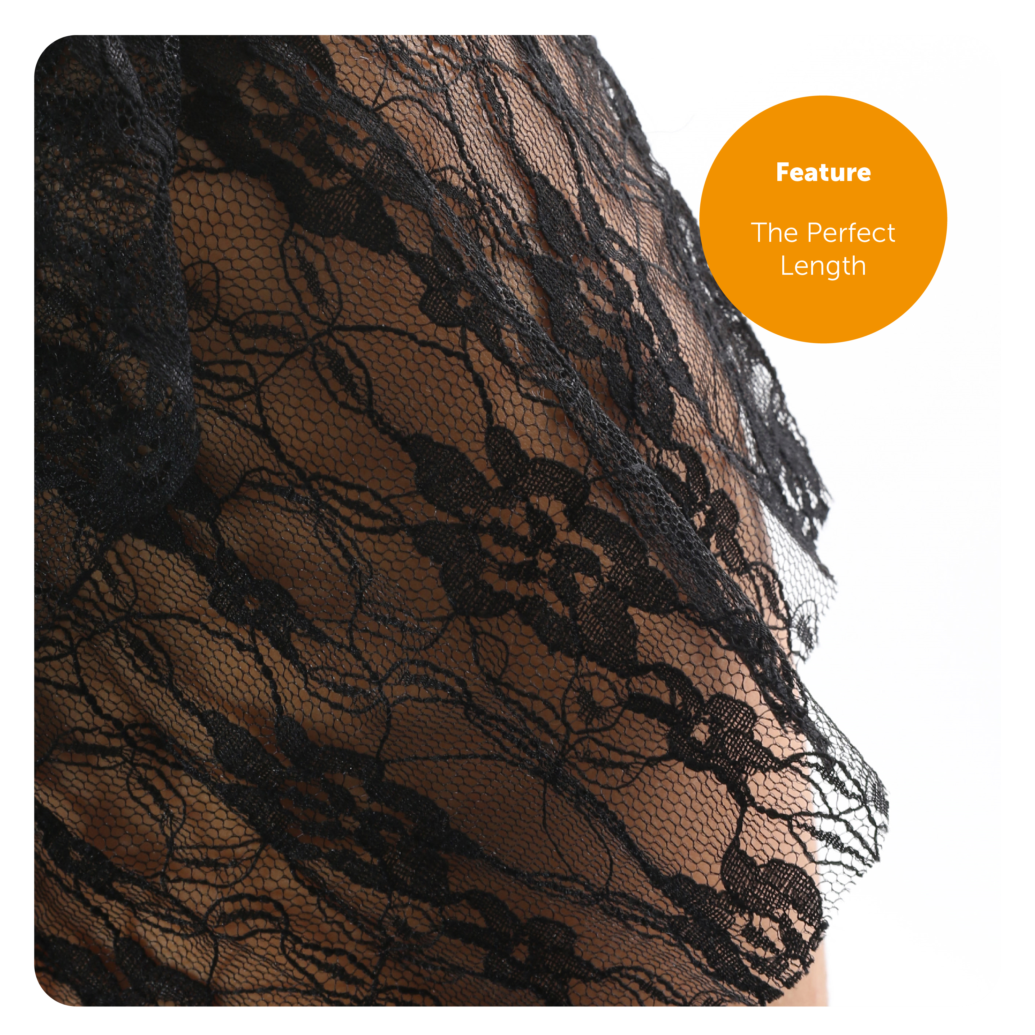 VEIL DETAILS: Your Veil is a Long Black Lace Veil with a delicate Floral Pattern, attached to a Black Headband with Black and Red Roses on top! The Veil can be worn over the face, or can be swept behind your head, the perfect Accessory Set to accompany your look this Halloween!