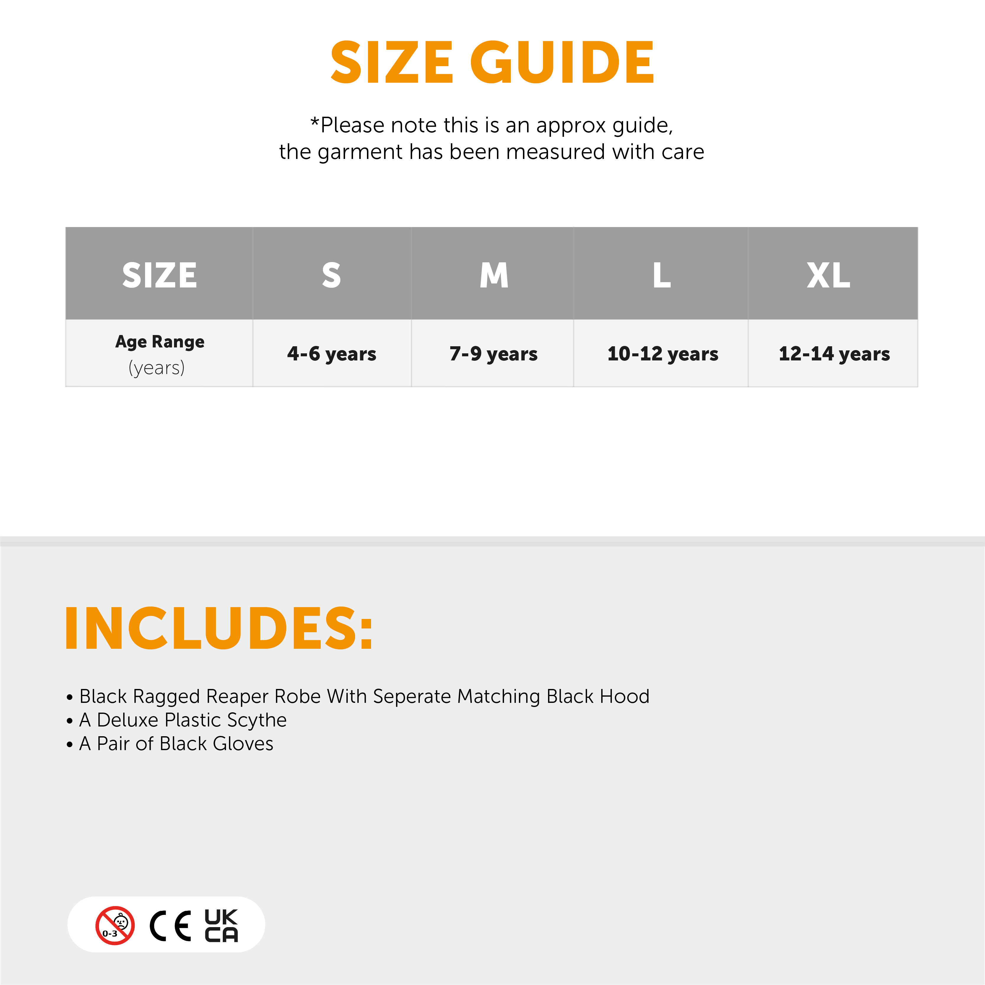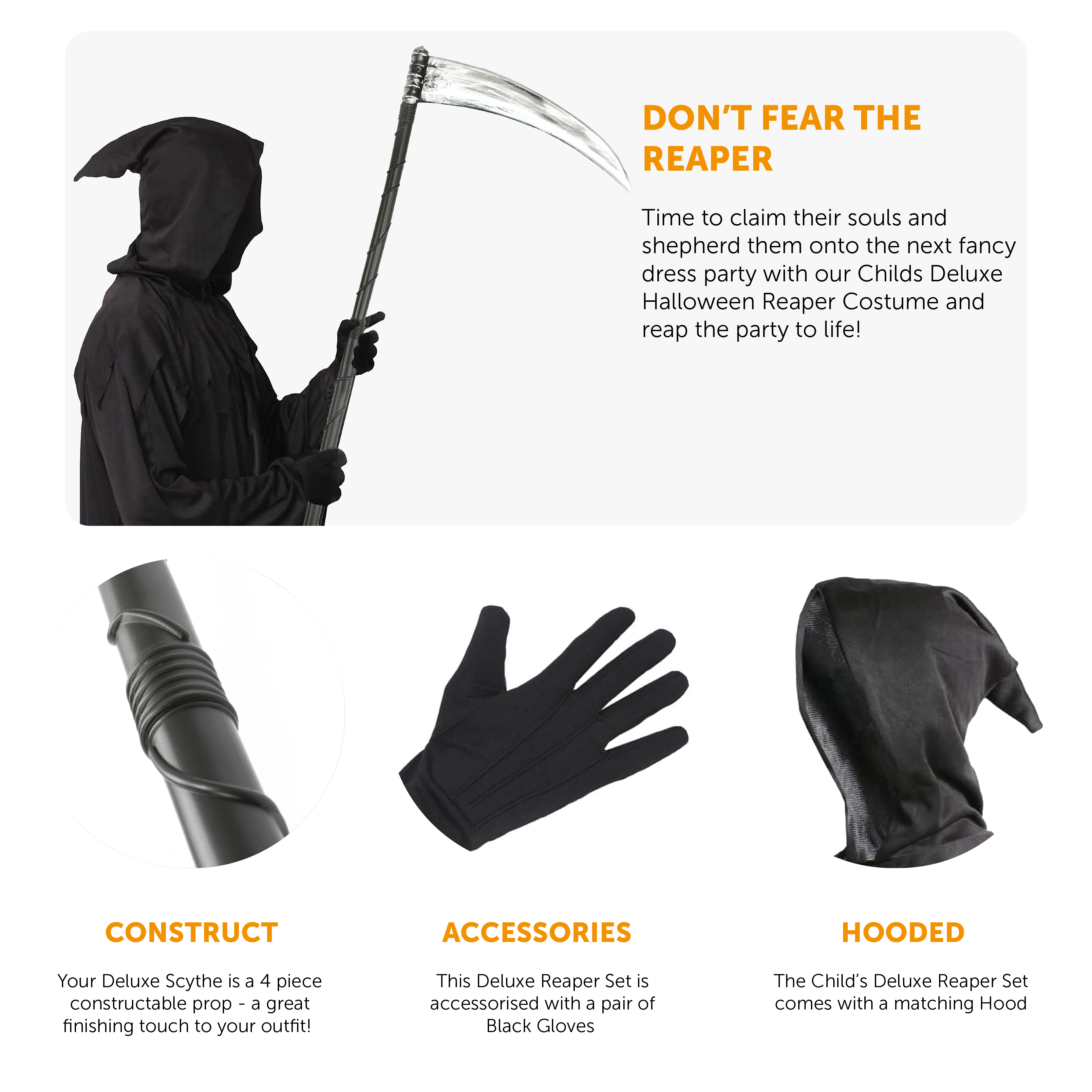 - INCLUDES: Costume, Deluxe Scythe, Gloves and the option to add Facepaint.