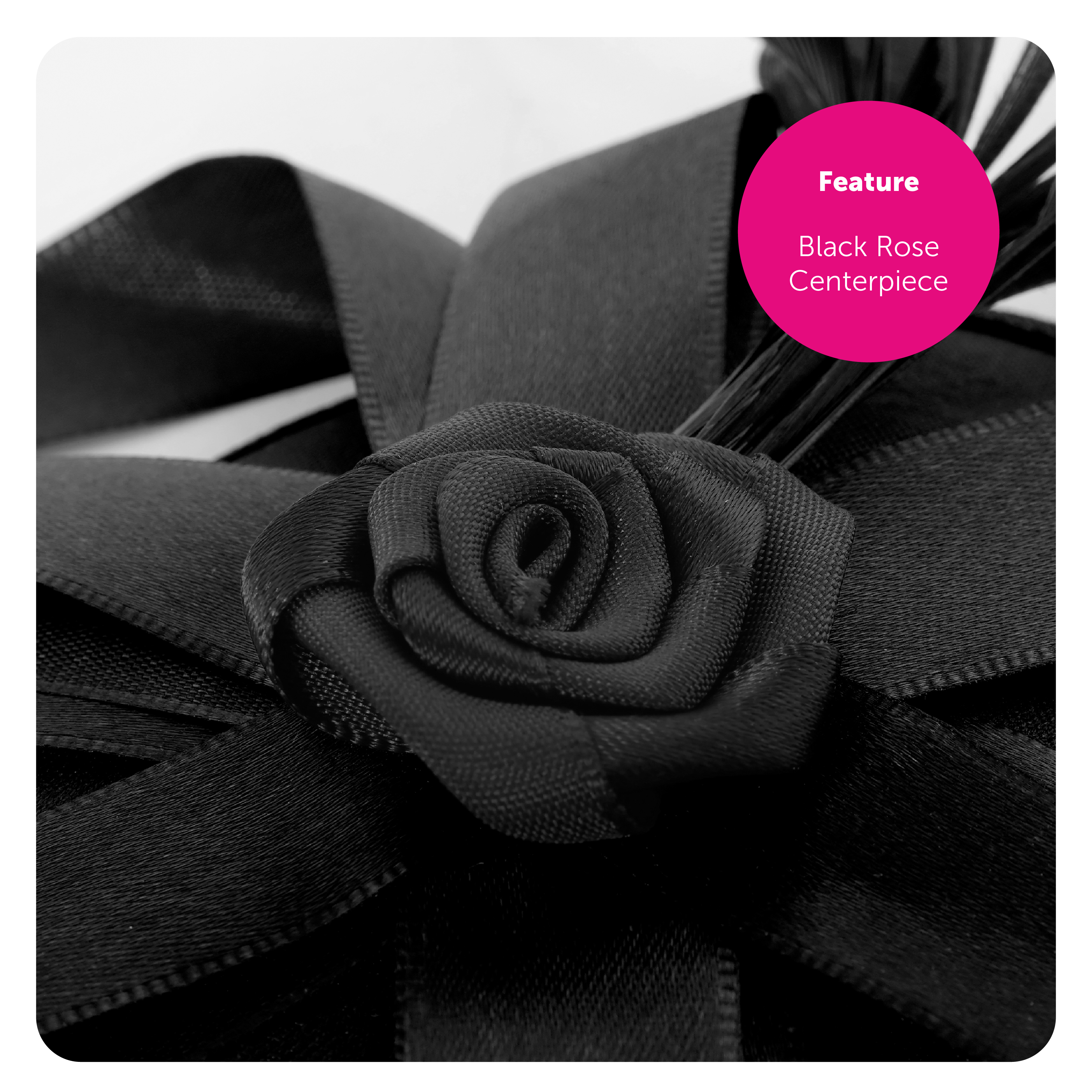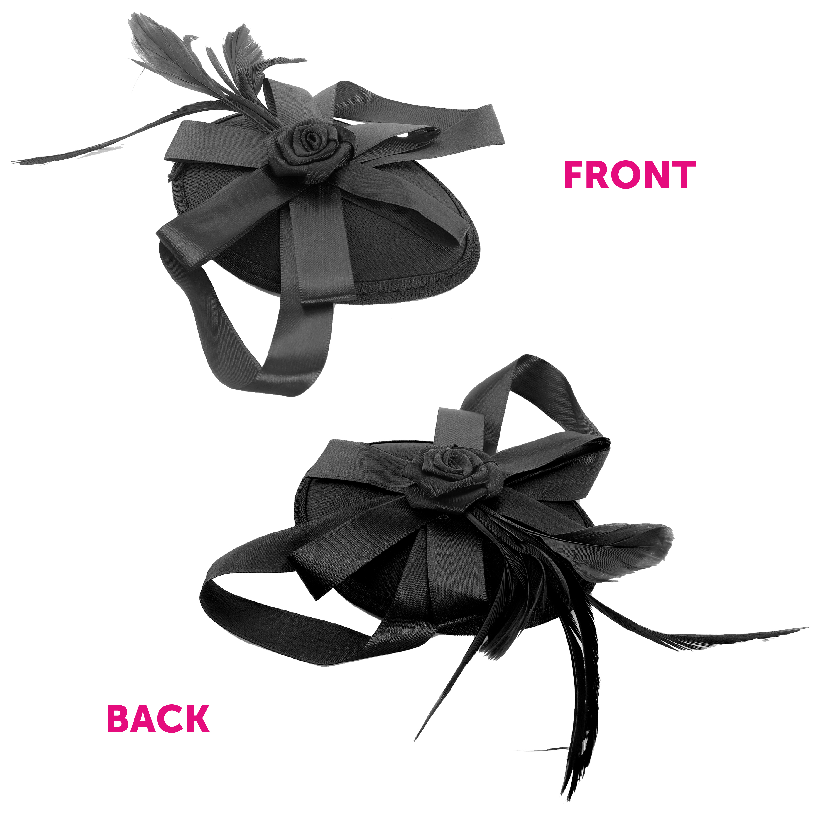HEADPIECE DETAILS: This Fascinator Headpiece is a Black Satin Headpiece with looped Ribbon, a Black Rose in the middle, small Black Feathers and hair grips on the underside for a simple and stand out look!