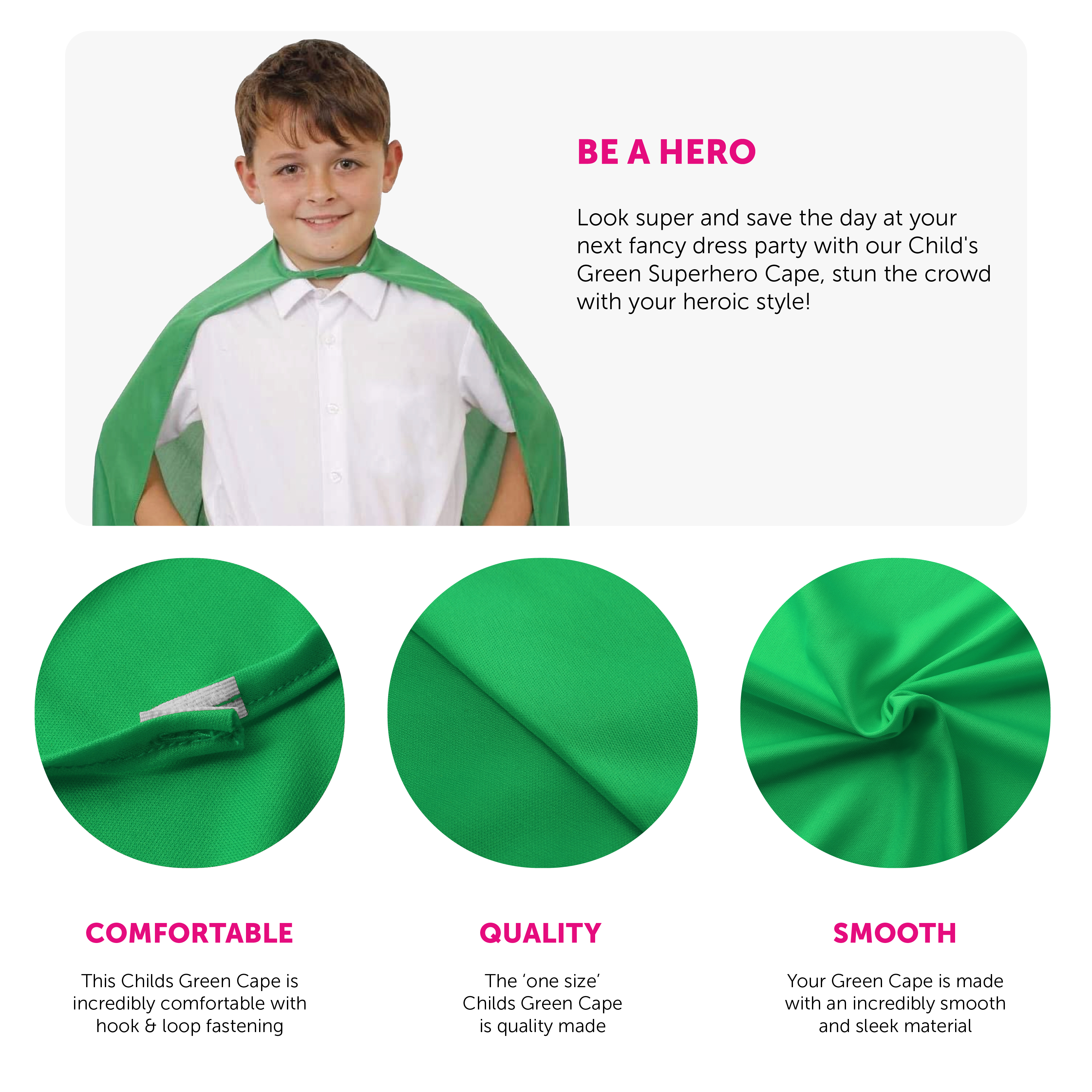 CAPE DETAILS: This Child's Superhero Cape is a long Green Cape with hook and loop fastening on the front for a comfortable fit, the perfect addition to any outfit!