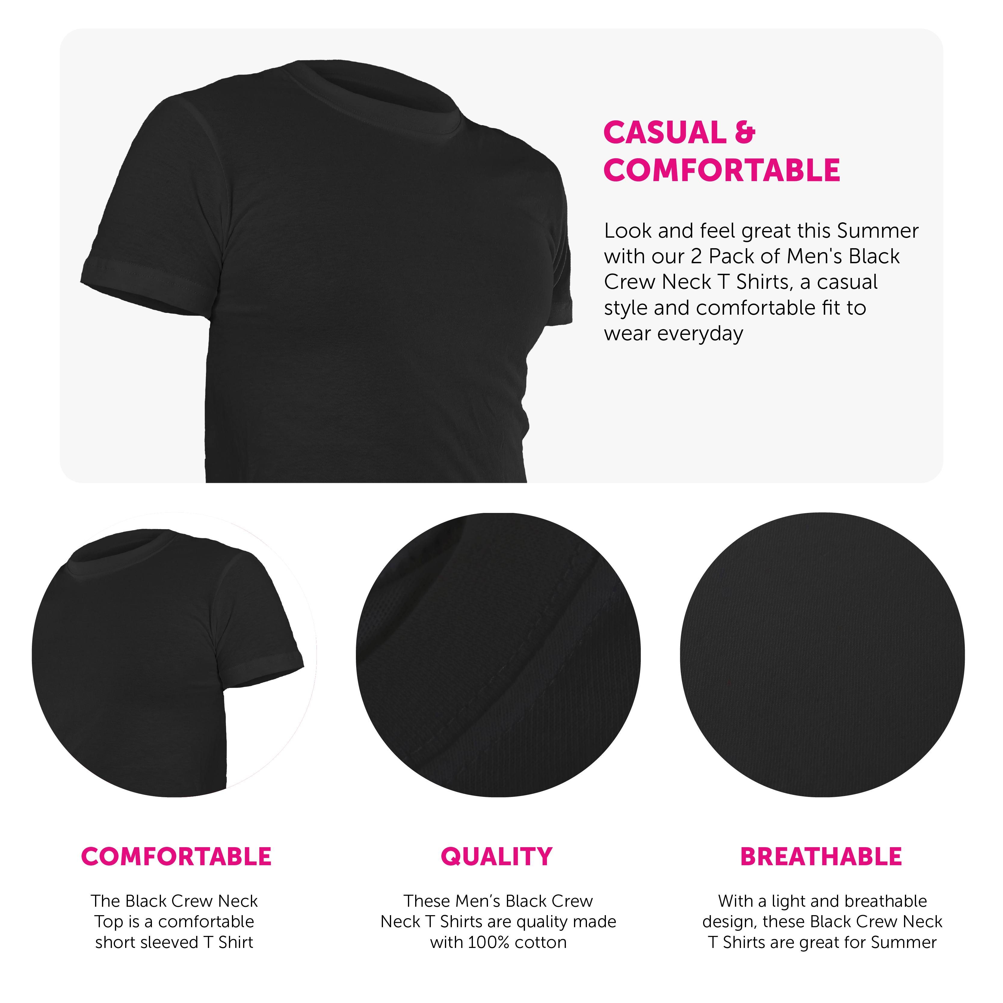 T SHIRT DETAILS: This Pack includes 2x high quality Black Crew Neck T Shirts, made with 100% cotton, they are lightweight T Shirts and perfect for Summer and casual wear