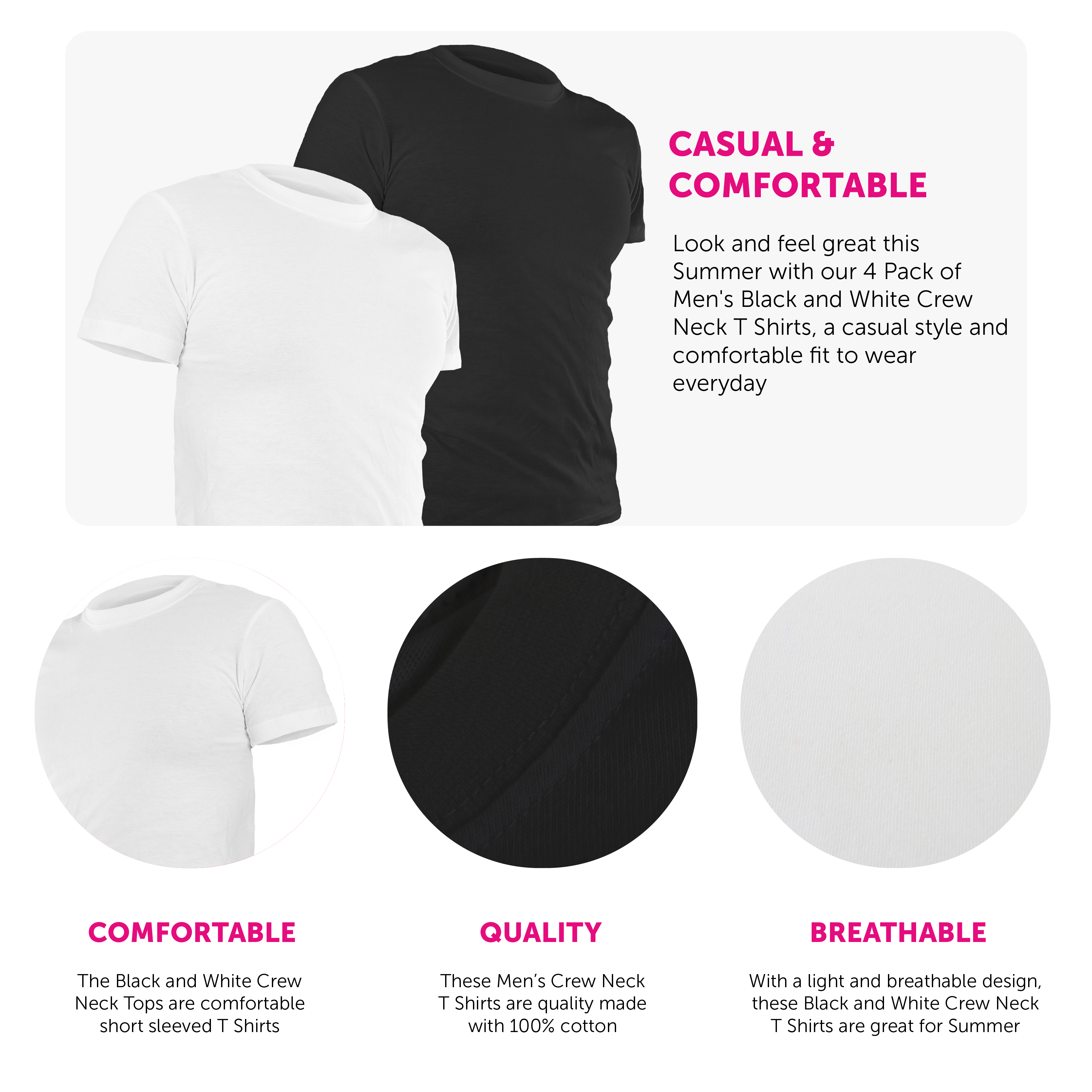 4 PACK BLACK & WHITE CREW NECK T SHIRTS: Look and feel great this Summer with our 4 Pack of Men's Black and White Crew Neck T Shirts, a casual style and comfortable fit to wear everyday