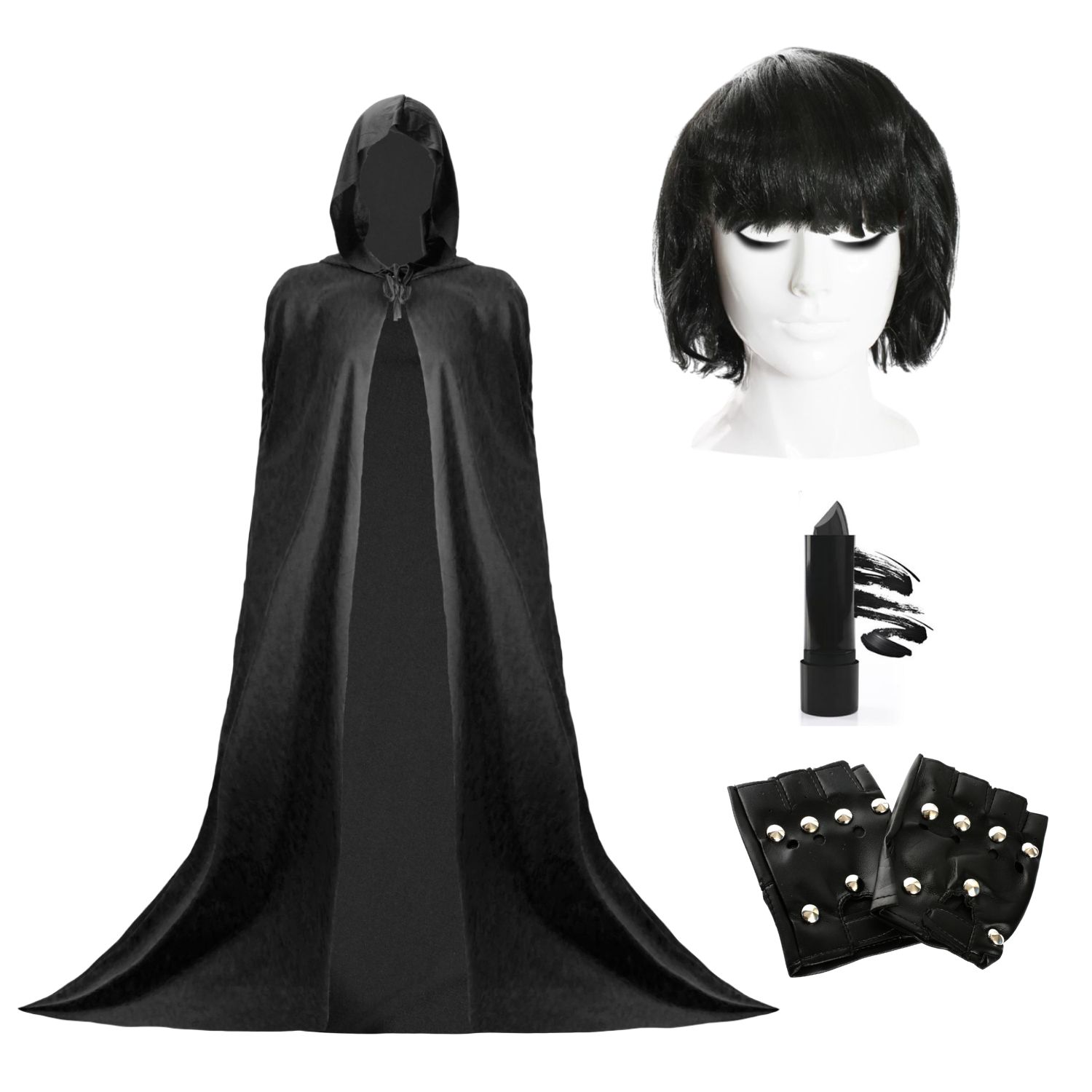 A long black hooded cape, sleek black wig, black gloves, and a bold red lipstick to complete your striking transformation.