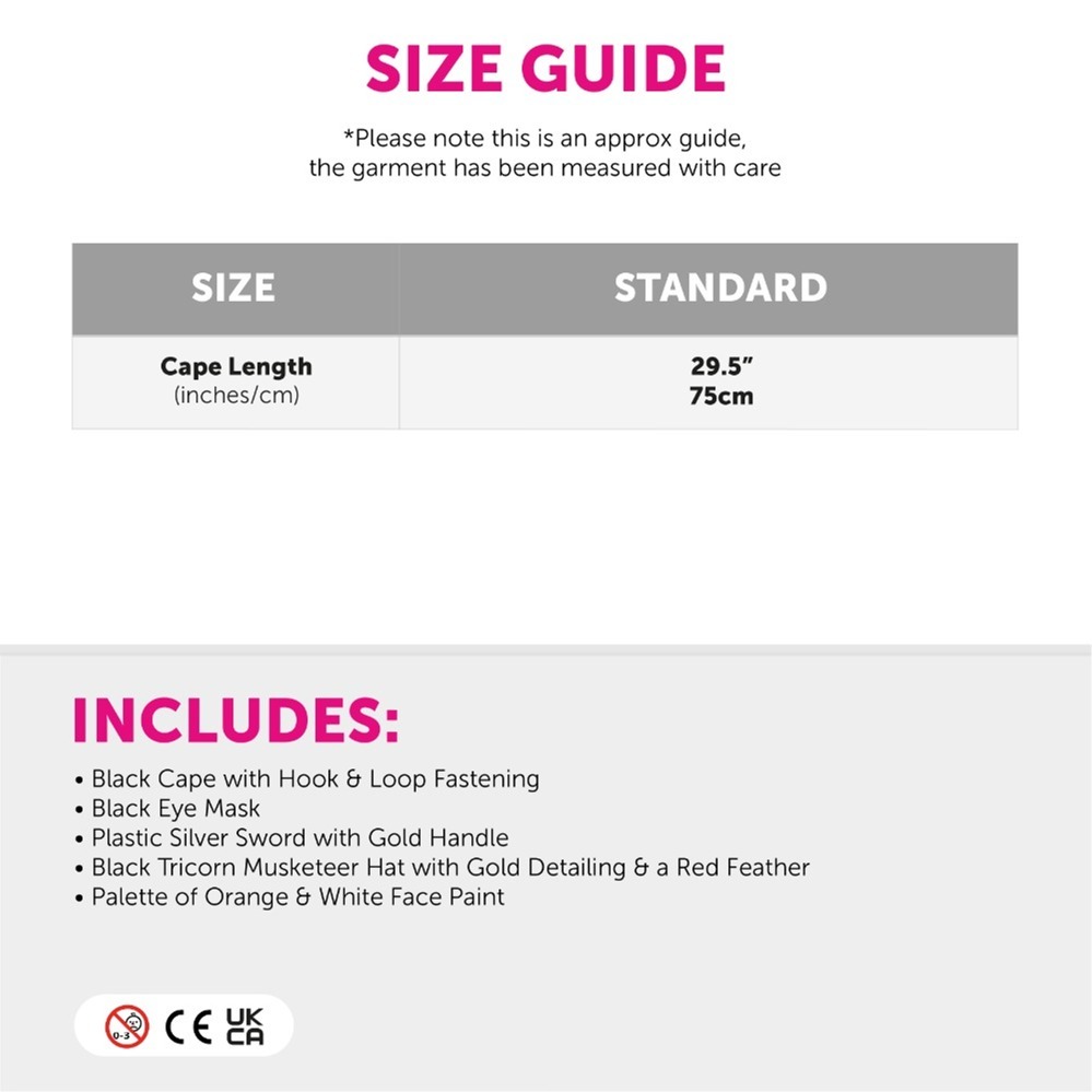 Your Child's Deluxe Cat Bandit Costume Set is designed to be a comfortable one size, making it easy to wear at any fancy dress event. The Child's Black Cape is 75cm (29.5") in length and the Child's Tricorn Hat fits head sizes up to 55cm (21.5").
