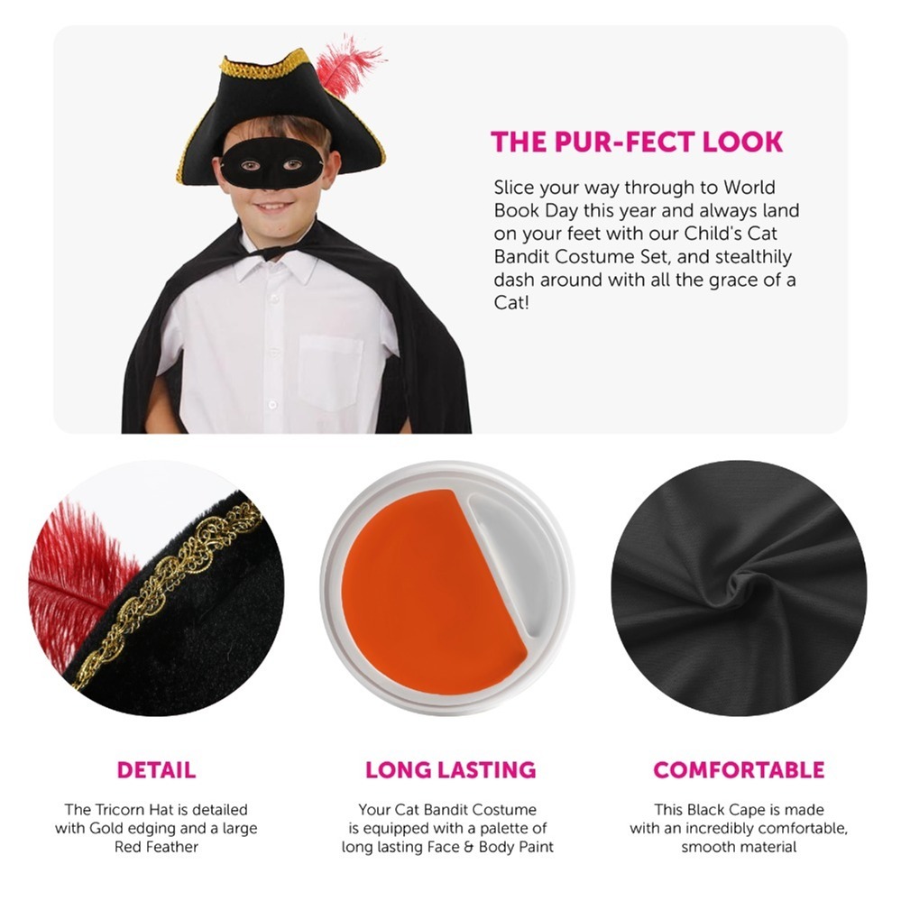 Child's Cat Bandit Costume | 6 Pcs | Cape, Hat, Black Mask, Sword, Boot Covers, Orange & White Face Paint £17.99