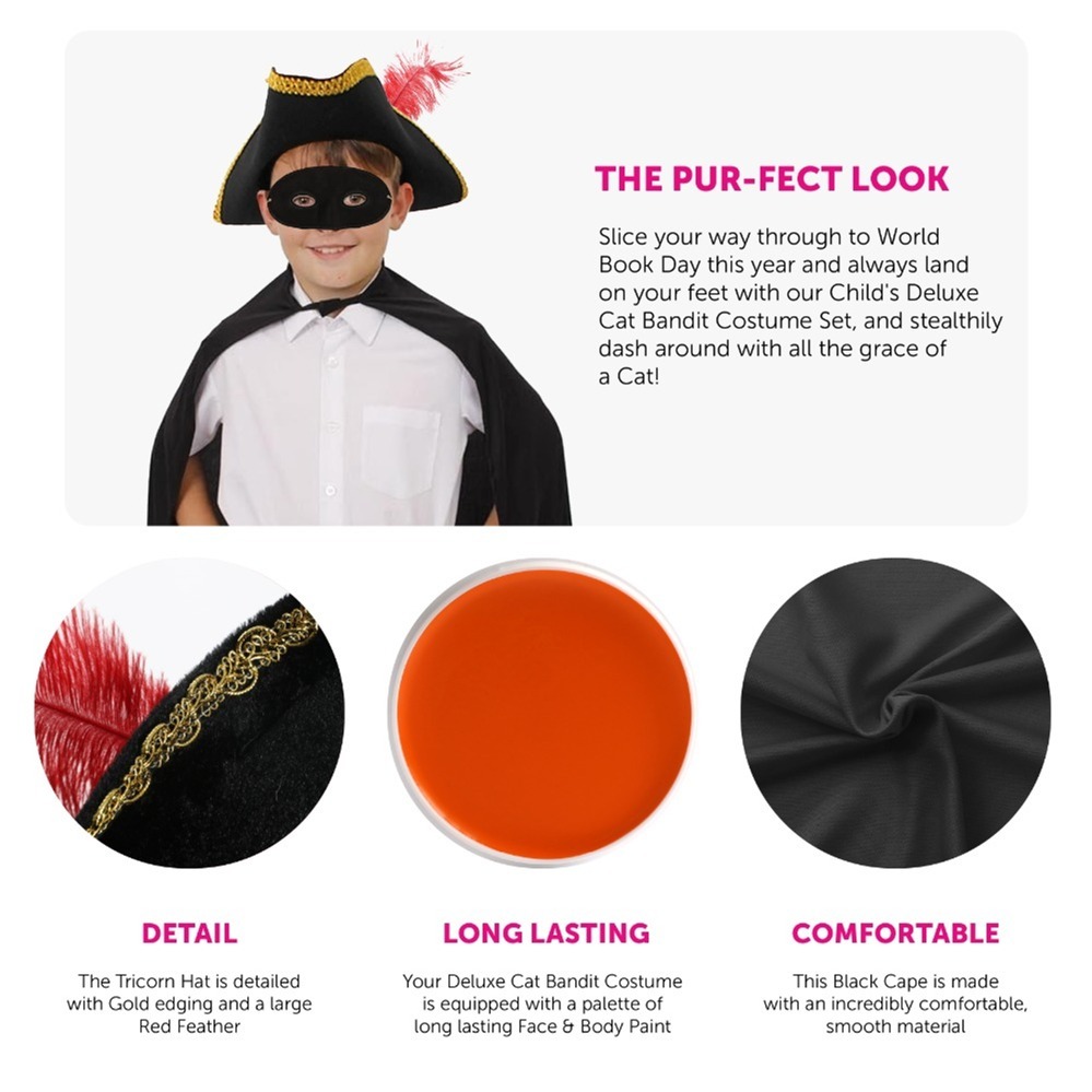 Child's Deluxe Cat Bandit Costume | 9 Pcs | Cape, Hat, Black Mask, Cat Mask, Gloves, Sword, Thin Tail, Boot Covers & Orange Face Paint