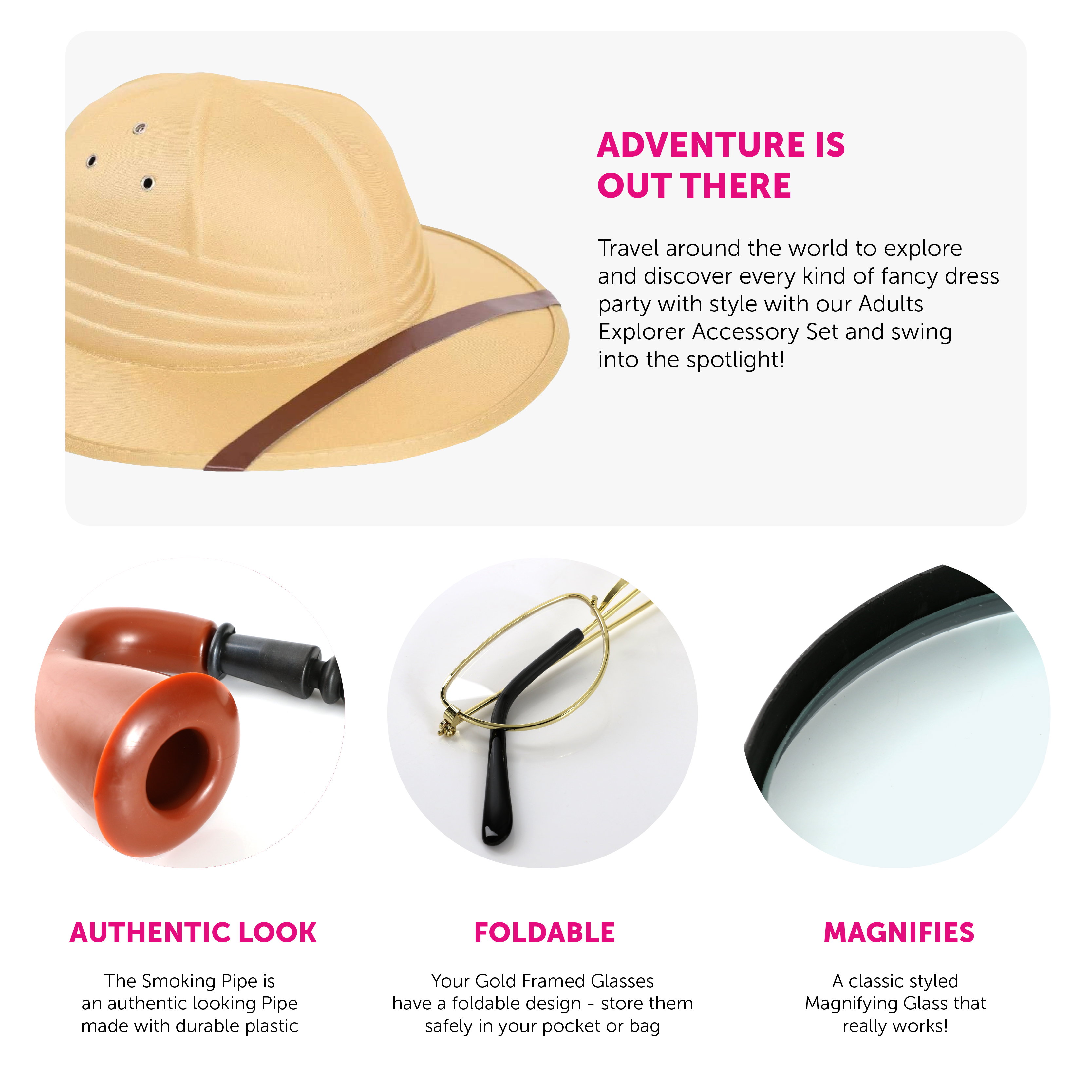 ACCESSORY SET INCLUDES: Your Adults Explorer Accessory Set includes a sandy coloured elasticated Explorer Hat, delicate Gold Framed Glasses with clear lenses, a Brown Plastic Smoking Pipe, a fully functioning Magnifying Glass with clear Glass, and an Adhesive Curled Black Moustache, the perfect accessories for your Costume!