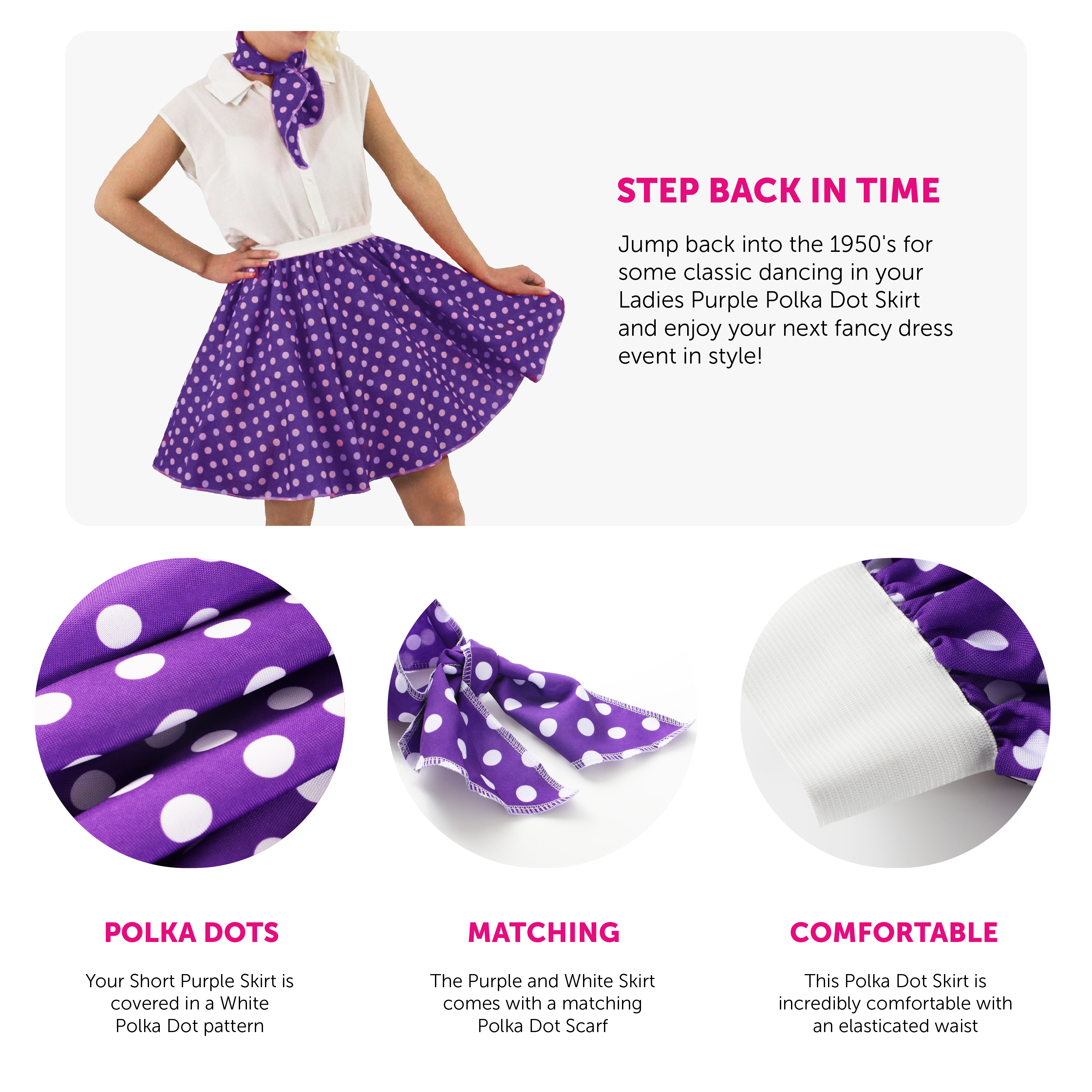 LADIES PURPLE POLKA DOT SKIRT: Jump back into the 1950's for some classic dancing in your Ladies Purple Polka Dot Skirt and enjoy your next fancy dress event in style!