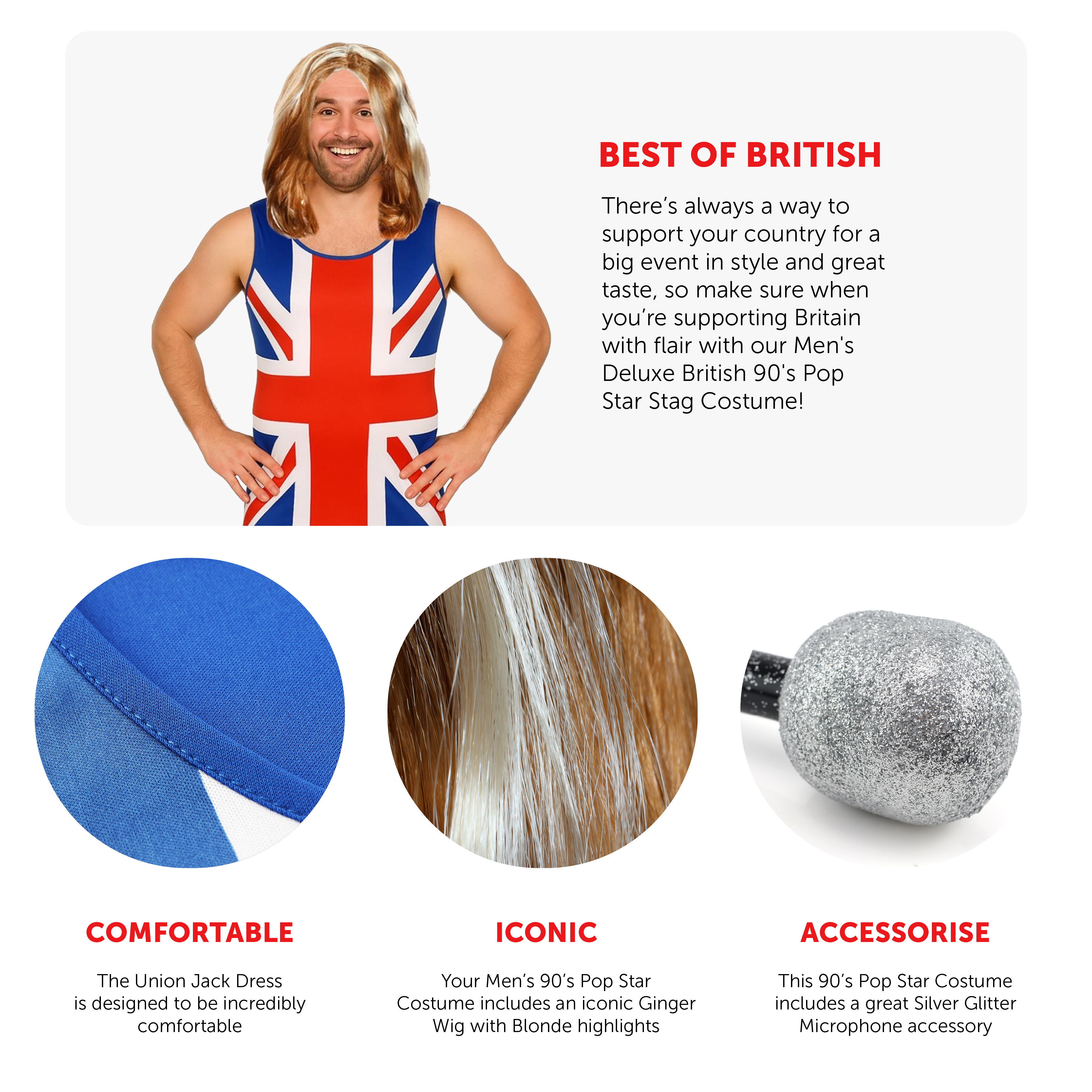 Men's Union Jack Stag Do Costume – Dress + 90s Ginger Wig, Microphone & Fishnet Tights Combo